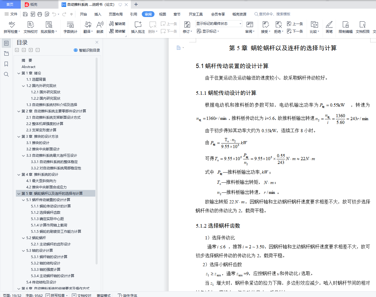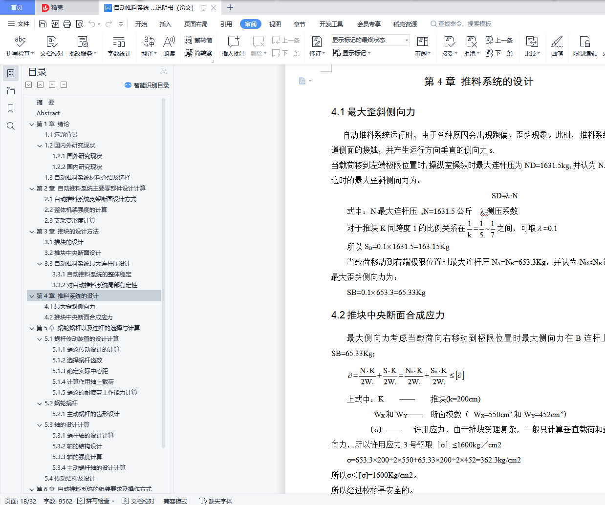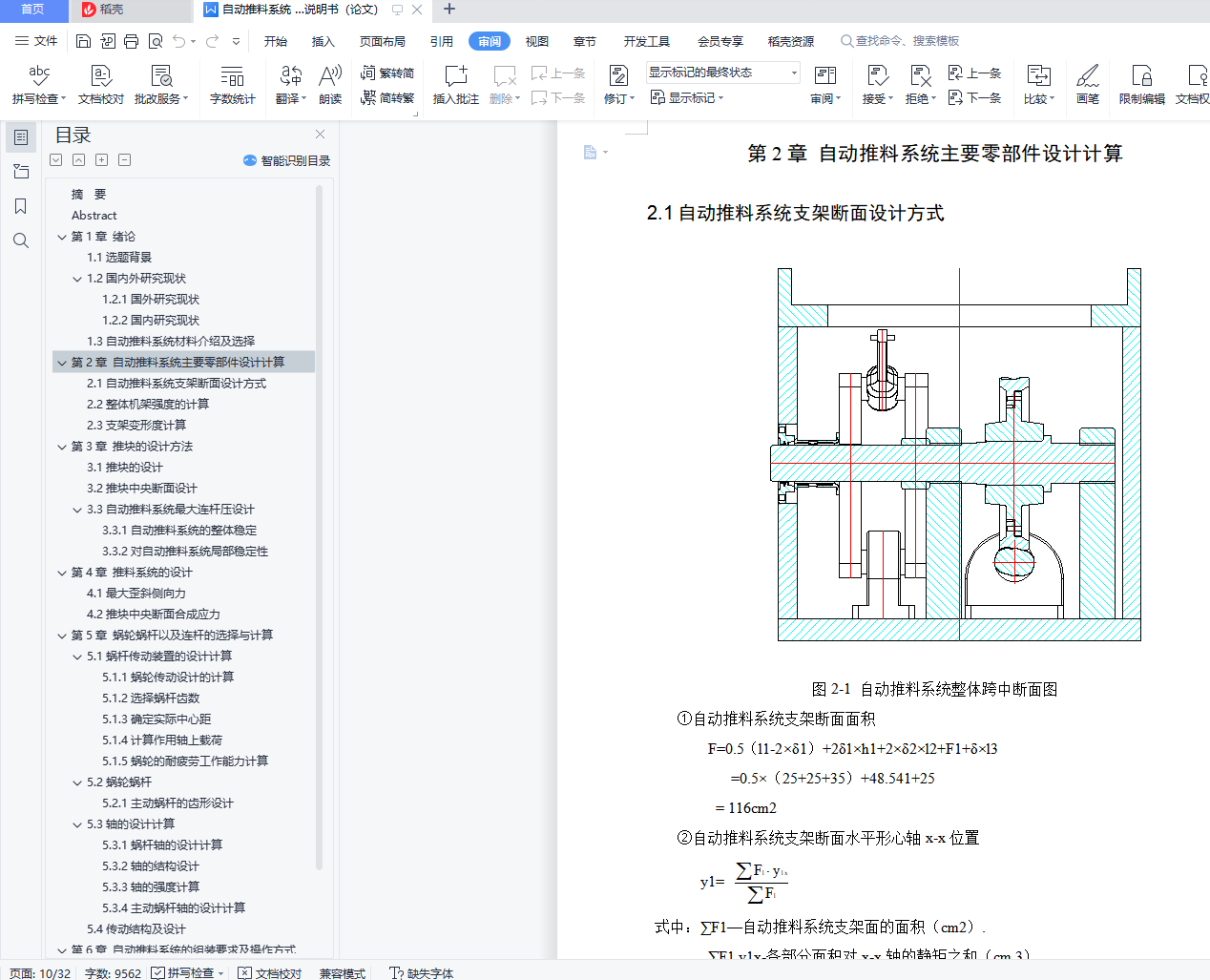 摘 要本毕业设计是一个自动推料系统执行机构与传动装置综合设计的设计。首先,自动推料系统执行机构与传动装置综合设计作了简单的概述;接着分析和自动推料系统执行机构与传动装置综合设计计算方法的选择原则;然后根据这些设计准则与计算基础的设计;然后检查变速装置的主要部件的选择。普通型自动推料系统执行机构与传动装置综合设计由六个主要部件组成:目前,自动推料系统执行机构与传动装置综合设计向长距离,高速度,低摩擦的方向发展,近年来,自动推料系统执行机构与传动装置综合设计就是其中的一个。在设计中,该自动推料系统执行机构与传动装置综合设计的研制与应用,目前我国与国外先进水平相比仍有较大差距,在过程中的国内设计和自动推料系统执行机构与传动装置综合设计的制造中存在着许多问题。自动推料系统执行机构与传动装置综合设计设计代表了设计的一般过程,对今后的设计工作的选择有一定的参考价值。关键词:自动推料系统;执行机构;传动装置;齿轮;涡轮蜗杆AbstractThis graduation design is a comprehensive design of actuator and drive device of automatic feeding system.First, the comprehensive design of the automatic feeding system actuator and drive is summarized briefly, then analyze and the selection principles of the calculation method of the comprehensive design of the automatic feeding system actuator and drive; then follow the design criteria and the design basis; then check the selection of the main components of the converter.The comprehensive design of actuator and transmission device of ordinary automatic feeding system consists of six main components: at present, the comprehensive design of actuator of automatic feeding system is developed in the direction of long distance, high speed and low friction. In recent years, the comprehensive design of actuator and transmission device of automatic feeding system is one of them.In the design, the development and application of the actuator and actuator are still a large gap compared with China and foreign advanced level, and there are many problems in the domestic design and actuator and transmission in the process.The comprehensive design design of the actuator and drive device of the automatic feeding system represents the general process of the design, and has a certain reference value for the selection of the future design work.Key words: automatic feeding system; actuator; drive device; gear; turbine worm目 录摘 要 IAbstract II第1章 绪论 11.1选题背景 11.2国内外研究现状 11.2.1国外研究现状 11.2.2国内研究现状 11.3自动推料系统材料介绍及选择 2第2章 自动推料系统主要零部件设计计算 62.1自动推料系统支架断面设计方式 62.2整体机架强度的计算 72.3支架变形度计算 9第3章 推块的设计方法 123.1推块的设计 123.2推块中央断面设计 123.3自动推料系统最大连杆压设计 133.3.1自动推料系统的整体稳定 133.3.2对自动推料系统局部稳定性 13第4章 推料系统的设计 144.1最大歪斜侧向力 144.2推块中央断面合成应力 14第5章 蜗轮蜗杆以及连杆的选择与计算 155.1蜗杆传动装置的设计计算 155.1.1蜗轮传动设计的计算 155.1.2选择蜗杆齿数 155.1.3确定实际中心距 175.1.4计算作用轴上载荷 175.1.5蜗轮的耐疲劳工作能力计算 185.2蜗轮蜗杆 185.2.1主动蜗杆的齿形设计 195.3轴的设计计算 205.3.1蜗杆轴的设计计算 205.3.2轴的结构设计 215.3.3轴的强度计算 215.3.4主动蜗杆轴的设计计算 225.4传动结构及设计 23第6章 自动推料系统的组装要求及操作方式 266.1自动推料系统的安装注意事项 266.2自动推料系统的试验要求 26致 谢 27参考文献 28