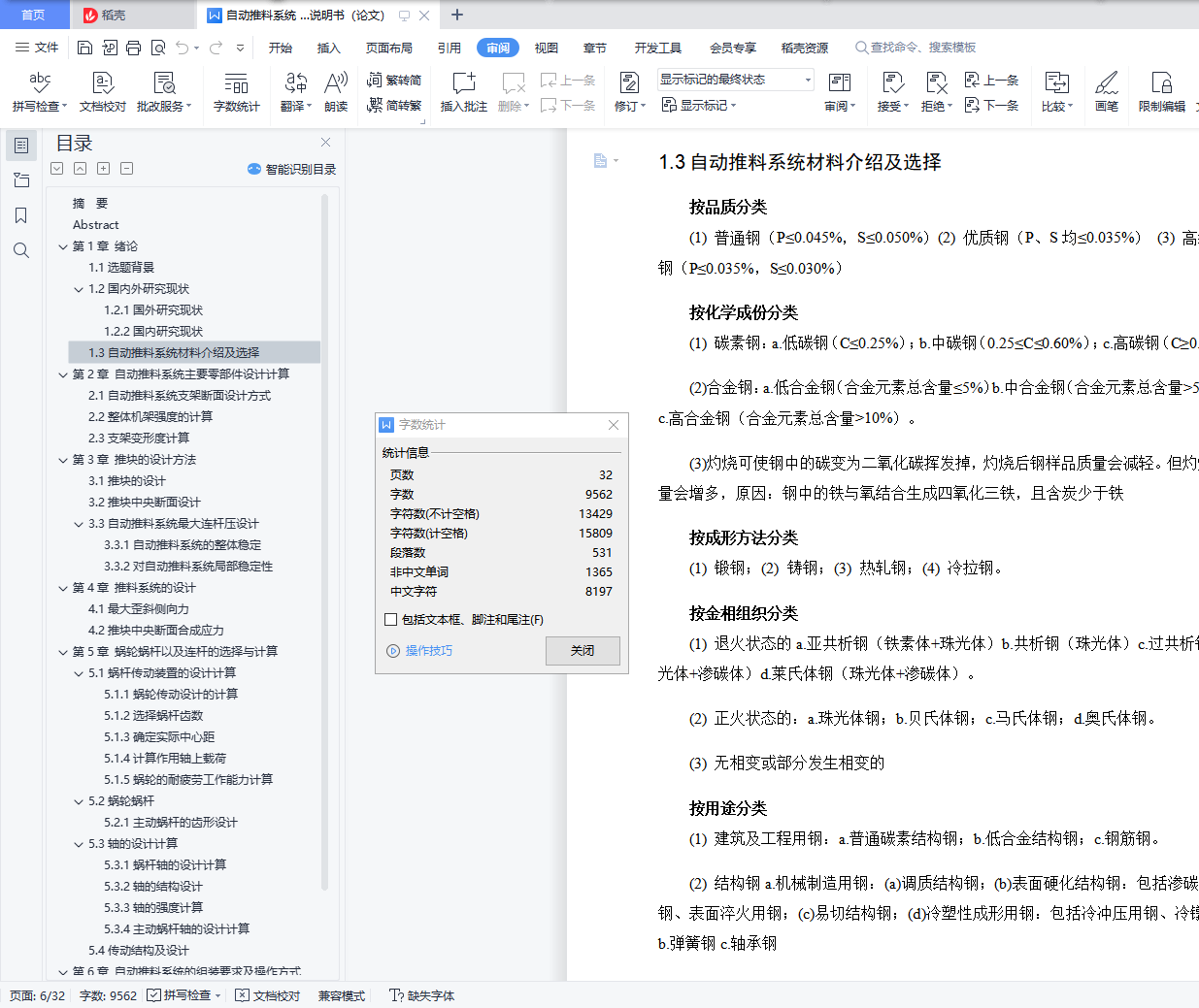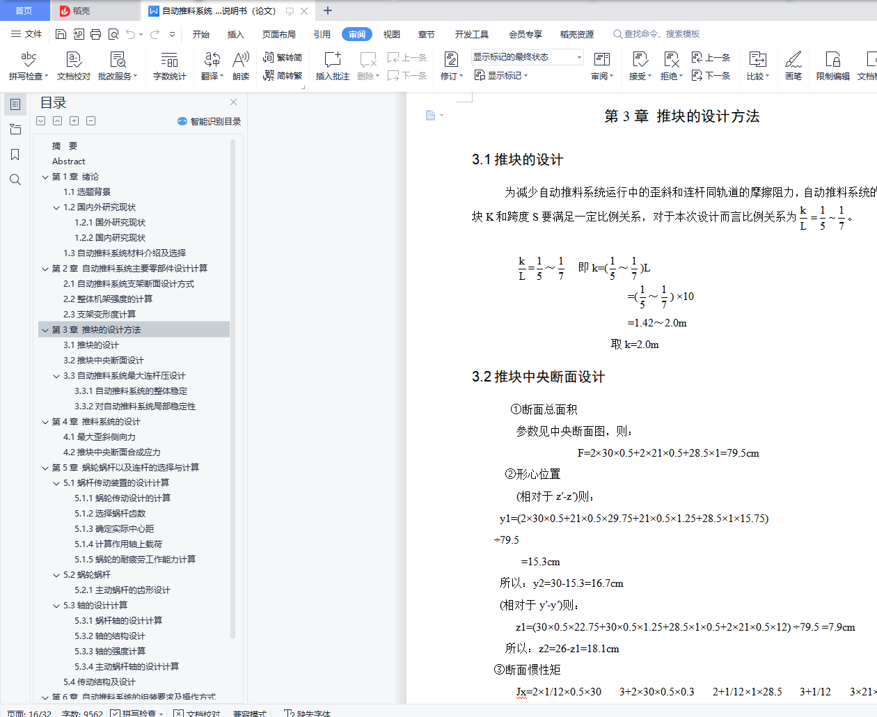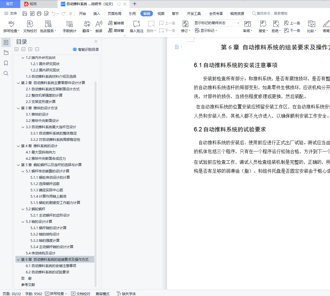 摘 要本毕业设计是一个自动推料系统执行机构与传动装置综合设计的设计。首先,自动推料系统执行机构与传动装置综合设计作了简单的概述;接着分析和自动推料系统执行机构与传动装置综合设计计算方法的选择原则;然后根据这些设计准则与计算基础的设计;然后检查变速装置的主要部件的选择。普通型自动推料系统执行机构与传动装置综合设计由六个主要部件组成:目前,自动推料系统执行机构与传动装置综合设计向长距离,高速度,低摩擦的方向发展,近年来,自动推料系统执行机构与传动装置综合设计就是其中的一个。在设计中,该自动推料系统执行机构与传动装置综合设计的研制与应用,目前我国与国外先进水平相比仍有较大差距,在过程中的国内设计和自动推料系统执行机构与传动装置综合设计的制造中存在着许多问题。自动推料系统执行机构与传动装置综合设计设计代表了设计的一般过程,对今后的设计工作的选择有一定的参考价值。关键词:自动推料系统;执行机构;传动装置;齿轮;涡轮蜗杆AbstractThis graduation design is a comprehensive design of actuator and drive device of automatic feeding system.First, the comprehensive design of the automatic feeding system actuator and drive is summarized briefly, then analyze and the selection principles of the calculation method of the comprehensive design of the automatic feeding system actuator and drive; then follow the design criteria and the design basis; then check the selection of the main components of the converter.The comprehensive design of actuator and transmission device of ordinary automatic feeding system consists of six main components: at present, the comprehensive design of actuator of automatic feeding system is developed in the direction of long distance, high speed and low friction. In recent years, the comprehensive design of actuator and transmission device of automatic feeding system is one of them.In the design, the development and application of the actuator and actuator are still a large gap compared with China and foreign advanced level, and there are many problems in the domestic design and actuator and transmission in the process.The comprehensive design design of the actuator and drive device of the automatic feeding system represents the general process of the design, and has a certain reference value for the selection of the future design work.Key words: automatic feeding system; actuator; drive device; gear; turbine worm目 录摘 要 IAbstract II第1章 绪论 11.1选题背景 11.2国内外研究现状 11.2.1国外研究现状 11.2.2国内研究现状 11.3自动推料系统材料介绍及选择 2第2章 自动推料系统主要零部件设计计算 62.1自动推料系统支架断面设计方式 62.2整体机架强度的计算 72.3支架变形度计算 9第3章 推块的设计方法 123.1推块的设计 123.2推块中央断面设计 123.3自动推料系统最大连杆压设计 133.3.1自动推料系统的整体稳定 133.3.2对自动推料系统局部稳定性 13第4章 推料系统的设计 144.1最大歪斜侧向力 144.2推块中央断面合成应力 14第5章 蜗轮蜗杆以及连杆的选择与计算 155.1蜗杆传动装置的设计计算 155.1.1蜗轮传动设计的计算 155.1.2选择蜗杆齿数 155.1.3确定实际中心距 175.1.4计算作用轴上载荷 175.1.5蜗轮的耐疲劳工作能力计算 185.2蜗轮蜗杆 185.2.1主动蜗杆的齿形设计 195.3轴的设计计算 205.3.1蜗杆轴的设计计算 205.3.2轴的结构设计 215.3.3轴的强度计算 215.3.4主动蜗杆轴的设计计算 225.4传动结构及设计 23第6章 自动推料系统的组装要求及操作方式 266.1自动推料系统的安装注意事项 266.2自动推料系统的试验要求 26致 谢 27参考文献 28