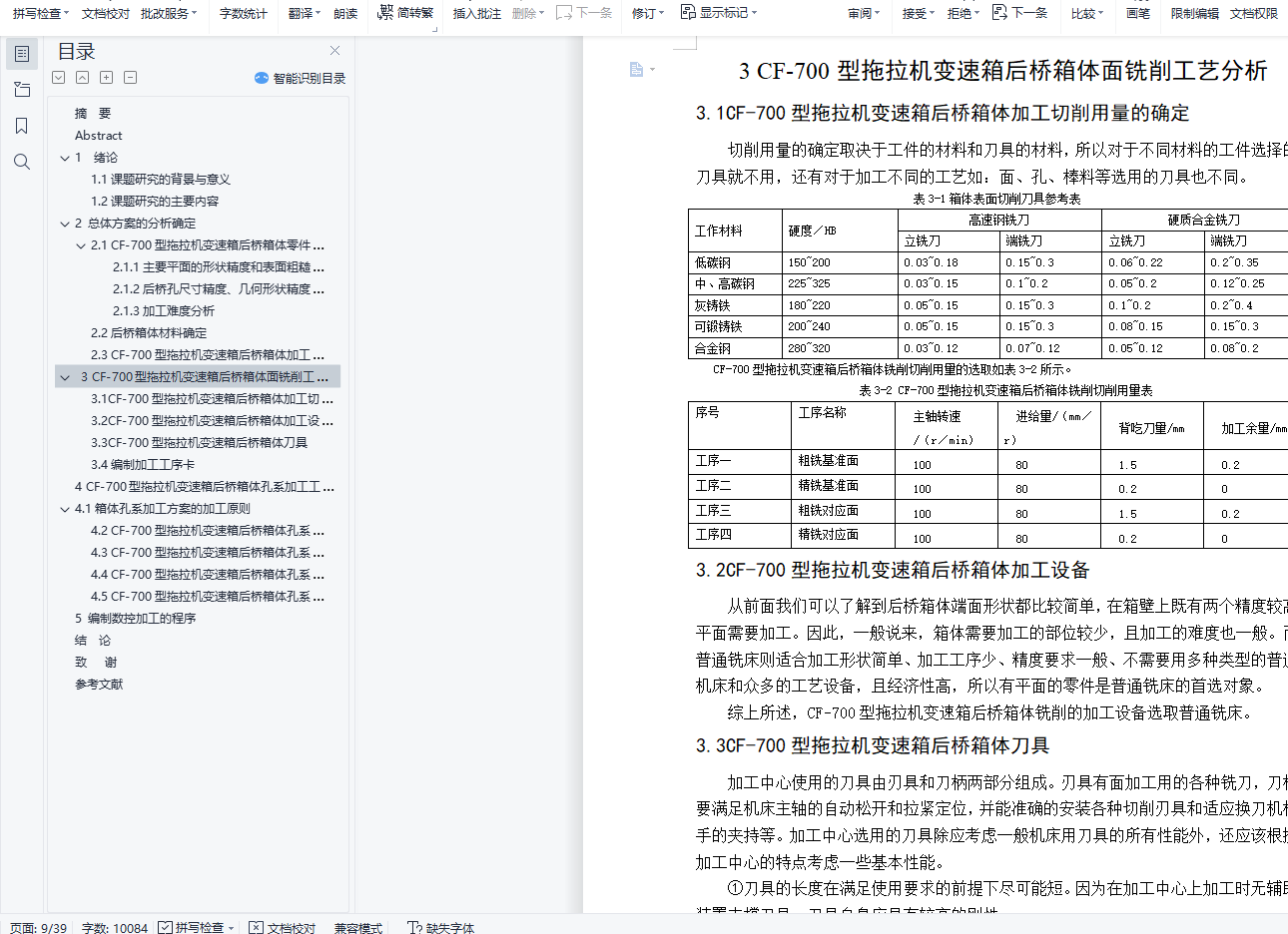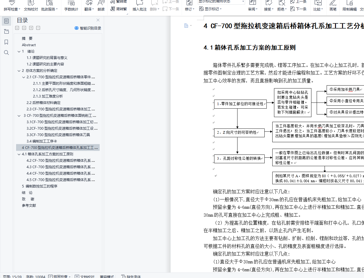 摘 要箱体零件是机器及其部件的基础零件,它决定了部件中各组件和零件的相互位置,并使其能协调发运动,因而箱体零件的精度对箱体部件装配后的精度有决定性影响。对于后桥箱的复杂性和多样性,所以先要在平口钳的装夹下加工其基准面,加工完后二次装夹,以基准面为基准,进行打标控制在一定范围内进行装夹加工其对应面。拖拉机后桥箱体后桥箱体的实际结构形状比较复杂、不但有平面还有孔的加工,而且箱体零件中孔的位置精度要求较高,且形状复杂,壁薄且不均匀,内部呈腔形,加工部位多,加工难度大,既有精度要求较高的孔系和平面,也有许多许多精度要求较低的紧固孔。因此,一般中型机床制造厂用于箱体类零件的机械加工劳动量约占整个产品加工量的15%-20%。本次设计从保证零件加工质量的角度出发,主要分析了箱体零件中孔的加工工艺对于孔径较小且较为规则的孔我们通常采用点孔、钻孔、扩孔、铰,对于孔径较大且为不规则的孔我们通常采用点孔、钻孔、扩孔、粗精镗孔等方案。以及采用Siemens 840D系统进行数控编程。关键词:基准面;拖拉机后桥箱体;加工中心;孔;工艺;程序AbstractThe box parts is the foundation of machine parts and components, which determines the mutual position of parts in the assembly and parts, and the coordinated movement, thus the precision of parts have a decisive impact on the cabinet after the assembly of precision components.Tractor rear axle box after box shape bridge actual structure more complex, not only have the plane and the machining of the hole, and the hole position accuracy in the body part of the demand is higher, and the complex shape, thin wall and uneven, the internal cavity shape, machining parts, processing difficulty is big, has not only high precision holes and the plane, there are many many fastener holes for low accuracy. Therefore, medium-sized general machine tool manufacturing plant for the machining of the amount of labor of box parts about the processing amount of the whole product 15%-20%.This design is from the guarantee machining quality point of view, the main analysis of the process in the body part hole for aperture is small and regular hole we usually use point hole, drilling, reaming, reaming, the aperture is large and irregular holes we usually use point hole, drilling, reaming, coarse and fine boring such schemes. And the use of Siemens 840D system for NC programming.Keywords: tractor rear axle box CNC machining center hole process procedure目录摘 要 11 绪论 41.1课题研究的背景与意义 41.2课题研究的主要内容 52 总体方案的分析确定 62.1 CF-700型拖拉机变速箱后桥箱体零件图分析 62.1.1主要平面的形状精度和表面粗糙度 62.1.2后桥孔尺寸精度、几何形状精度和表面粗糙度 62.1.3加工难度分析 62.2后桥箱体材料确定 72.3 CF-700型拖拉机变速箱后桥箱体加工方案的确定 73 CF-700型拖拉机变速箱后桥箱体面铣削工艺分析 83.1CF-700型拖拉机变速箱后桥箱体加工切削用量的确定 83.2CF-700型拖拉机变速箱后桥箱体加工设备 83.3CF-700型拖拉机变速箱后桥箱体刀具 83.4编制加工工序卡 94 CF-700型拖拉机变速箱后桥箱体孔系加工工艺分析 144.1箱体孔系加工方案的加工原则 144.2 CF-700型拖拉机变速箱后桥箱体孔系加工方案的确定 164.3 CF-700型拖拉机变速箱后桥箱体孔系加工设备的选取 194.4 CF-700型拖拉机变速箱后桥箱体孔系刀具的选取 194.5 CF-700型拖拉机变速箱后桥箱体孔系夹具的确定 215 编制数控加工的程序 23结 论 24致 谢 25参考文献 26附录A 27