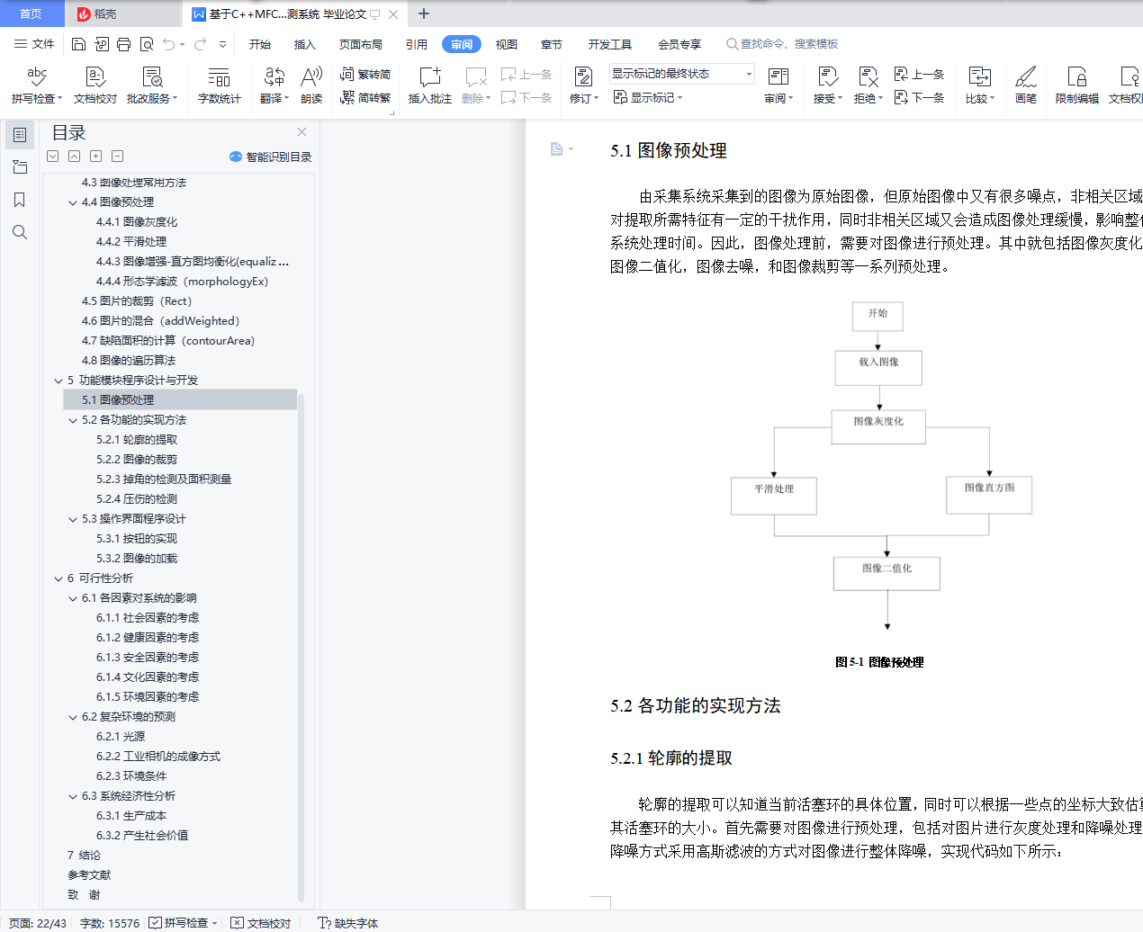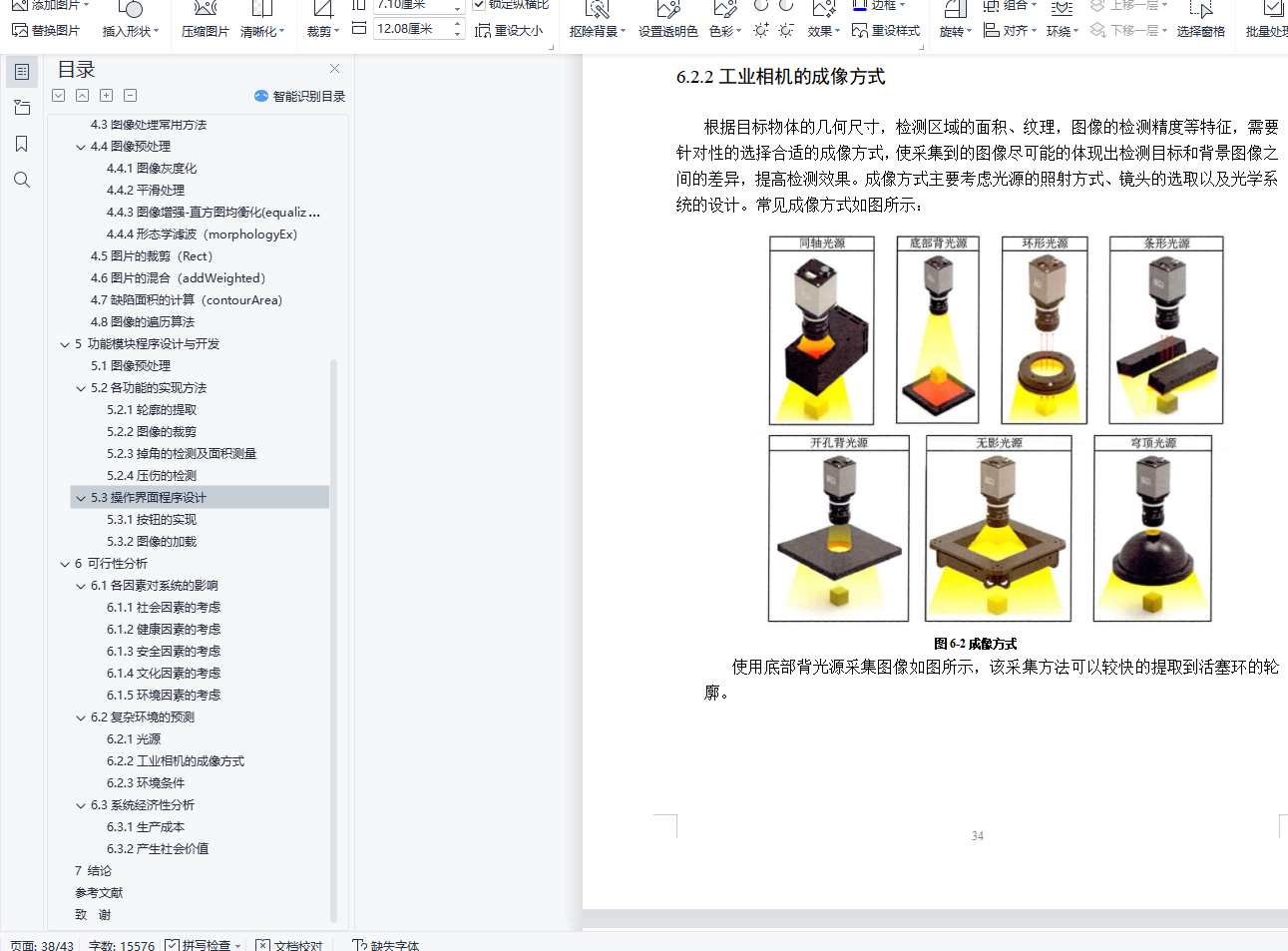 摘 要产品质量是企业永恒的主题,是企业得以生存发展最重要的条件。活塞环是一种嵌入活塞槽沟内部与气缸壁贴合上下运动的金属环。活塞环的生产加工流程繁琐,活塞环在生产与流转过程中可能产生多种外观表面缺陷,这些缺陷将不同程度影响发动机的工作效率。针对金属环成形尺寸误差和外形缺陷,使用人工抽检效率低,不能对全部工件进行检测,存在大量未检出残次品的问题。产品的数字化自动检测有益于提高企业效益、提升市场竞争力。本文研究了一种基于 OpenCV的金属成形工件尺寸与外形缺陷检测的方案,旨在基于活塞环表面缺陷检测需求,通过数据采集与分析,软件开发与算法编程,实现了活塞环几种典型缺陷的检测。因此活塞环表面缺陷的自动化检测具有总要的研究意义与实际开发价值。关键词:活塞环,缺陷,OpenCV,算法编程,缺陷检测ABSTRACTProduct quality is the eternal theme of an enterprise and the most important condition for its survival and development. Piston ring is a kind of metal ring which is embedded in the groove of piston and fits up and down with the cylinder wall. The production and processing of piston rings are cumbersome. During the production and circulation of piston rings, many kinds of surface defects may occur, which will affect the working efficiency of engines to varying degrees. Aiming at the dimension error and shape defect of metal ring forming, manual sampling inspection is inefficient, and can not detect all the workpieces. There are many problems of undetected defective products. Digital automatic detection of products is beneficial to improve the efficiency of enterprises and market competitiveness. Therefore, the automatic detection of piston ring surface defects has important research significance and practical development value. This paper studies a method of metal forming workpiece size and shape defect detection based on OpenCV, aiming at realizing several typical defect detection of piston rings through data acquisition and analysis, software development and arithmetic programming based on the requirement of surface defect detection of piston rings. Through learning to improve understanding and analysis of problems, experimental design, image processing programming skills, engineering design practice ability.key words: piston ring, defect, OpenCV, algorithmic programming, defect detection目 录1 绪论 11.1 课题研究背景和意义 11.2国内外研究现状和发展 21.3研究内容 22 活塞环生产过程介绍与缺陷分析 42.1活塞环工作原理 42.2活塞环的的加工特点 52.3活塞环工艺过程介绍 62.4活塞环缺陷形成原因 63 机器视觉系统的工作原理与组成 83.1机器视觉工作原理 83.2机器视觉系统组成 84 图像处理介绍与缺陷分析 104.1对活塞环缺陷特征的简单分析 104.2图像二值化 104.3图像处理常用方法 114.4图像预处理 124.4.1图像灰度化 124.4.2平滑处理 124.4.3图像增强-直方图均衡化(equalizeHist) 144.4.4形态学滤波(morphologyEx) 154.5图片的裁剪(Rect) 164.6图片的混合(addWeighted) 164.7缺陷面积的计算(contourArea) 174.8图像的遍历算法 175 功能模块程序设计与开发 185.1图像预处理 185.2各功能的实现方法 185.2.1轮廓的提取 185.2.2图像的裁剪 205.2.3掉角的检测及面积测量 215.2.4压伤的检测 275.3操作界面程序设计 295.3.1按钮的实现 305.3.2图像的加载 306 可行性分析 326.1各因素对系统的影响 326.1.1社会因素的考虑 326.1.2健康因素的考虑 326.1.3安全因素的考虑 336.1.4文化因素的考虑 336.1.5环境因素的考虑 336.2复杂环境的预测 336.2.1光源 336.2.2工业相机的成像方式 346.2.3环境条件 356.3系统经济性分析 356.3.1生产成本 356.3.2产生社会价值 367 结论 37参考文献 38致 谢 39