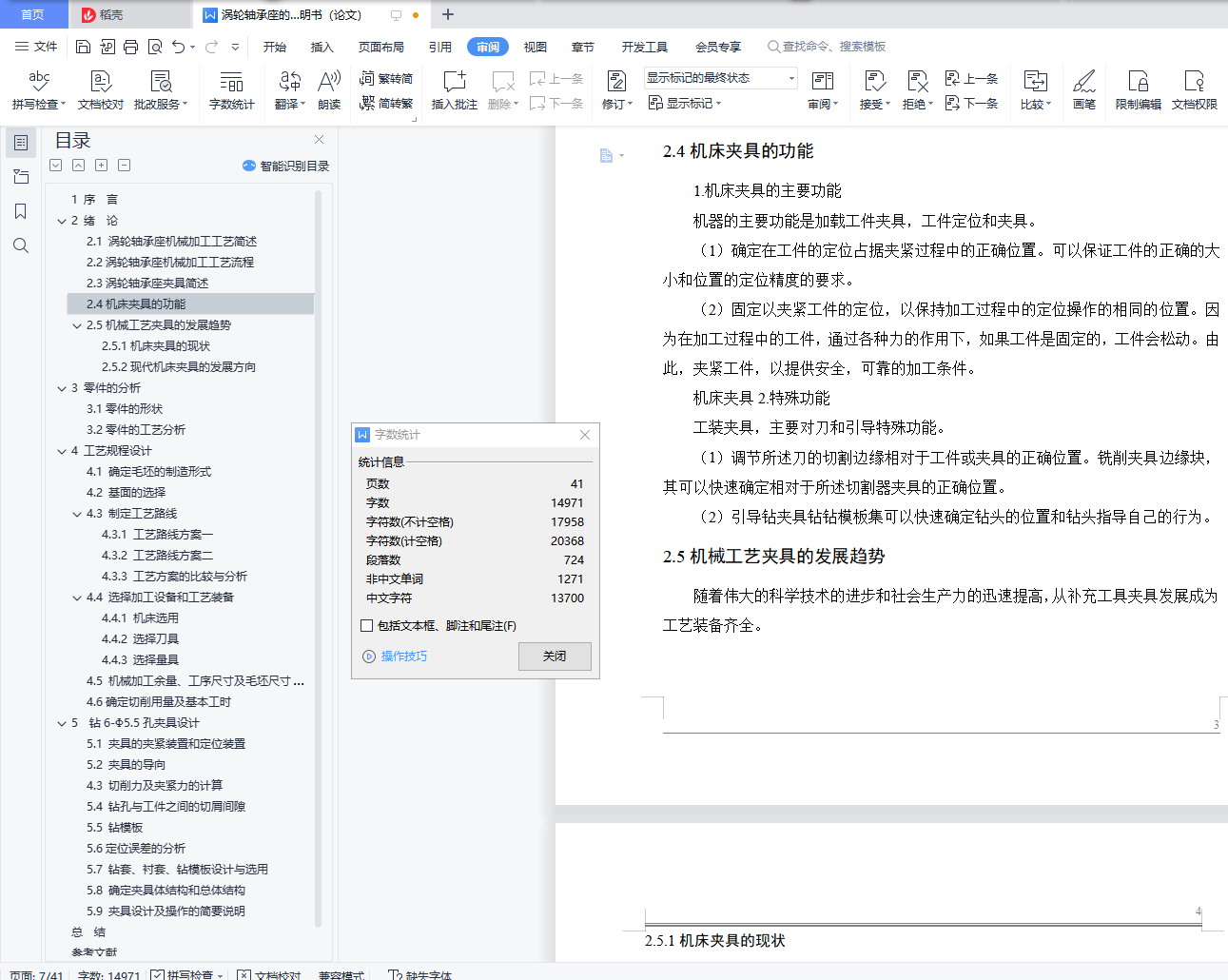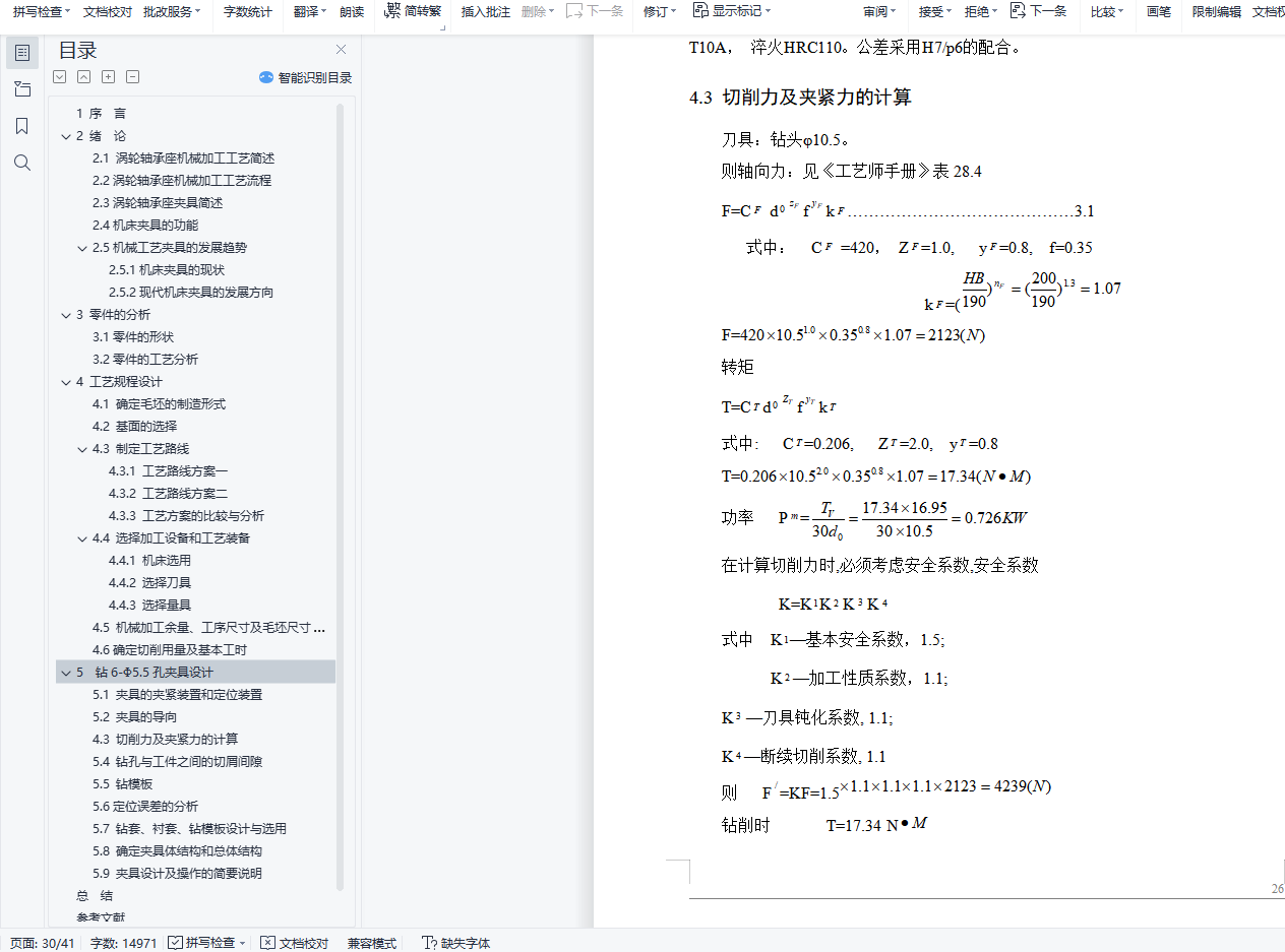 涡轮轴承座的机械加工工艺规程及专用夹具的设计摘要:零件加工工艺及钻床夹具设计是包括零件加工的工艺设计、工序设计以及专用夹具的设计三部分。在工艺设计中要首先对零件进行分析,了解零件的工艺再设计出毛坯的结构,并选择好零件的加工基准,设计出零件的工艺路线;接着对零件各个工步的工序进行尺寸计算,关键是决定出各个工序的工艺装备及切削用量;然后进行专用夹具的设计,选择设计出夹具的各个组成部件,如定位元件、夹紧元件、引导元件、夹具体与机床的连接部件以及其它部件;计算出夹具定位时产生的定位误差,分析夹具结构的合理性与不足之处,并在以后设计中注意改进。关键词:工艺,工序,切削用量,夹紧,定位,误差The design of mechanical machining turbine bearing seat and special fixtureAbstract:The fixture design of a certain type of motor armature bracket parts processing and drilling machine is design process design, including the parts processing process design and the three part special fixture. In the process of design should first of all parts to analyze, understand parts of the process and then design a blank structure, and choose the good parts of the machining datum, designs the process routes of the parts; then the parts each step process dimension calculation, the key is to determine the process equipment and cutting the amount of each working procedure design; then a special fixture, fixture for the various components of a design, such as the connecting part positioning device, clamping element, a guide element, clamp and the machine tool and other components; the positioning error caused calculate fixture when positioning, analysis of the rationality and deficiency of fixture structure, pay attention to improving and will design in.Keywords: process, process, cutting, clamping, positioning,目 录1 序 言 12 绪 论 22.1 涡轮轴承座机械加工工艺简述 22.2涡轮轴承座机械加工工艺流程 22.3涡轮轴承座夹具简述 32.4机床夹具的功能 32.5机械工艺夹具的发展趋势 32.5.1机床夹具的现状 42.5.2现代机床夹具的发展方向 43 零件的分析 53.1零件的形状 53.2零件的工艺分析 54 工艺规程设计 74.1 确定毛坯的制造形式 74.2 基面的选择 74.3 制定工艺路线 84.3.1 工艺路线方案一 84.3.2 工艺路线方案二 84.3.3 工艺方案的比较与分析 94.4 选择加工设备和工艺装备 104.4.1 机床选用 104.4.2 选择刀具 104.4.3 选择量具 104.5 机械加工余量、工序尺寸及毛坯尺寸的确定 104.6确定切削用量及基本工时 125 钻6-Φ5.5孔夹具设计 235.1 夹具的夹紧装置和定位装置 235.2 夹具的导向 244.3 切削力及夹紧力的计算 255.4 钻孔与工件之间的切屑间隙 275.5 钻模板 285.6定位误差的分析 285.7 钻套、衬套、钻模板设计与选用 295.8 确定夹具体结构和总体结构 305.9 夹具设计及操作的简要说明 31总结 32参考文献 33致谢 34