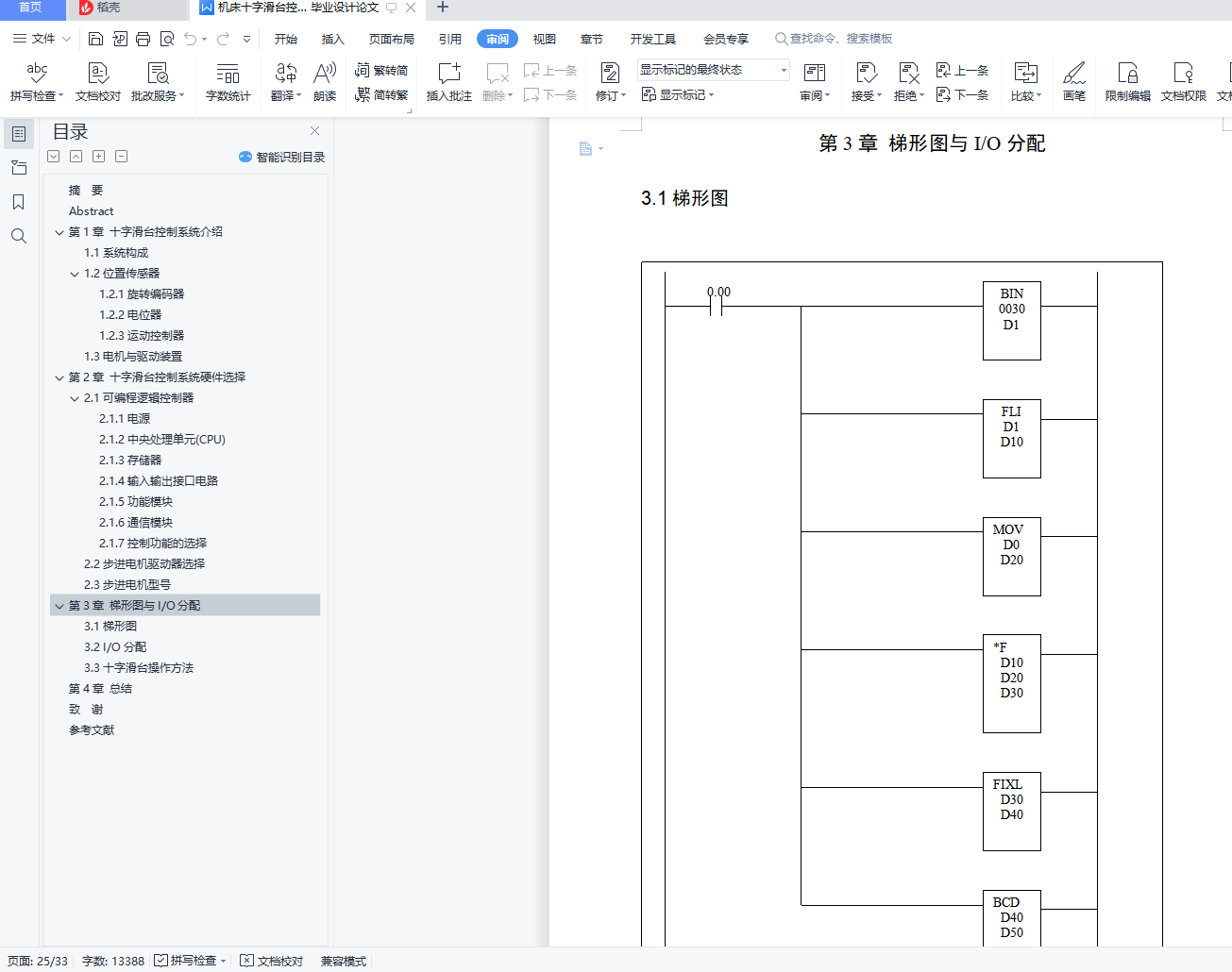摘 要为进一步提高普通机床工作台的进给精度,结合十字滑台机械机构,设计了基于伺服电机、PLC和MCGS触摸屏为核心的机床加工设备进给控制系统。通过该系统硬件与软件设计,实现了对十字滑台有效控制。利用触摸屏在线修改工作台运行参数,能满足多种材料工件的加工要求,提升加工效率。实际加工运行表明,该控制系统完全能达到设备生产加工精度需求,具有推广价值。提出将PLC控制步进电机和伺服电机应用到对十字滑台XY轴两个运动方向的控制,由于步进电机和伺服电机控制精度高,可实现精确定位,使得十字滑台的工作效率和质量得到提高,并满足现代化工艺发展的要求。构建PLC、步进电机控制系统、伺服电机控制系统,将PLC控制步进电机和伺服电机实际应用到十字滑台控制中。本文主要进行欧姆龙的CP1H可编程序控制器的十字滑台控制系统的设计,主要内容有十字滑台控制系统介绍、十字滑台控制系统硬件选择、梯形图与I/O分配。通过对各种控制方法的对比进行选择了用可编程序控制器来控制步进电机,以达到十字滑台的工作效果。关键字:机床;步进电机;十字滑台;XY轴;PLCAbstractIn order to further improve the feed accuracy of the ordinary machine tool workbench, the machine tool processing equipment feed control system based on servo motor, PLC and MCGS touch screen is designed.Through the system hardware and software design, the effective control of the cross slide platform is realized.Using the touch screen to modify the workbench operation parameters online, it can meet the processing requirements of a variety of material workparts, and improve the processing efficiency.The actual processing operation shows that the control system can fully meet the demand of production and processing precision of equipment and has promotion value.It is proposed that PLC control stepping motor and servo motor are applied to the motion direction of XY axis of cross slide platform. Due to the high control precision of stepping motor and servo motor, precise positioning can be realized, the working efficiency and quality of cross slide platform can be improved, and the requirements of modern process development are met.Build the PLC, the step motor control system and the servo motor control system, and actually apply the PLC control step motor and the servo motor to the cross-slide table control.This paper mainly conducts the design of the cross slide control system of OmCP1H programmable controller, including cross slide control system introduction, cross slide control system hardware selection, ladder diagram and I / O allocation.Select the comparison of various control methods to control the stepping motor for the cross slide.Keywords: machine tool; stepping motor; cross slide table; XY axis; PLC目 录摘 要 IAbstract II第1章 十字滑台控制系统介绍 11.1系统构成 11.2位置传感器 11.2.1旋转编码器 21.2.2电位器 31.2.3运动控制器 31.3电机与驱动装置 5第2章 十字滑台控制系统硬件选择 62.1可编程逻辑控制器 62.1.1电源 62.1.2中央处理单元(CPU) 62.1.3存储器 72.1.4输入输出接口电路 72.1.5功能模块 72.1.6通信模块 72.1.7控制功能的选择 102.2步进电机驱动器选择 142.3步进电机型号 19第3章 梯形图与I/O分配 213.1梯形图 213.2 I/O分配 253.3十字滑台操作方法 26第4章 总结 27致 谢 28参考文献 29