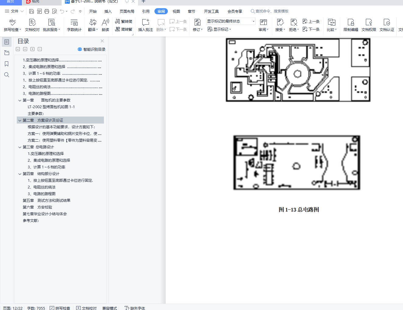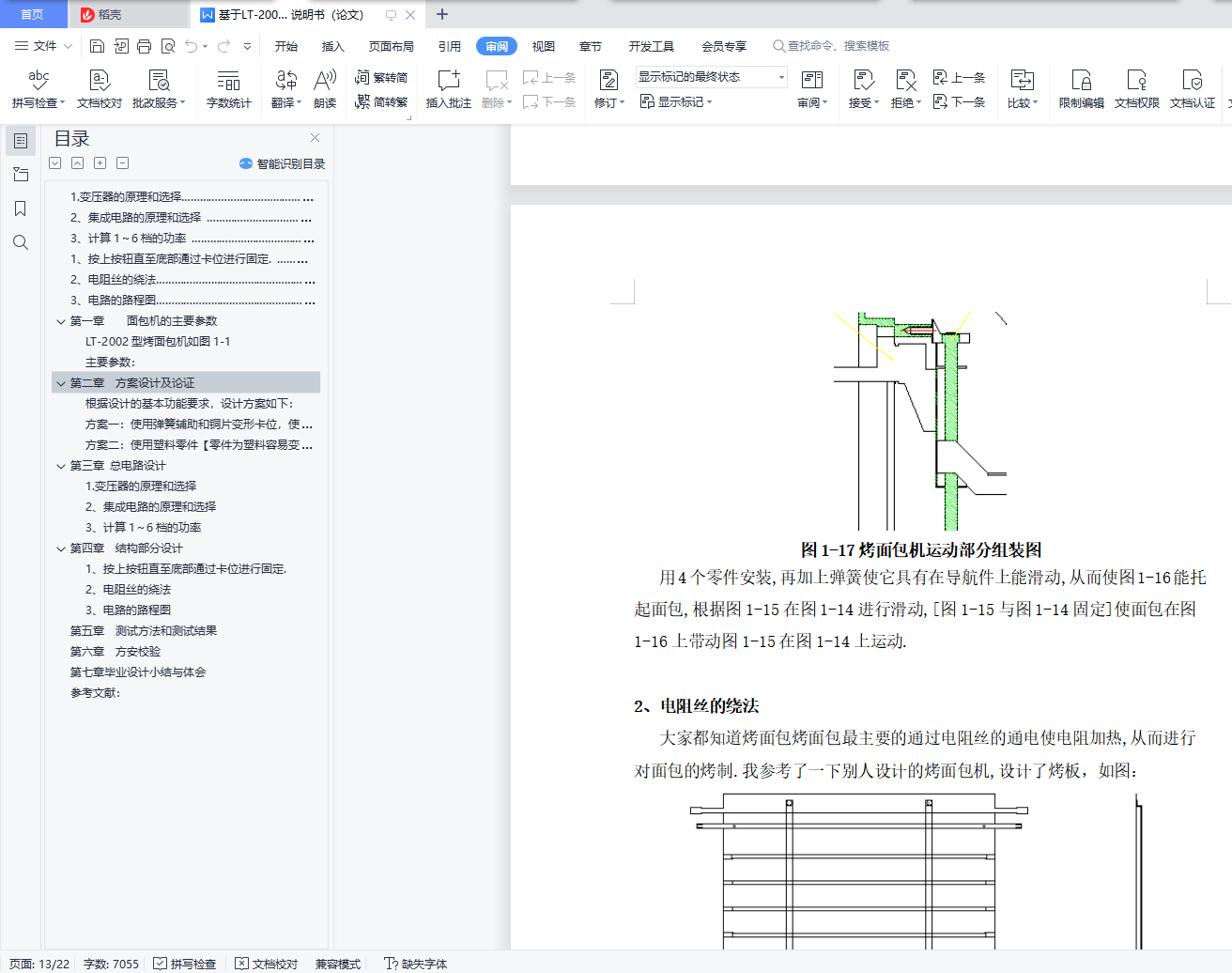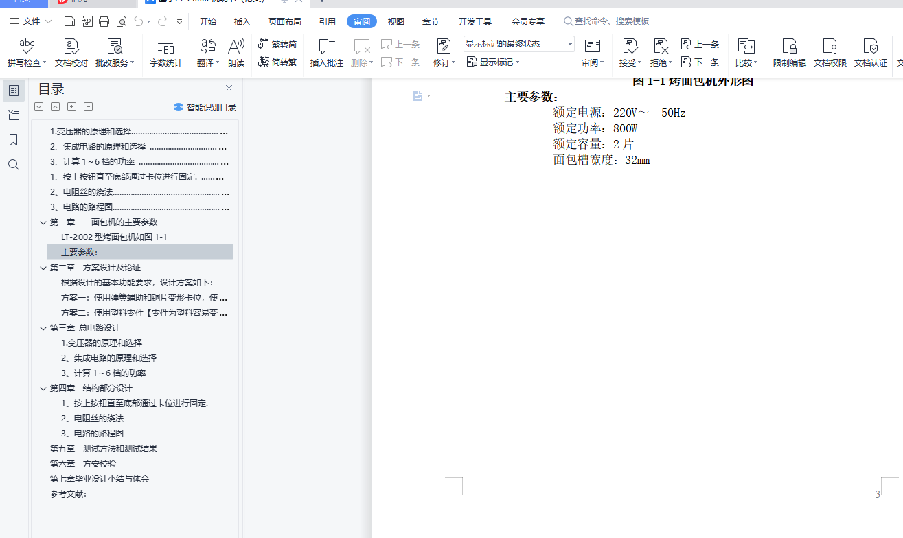 摘 要随着生活质量的提高,人们越来越注重自己的身体,早上起来后一定要吃点东西来补充一下人体的肌能,由于一些人懒得做早餐,所以厂家就看中了这种商机,研究出了烤面包机为人们服务起着很重要的作用。本课题主要研究烤面包的设计过程以及基本的使用方法。烤面包的机的设计主要是通过烤面包机的电路设计和结构设计来完成的。首先,为了人们能够安全并放心的使用此产品,通过精心的设计和计算,设计出了一套安全的电路图以及相应的实体;其次,为了让人们能熟练的使用,我门还介绍了烤面包机的基本结构设计和使用方法,了解了烤面包机的内部构造可以更好的使用烤面包机。本产品是经过严格的实体测试和校验的,大家可以放心使用。关键词: 烤面包机;电路设计;结构设计;测试;校验目 录第一章 面包机的主要参数 …………………………………………………………(1)第二章 方案设计和论证 ………………………………………………………………(2)第三章 总电路设计 ………………………………………………………………(4)1.变压器的原理和选择…………………………………………………………………(4)2、集成电路的原理和选择 ……………………………………………………………(5)3、计算1~6档的功率 …………………………………………………………………(6)第四章 结构部分设计 ……………………………………………………………(11)1、按上按钮直至底部通过卡位进行固定. …………………………………………(11)2、电阻丝的绕法………………………………………………………………………(12)3、电路的路程图………………………………………………………………………(12)第五章 测试方法和测试结果 …………………………………………………………(14)1、电测法和非电测法 …………………………………………………………………(14)2、静态测量和动态测量 ………………………………………………………………(15)3、直接测量和间接测量 ………………………………………………………………(15)4、接触测量和非接触测量 ……………………………………………………………(15)5、绝对测量和相对测量 ………………………………………………………………(15)6、离线测量和在线测量 ………………………………………………………………(15)测试方法我用3准备分2步 ……………………………………………………………(16)1、电流表电压表进行各个部件的测试 ………………………………………………(16)2、测试结果后用计算得结果 …………………………………………………………(16)第六章 方案校验 ……………… …………………………………………………(18)第七章 毕业设计小结与体会 ………………………………………………………(29)参考文献 ……………………………………………………………………………(20)