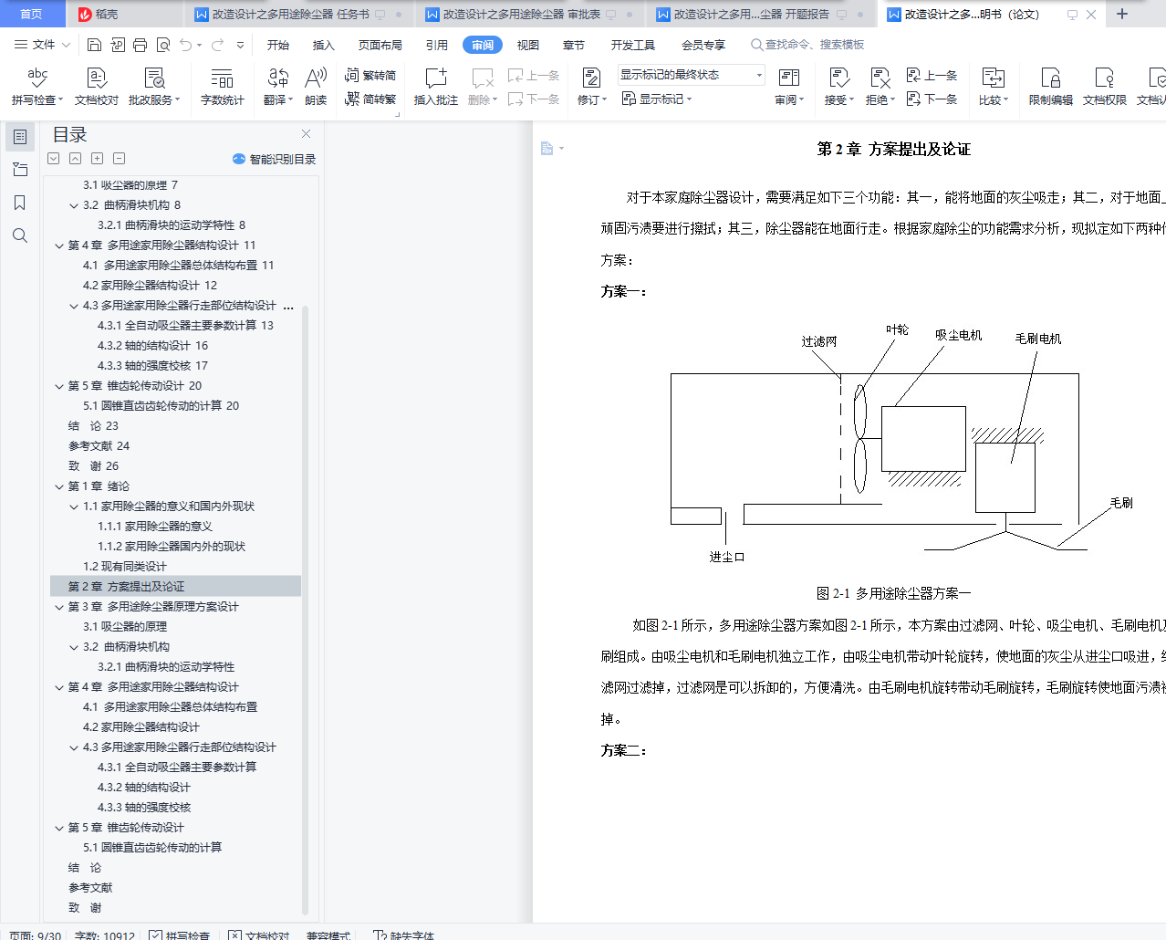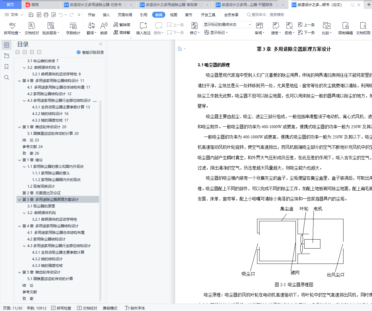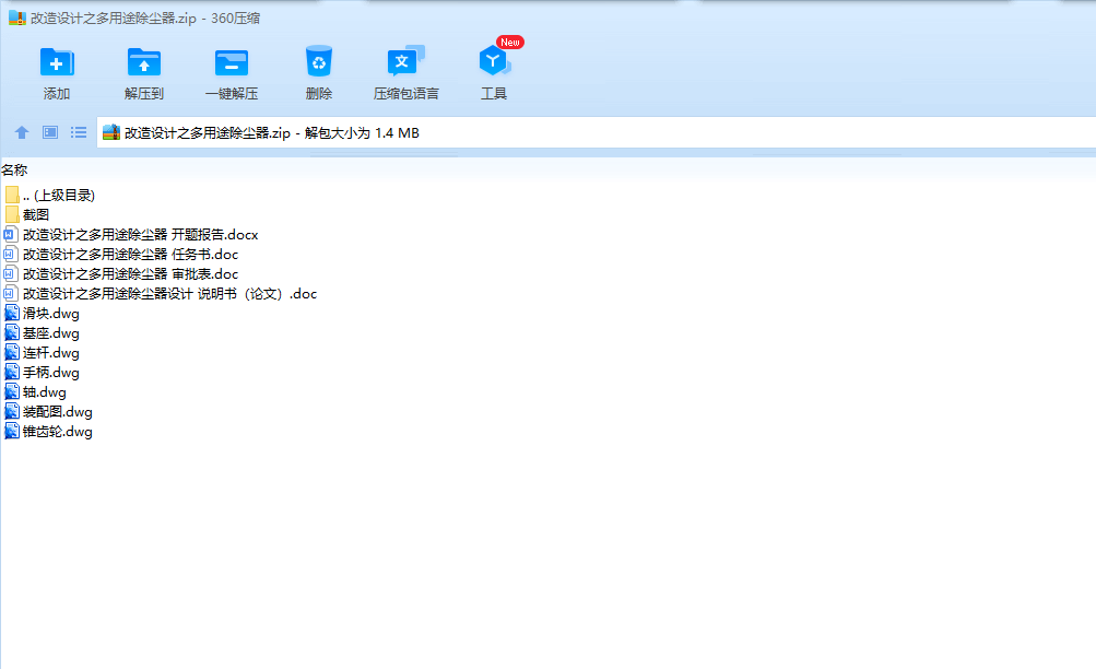 摘要:大多数城市家庭来讲,吸尘器已经成了清洁家庭的必备工具,我们可以通过对目前家用吸尘器的设计理念的研究来了解当今小家电产品设计的发展潮流。现在不少吸尘器在细节设计方面绝对可谓极尽人文关怀。比如现在已有专用的吸水吸尘器、边工作边发散香气的吸尘器;还有可以便吸尘边擦地板的吸尘器,用于电脑键盘、毛料衣物等表面清洁除尘的微型吸尘器等。由此我们可以看出,现代吸尘器的设计已经超出了吸尘器本身之功能需求,设计一种家用除尘、清理纱窗、玻璃等的除尘器,要结合实际情况来进行设计,清理普通灰尘,就选用普通除尘器那种结构,将灰尘吸入就完成了;清理纱窗、玻璃,就可以加一个系统,通过换不同刷头来进行清洁,比如清洁纱窗,加一个毛刷头,毛刷头将灰尘扫下,然后吸入除尘器。本文针对家庭除尘的需求,设计了本多用途除尘器。首先,对除尘器的功能需求进行分析,确定了传动原理方案,由叶轮旋转产生负压实现吸尘,由一曲柄滑块机构实现地面清扫擦拭。其次,对除尘器结构进行设计,使本除尘器既能满足功能需求,又方便安装调试。再次,对传动件进行设计计算。