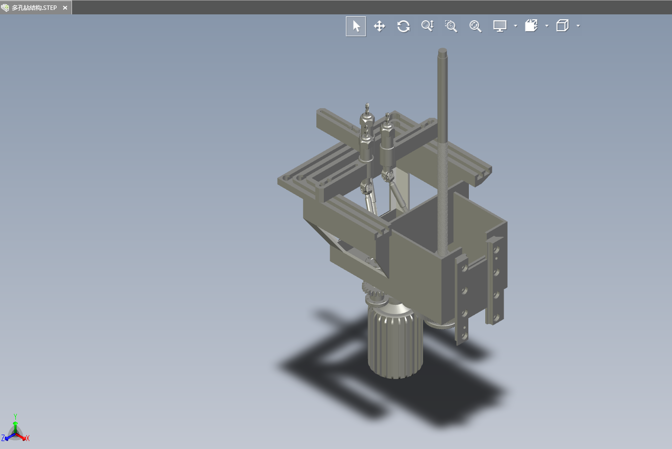 本次课题设计了集装箱用多孔钻支撑(机架)装置、集装箱用多孔钻行走装置,包括对其力能参数、结构参数的确定、部件的三维设计建模。