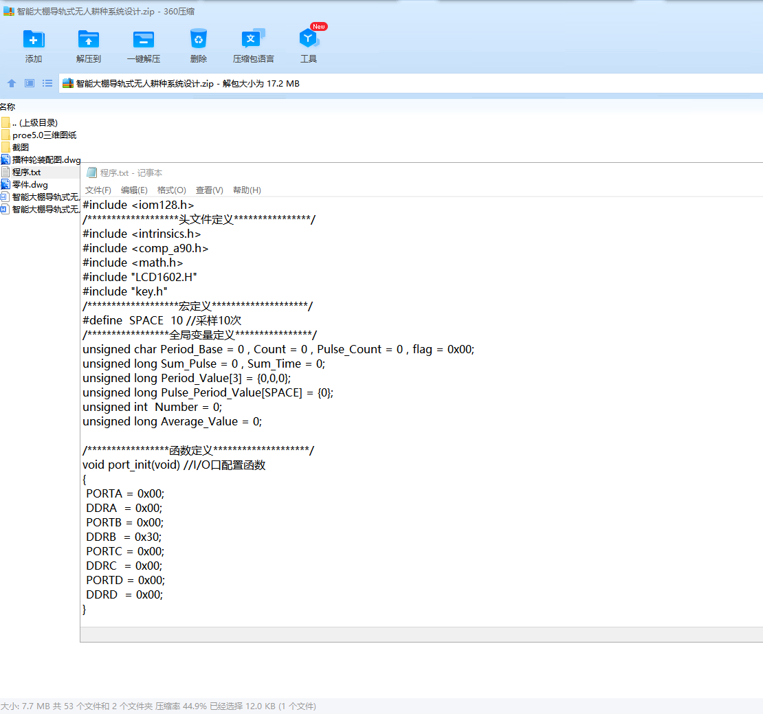 本次大棚导轨式无人耕种机控制系统采用ATMEGA128单片机作为主芯片。单片机先对增量式编码盘采集的信号进行分析处理得到机具的速度,然后根据所建立的数学模型,通过算法编程控制伺服电机的转速来实现智能耕种,其中为了精准耕种还设计两个反馈系统:伺服电机转速的反馈和实际耕种量的反馈。具有自动行驶、自动耕地、自动耕种、检测障碍物、防撞的功能。该平台应具有智能化、小型化、经济实用等特点。