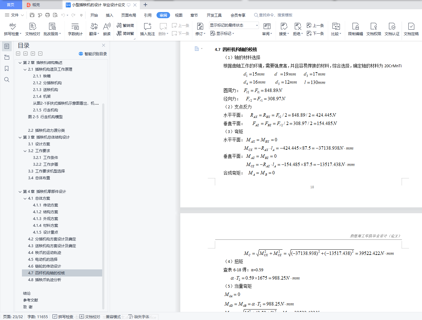 小型插秧机的设计摘要:小型插秧机的发展方向将是自动化,制造出经济实惠、适用性强的小型插秧机很有发展市场,针对不同地区开发出不同结构的插秧机极有市场前景。由此,相应的制造出高性能的小型插秧机是国内插秧机的发展现况。本课题设计的小型插秧机在分秧、送秧以及插秧深度控制方面作出改进,使其更便于操作化,增加其效率,降低其成本, 工作时发动机分别将动力传递给曲柄连杆式插秧机构和送秧机构,在两机构的配合下,插秧机构的秧针插入秧块抓取秧苗,将其取出下移,当移到设定的插秧深度时,由插秧机构中的插植臂将秧苗从秧针上压下,完成一个插秧过程。同时,通过浮板系统,控制行走轮与机架的相对位置和浮板与插针的相对位置,从而,能在秧田不平时使得插秧深度基本一致。该插秧机的结构紧凑、零件简单、使用方便、经济实惠,能够解决丘陵及道路不畅通地区的插秧工作。关键词:小型,插秧机,结构紧凑Design of small rice transplanterAbstract: The development direction of small rice transplanter will be automation, the manufacture of economic and affordable, the applicability of small rice transplanter has the development of the market, for different regions to develop different structure of the rice transplanter has the market prospect.Therefore, the development of small rice transplanter with high performance is the general situation of foreign harvester.This topic design of small rice transplanter in points for plants, plants and planting depth control aspect to make improvement, make it easier for operation, increase the efficiency, reduce the cost, working engine respectively pass power to crank connecting rod type transplanting mechanism and submitted to the office of seedling, in conjunction with the two institutions, seedling planting agencies needle inserted into the seedling block fetching seedlings, remove its down, when moved to the setting of the planting depth, will be inserted in the plant by planting arm seedlings under pressure from the seedling needle, complete a planting process.At the same time, through the floating plate system, the relative position of the walking wheel and the frame and the relative position of the floating plate and the inserting needle can be controlled, so that the planting depth can be basically the same in the rice field.The transplanter is compact in structure, simple in parts, convenient in use, economical and economical, and can transplanting rice in hilly and road-blocked areas.Key words:Small ,rice transplanter,compact structure目录第1章 绪论 11.1 课题研究的目的及意义 11.2 国内外发展现状 11.2.1 国外现状 11.2.2 国内现状 11.3 本课题研究内容 1第2章 插秧机结构概述 32.1 插秧机构造及工作原理 32.1.1 秧箱 32.1.2 分插秧机构 42.1.3 送秧机构 42.1.4 机架 52.1.5 行走机构 52.2 插秧机动力源分类 5第3章 插秧机总体结构设计 63.1 设计方案 63.2 工作要求 63.2.1 工作条件 63.2.2 工作步骤 73.3 工作要求机型选择 83.4 总体布置 8第4章 插秧机零部件设计 94.1 总体方案 94.1.1 传动方案 94.1.2 结构方案 94.1.3 外观方案 94.1.4 材料方案 94.1.5 设计重点 94.2 分插机构方案设计及确定 104.3 送秧机构方案设计及确定 114.4 秧爪的运动轨迹 124.5 电动机的选择 134.6 链轮的传动设计 144.6.1 链轮参数 144.6.2 传动设计 154.6.3 链轮材料选取与校核 174.7 四杆机构轴的校核 184.8 插秧爪轨迹分析 19结论 22参考文献 23