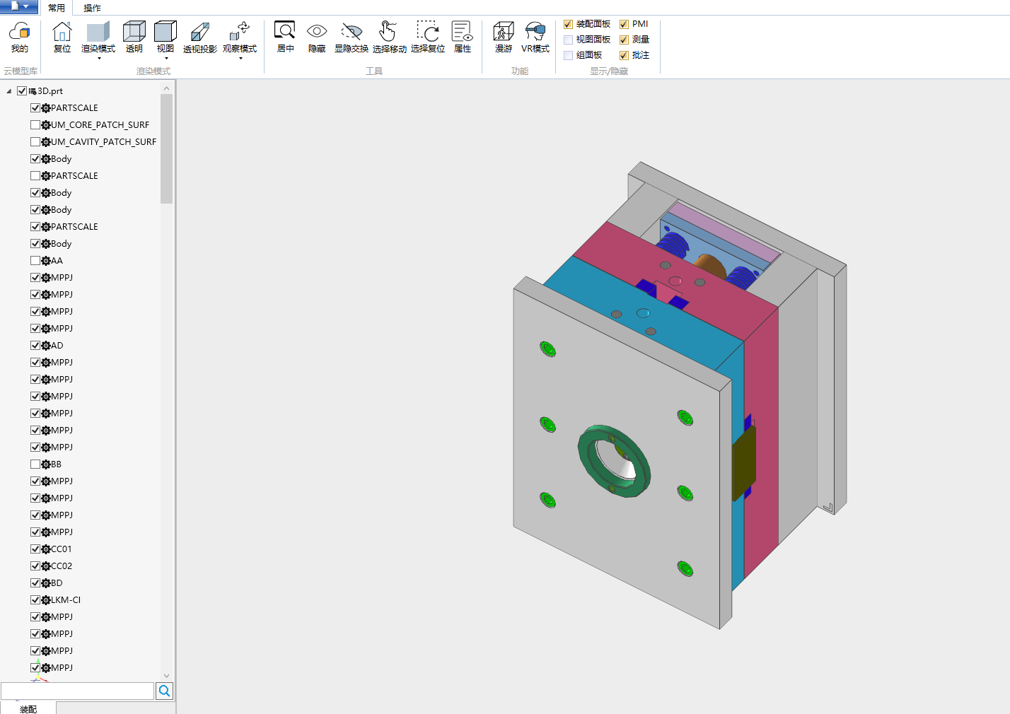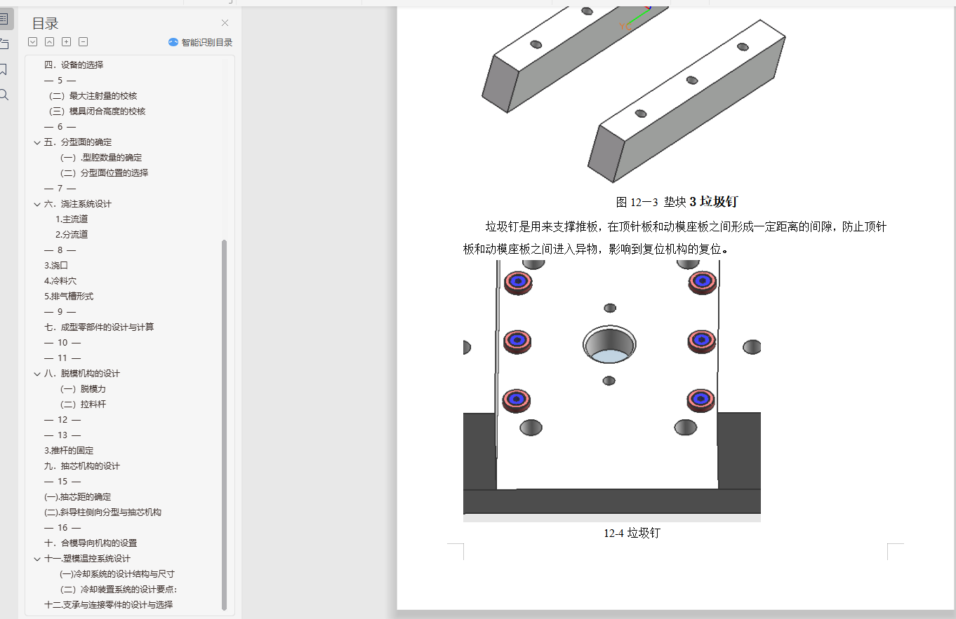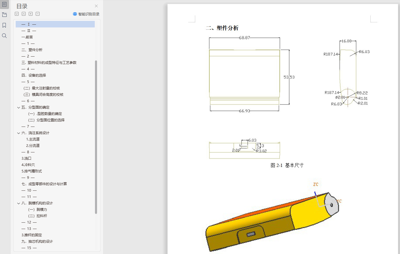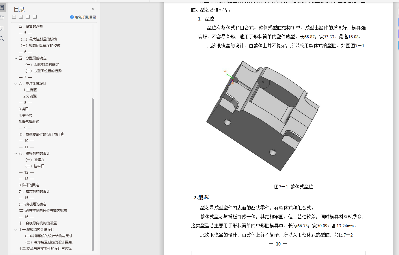 第二, 根据实体模具型对零件进行结构分析,确定整个注塑循环系统,包括基本模架、开模具行程,开模、复位机构,冷却系统等基本参数,对具体结构零件分析计算。用UG对模具的型腔、型芯及其它零件进行三维造型,对其进行实体装配.