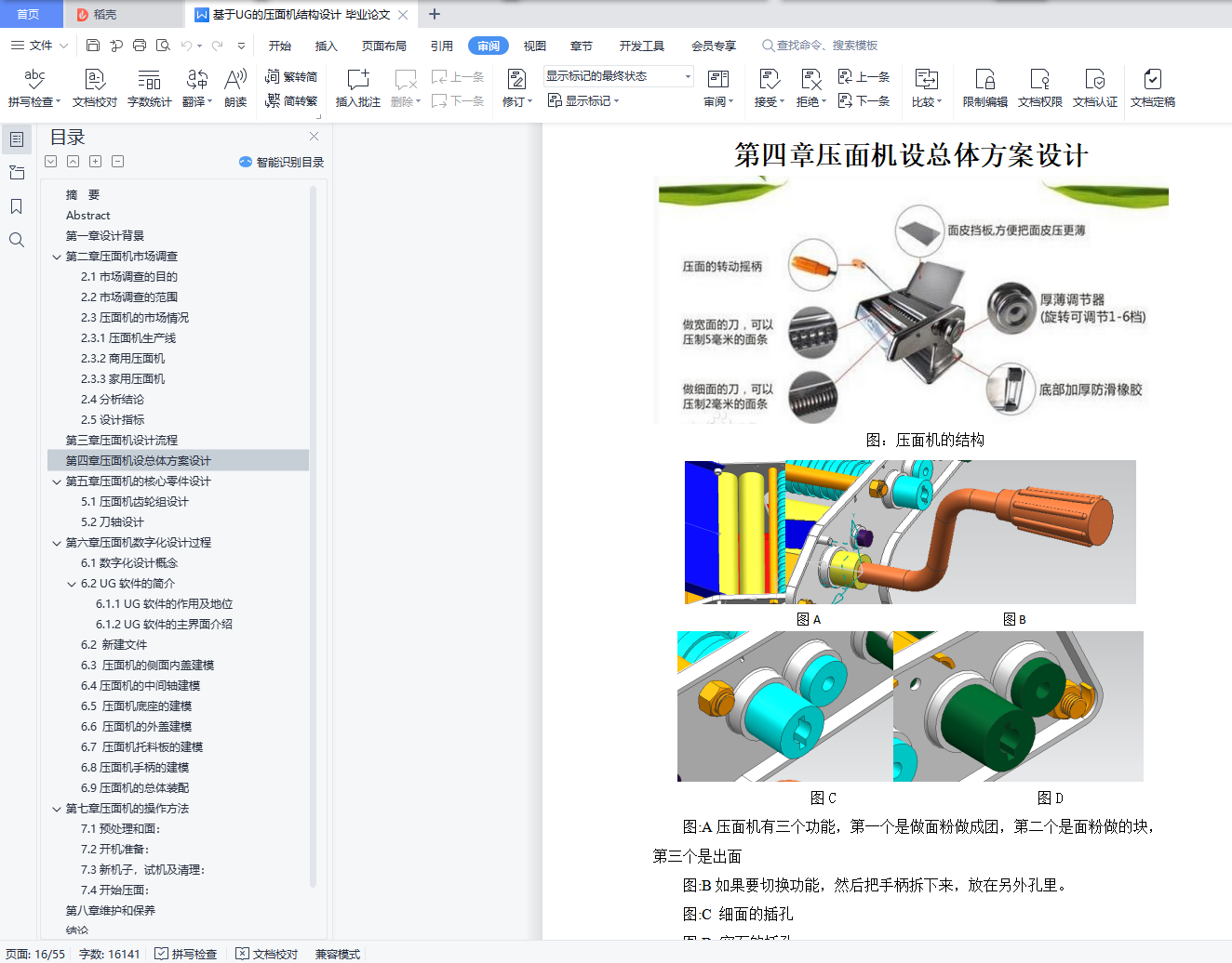 我根据我大学所学的知识,对一种手压式压面机进行深入的介绍和分析,设计了一款全新的压面机。利用我们在学所学的UG和CAD软件对压面机进行结构设计,并用CAD对压面机进行工程出图。压面机,采用手动作为动力源,具有结构简单,质量可靠,方便维修等特点,量生产可获得比较高的经济效益。
