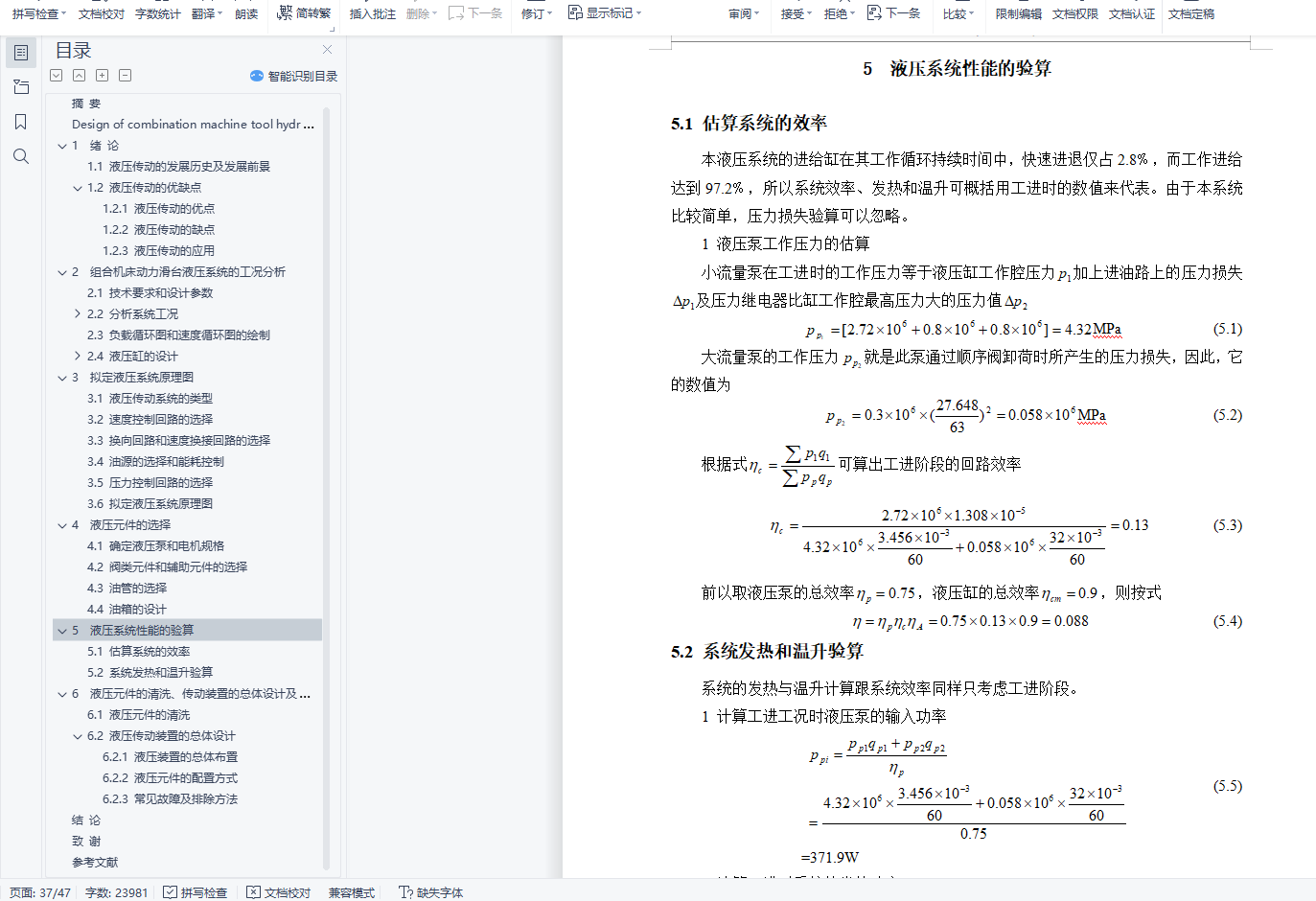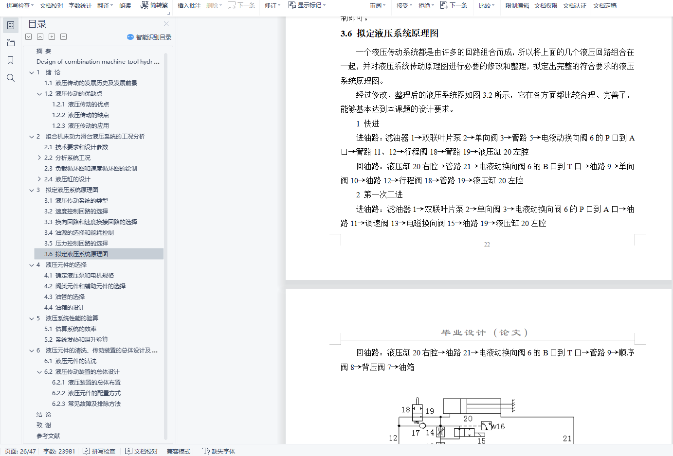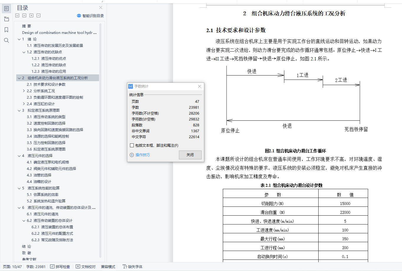 本文首先对组合机床动力滑台液压系统进行工况分析,通过分析计算,绘制速度、负载循环图,初步选定液压缸工作压力,并计算液压缸尺寸以及各阶段流经液压缸的流量;其次根据液压系统供油方式、调速方式、速度换接方式来拟定液压系统图,并且对系统工作状态进行分析;再次通过对流经各元件的流量的计算,合理选择液压元件;最后通过对系统效率、发热和升温的验算,对液压系统进行性能分析。所设计的液压系统除了满足上述要求外,还必须符合体积小、重量轻、成本低、效率高、结构简单、工作可靠、使用和维修方便等一些公认的普遍设计原则。