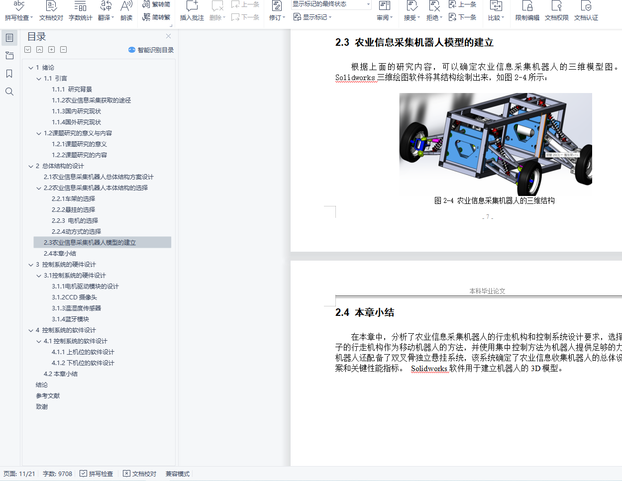 本文首先通过对我国农业信息采集相关进展的发展情况进行研究,从而得到哪些方面需要利用科学的方法去确定机器人的相关功能。通过综合考虑,确定在农业大棚里应用这种机器人,从而确定机器人的机械结构,运动方式,完成其总体框架的设计。并且利用Solidworks绘制机器人的总体框架,使其更加直观的展现出来,也更加有利于后期增删零件,便于修改。