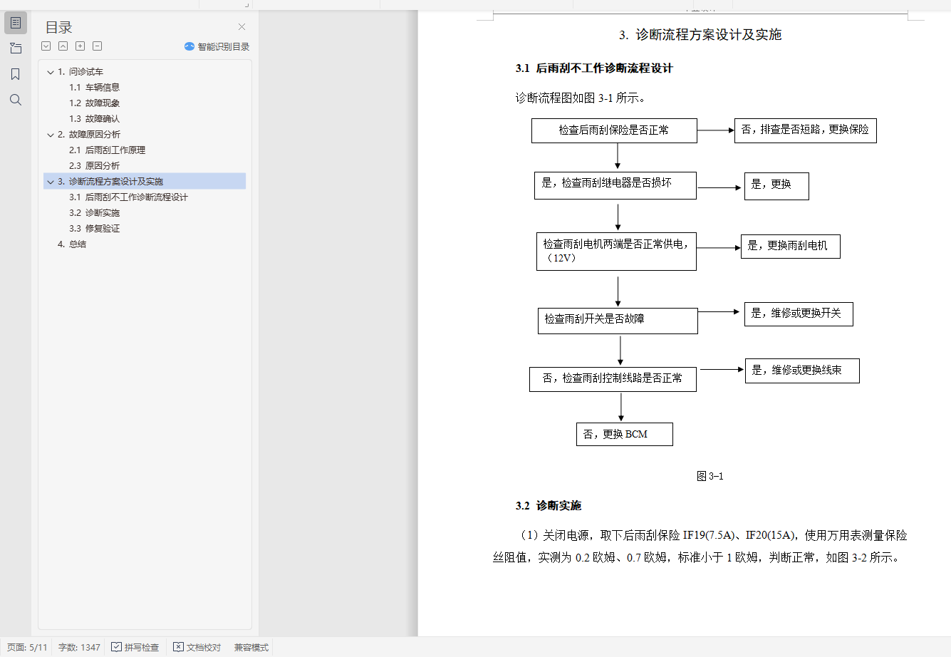 车子正常起动,打开后雨刮开关,检查后雨刮发现,在间歇挡和低速挡,后雨刮都不工作,故障确实存在。