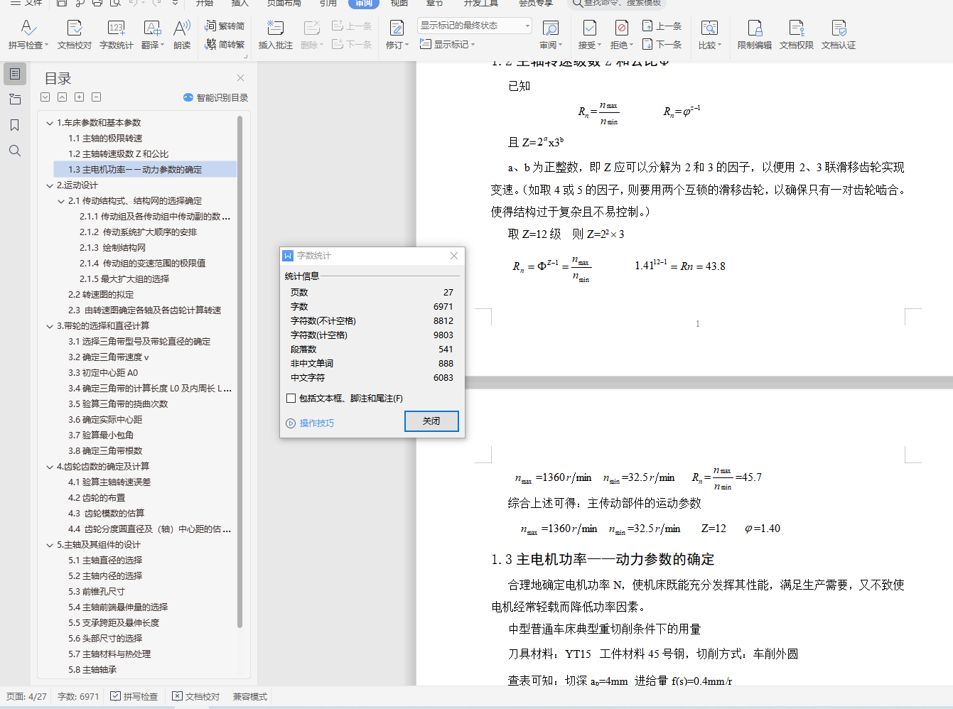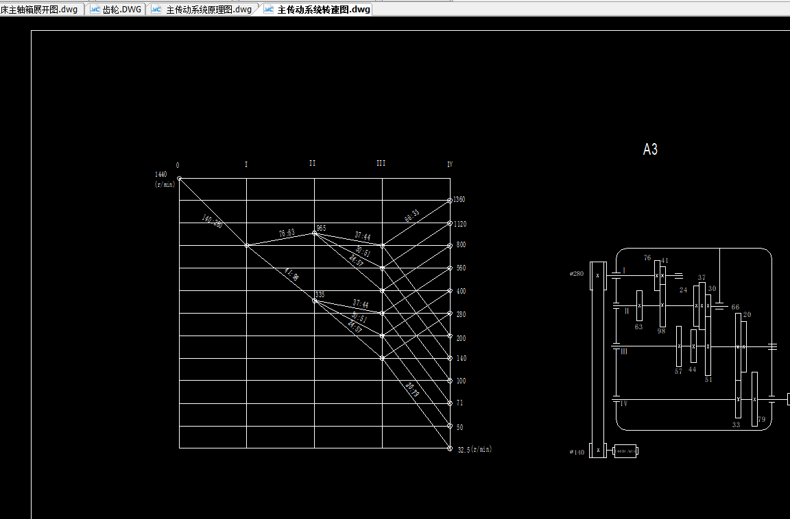 各级转速数列由标准数列表中查出,因=1.41=,首先找到35,然后每隔5个数取一个值,可得如下转速数列:32.5、50、71、100、140、200、280、400、560、800、1120、1360共12级转速。