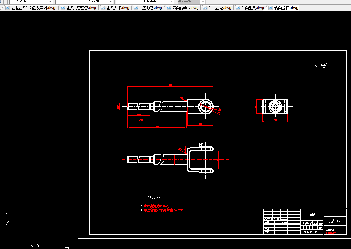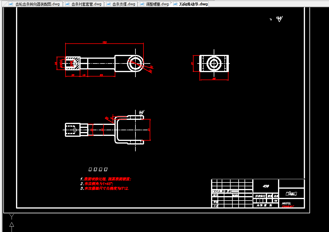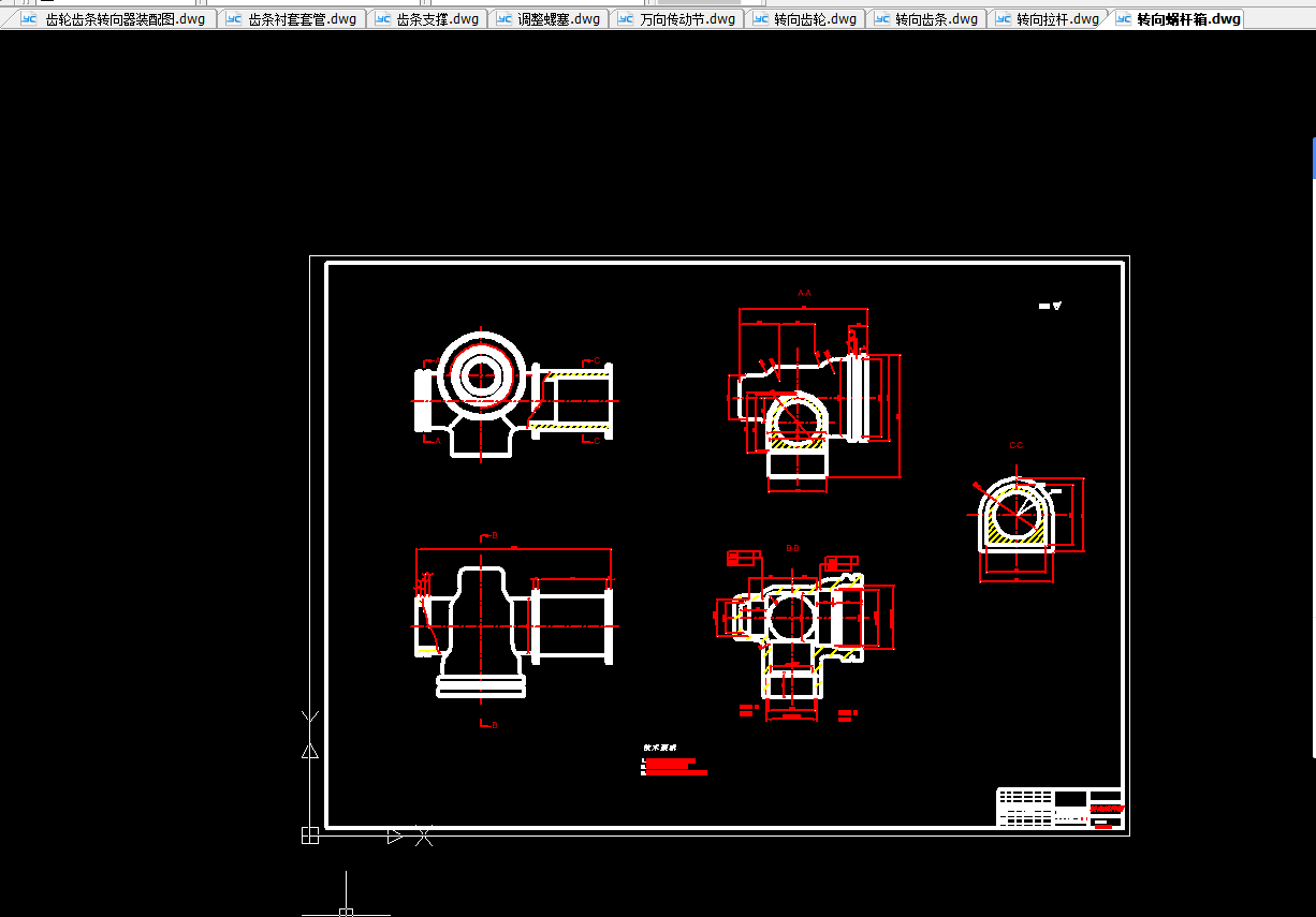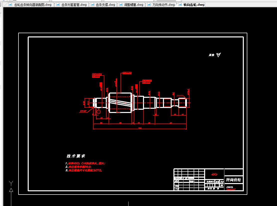 本次设计主要对一汽佳宝的转向器进行设计。首先对转向器进行了结构上的设计,此转向器选用的是侧面输入,两端输出的齿轮齿条式转向器。其优点为:结构简单、紧凑;壳体由铝合金或镁合金压铸而成,故质量比较小;传动效率高达90%;齿轮齿条之间因磨损出现间隙后,可利用装在齿条背部、靠近小齿轮的压紧力可以调节的弹簧自动消除齿间间隙,在提高系统刚度的同时也可防止工作时产生冲击和噪声;转向器占用体积小;没有转向摇臂和直拉杆,可以增大转向轮转角;制造成本低。