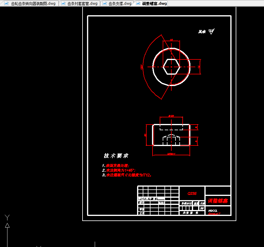 This design is mainly focus on FAW Jiabao. First, design the steering gear’s structure. This steering gear applied beside input. Two terminal output rack and pinion steering. Its’ advantages is simple configuration and compact. Shell is pressurized carging by aluminium alloy or magnesium ally. So the weight is relatively low. Transmitting efficient can reach 90%. If gap appears between rack and pinion. It can be eliminated by the spring which is located back of rack adjustable to pinion,and spring pressure can be ajusted .Simproving the systen’s stiffness.It also can prevent the impact and noise when it works .Steering gear occupy. Little volume have no steering arm and tie rod. Steering wheel angle can be increased;manufacturing cost is low.