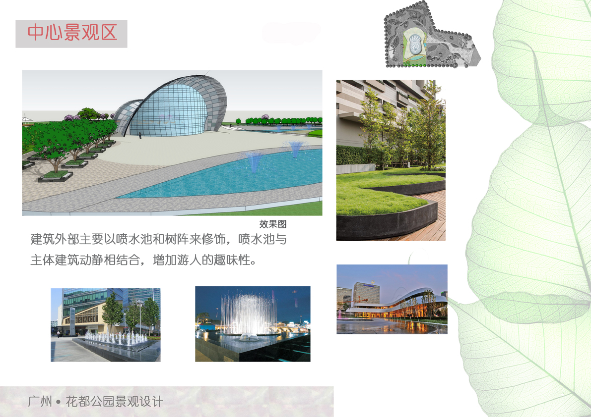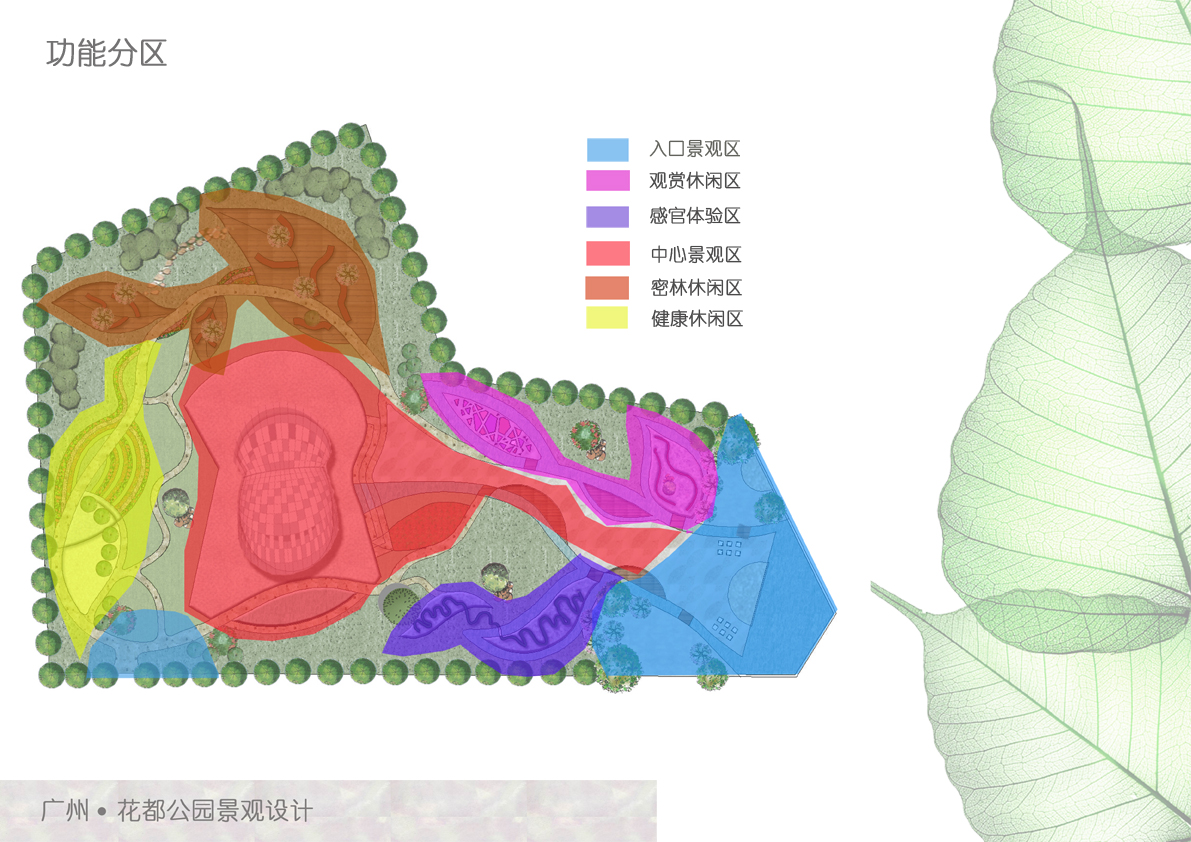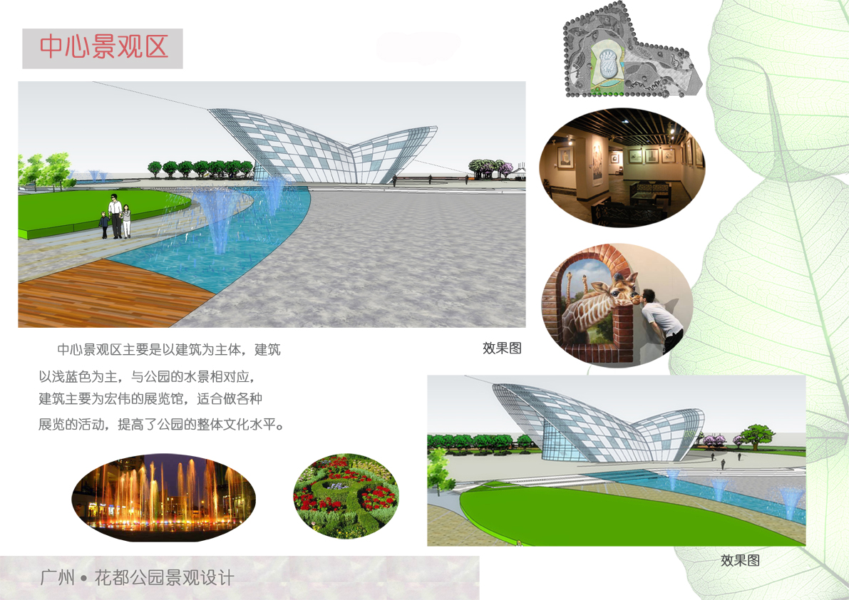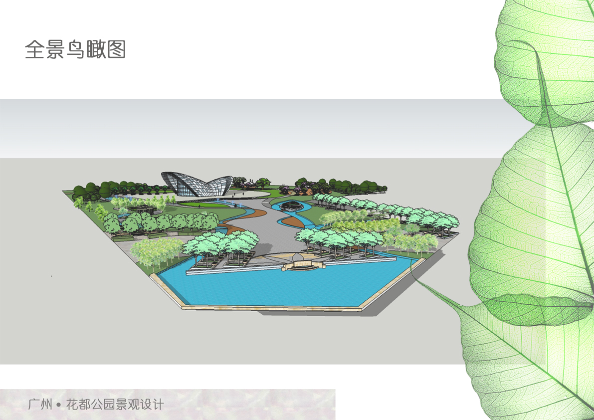 花都公园的方案针对旅游城的展示,并且照顾到现代人因生活、工作等因素造成的压抑心情,尊重场地的自然生态。方案的设计重要以一株开花的藤蔓为主体,表现出花都的朝气蓬勃、欣欣向荣,并突出人与自然的和谐关系,以人与环境的和谐为宗旨,定位于“休闲、文化、娱乐”,把林荫树林、疏林草地串联起来,在有限的用地范围内创造一个可游、可观、可娱乐的绿色空间,为现代生活节奏快的人们提供一个优美、宁静、充满文化境界的休闲好去处。