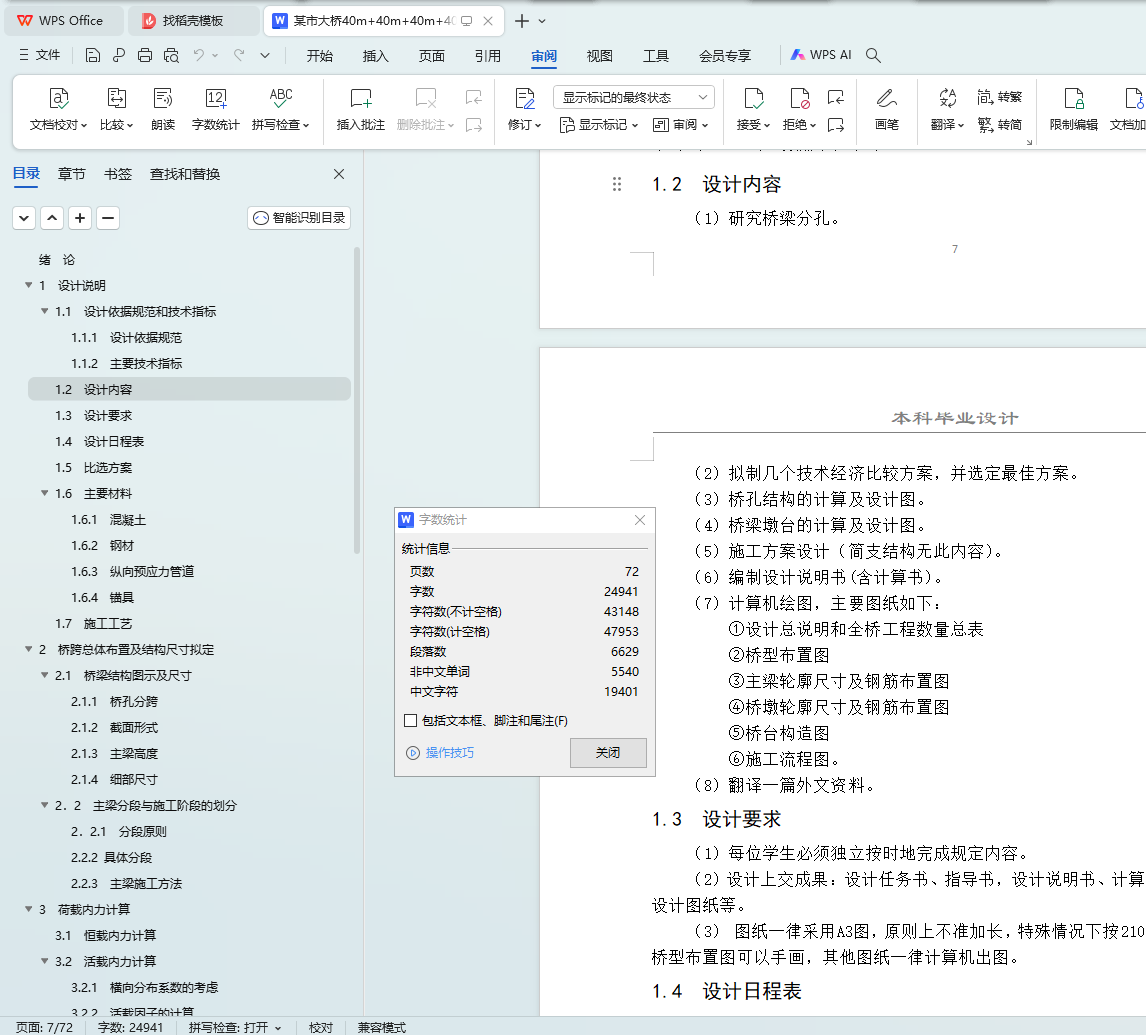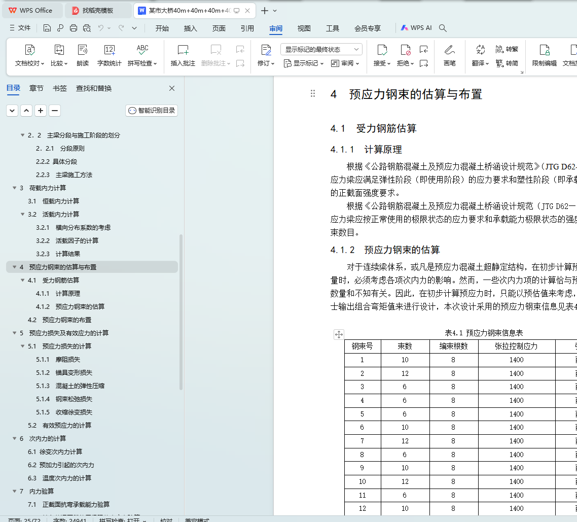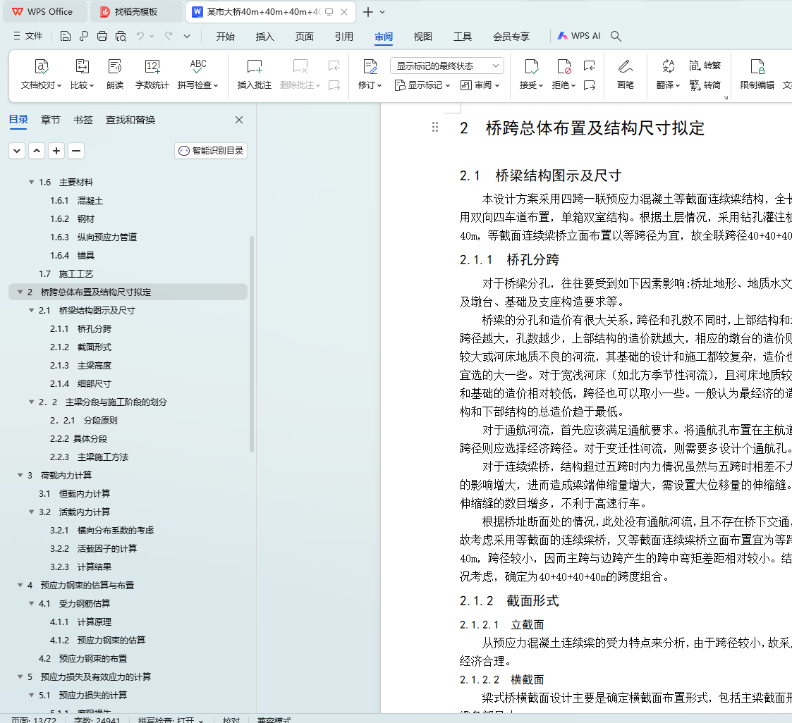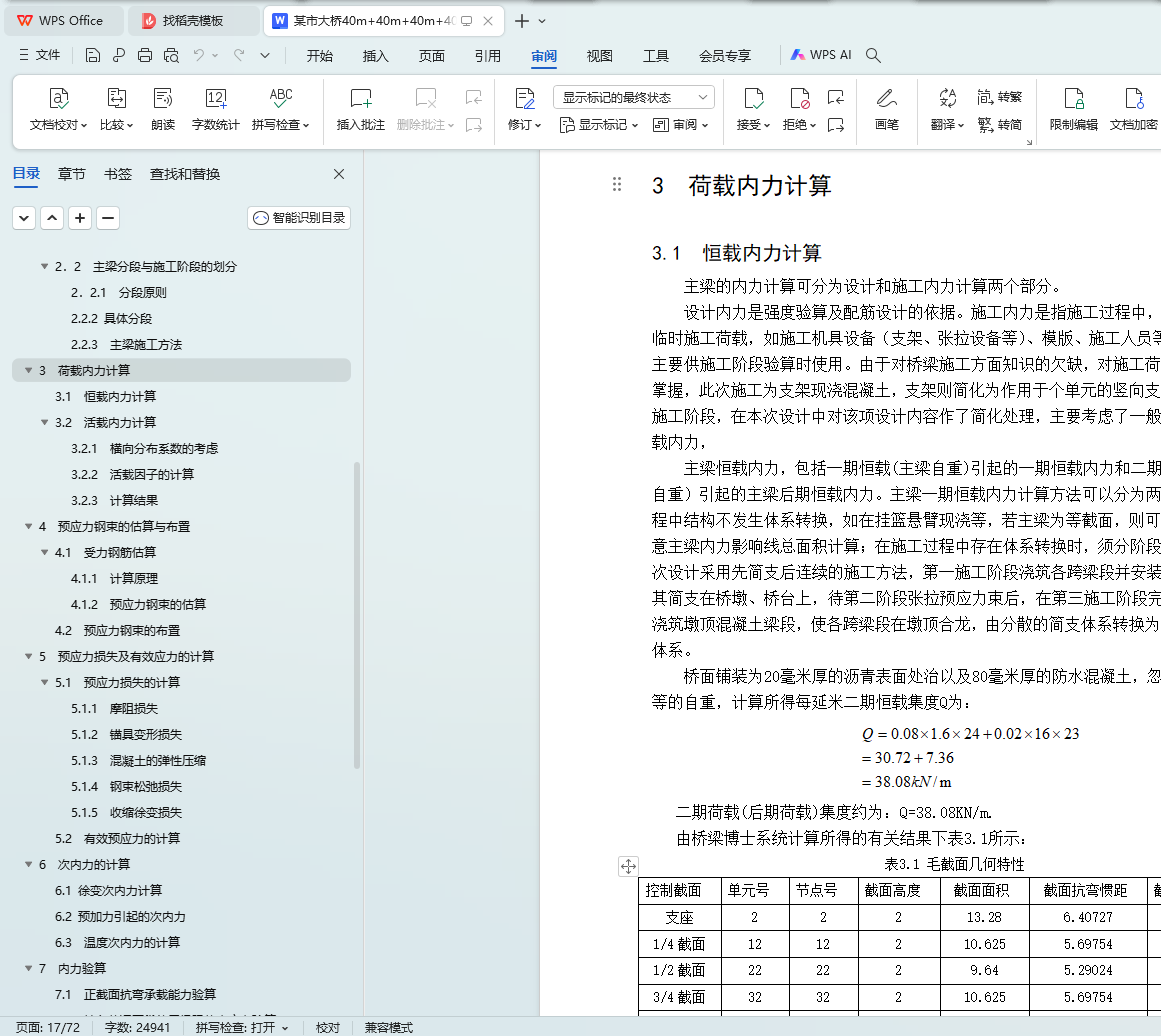 最后,利用桥梁博士建模,输入材料特性、截面形状等结构信息,然后用桥梁博士报告模板输出每个截面的所需的钢筋面积,以此来布置预应力钢束。可以根据桥梁博士输出的施工内力、活载内力、长(短)期效应组合验算、钢束验算等报告整理计算书,并绘制方案图及相关施工图。