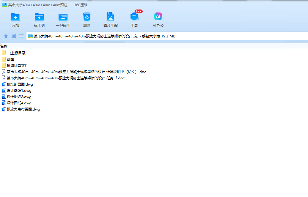 本次毕业设计的题目是xx市大桥施工图设计,专题题目是主跨40m的连续梁桥设计。依据《公路桥涵通用设计规范 JTG D60―2004》和《公路钢筋混凝土及预应力混凝土桥涵设计规范JTG D62―2004》,通过综合运用所学过的基础理论及专业知识,独立进行桥梁设计。