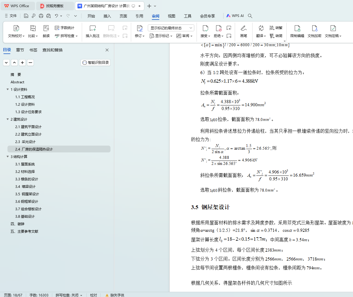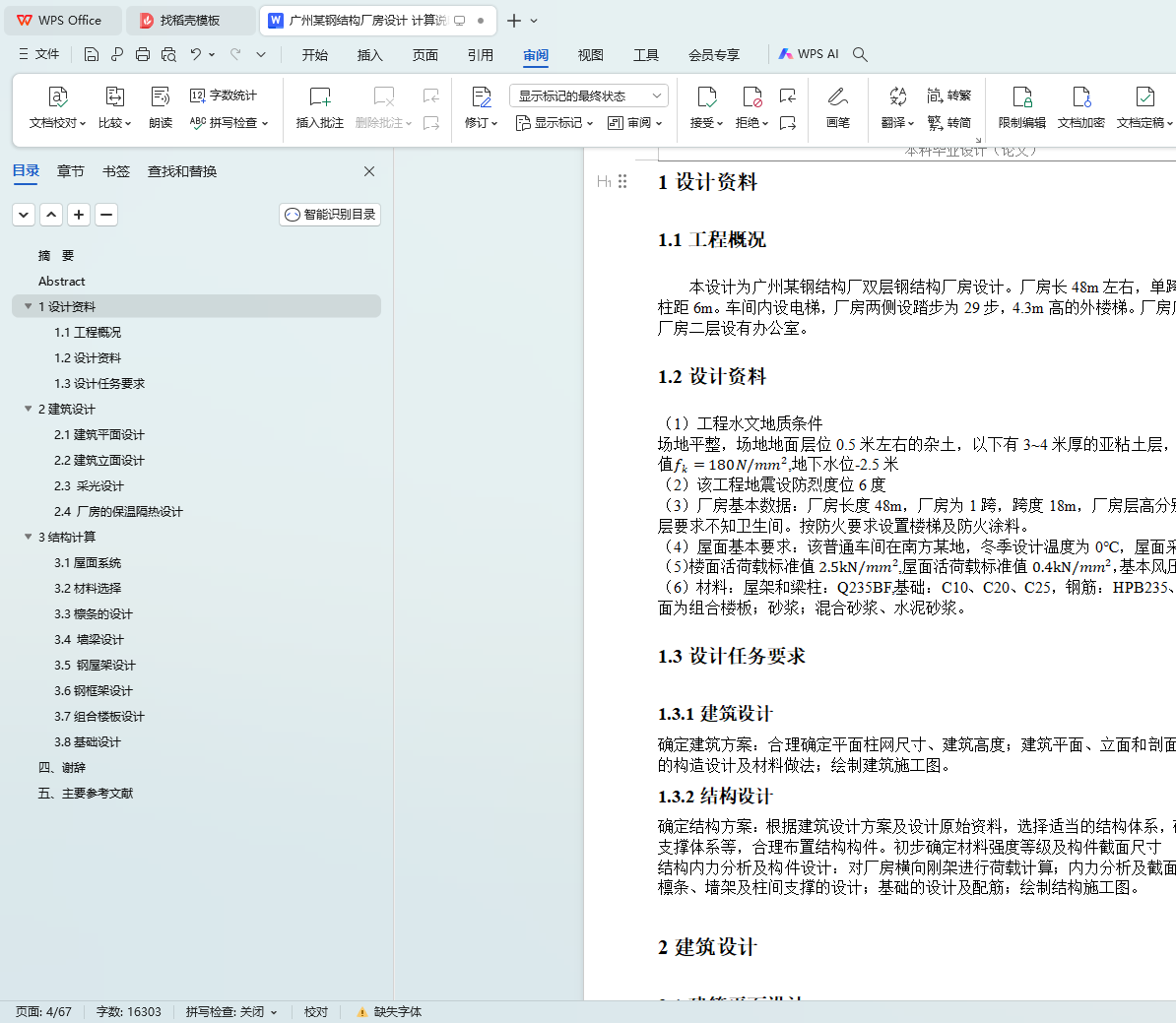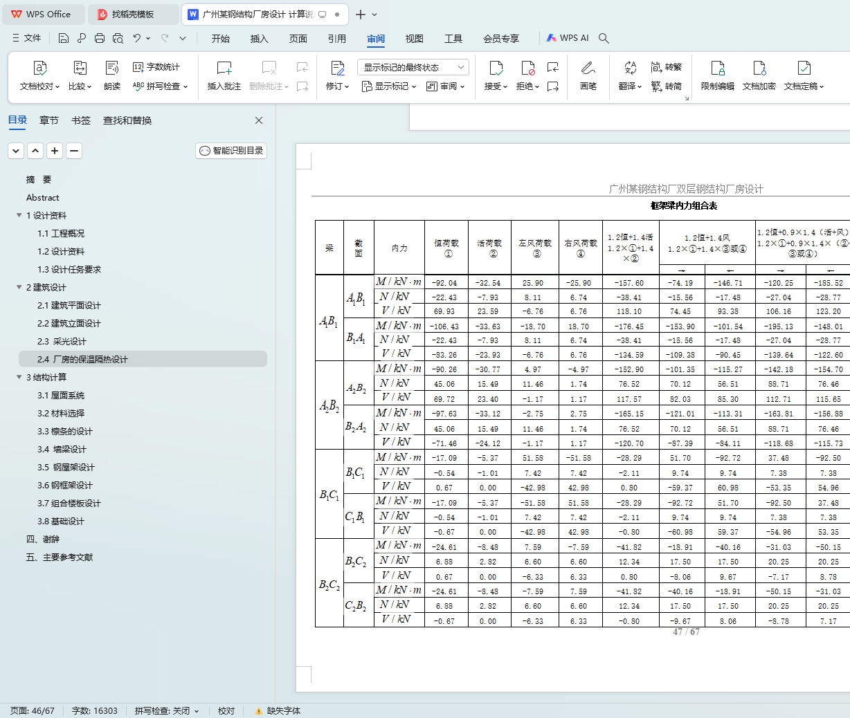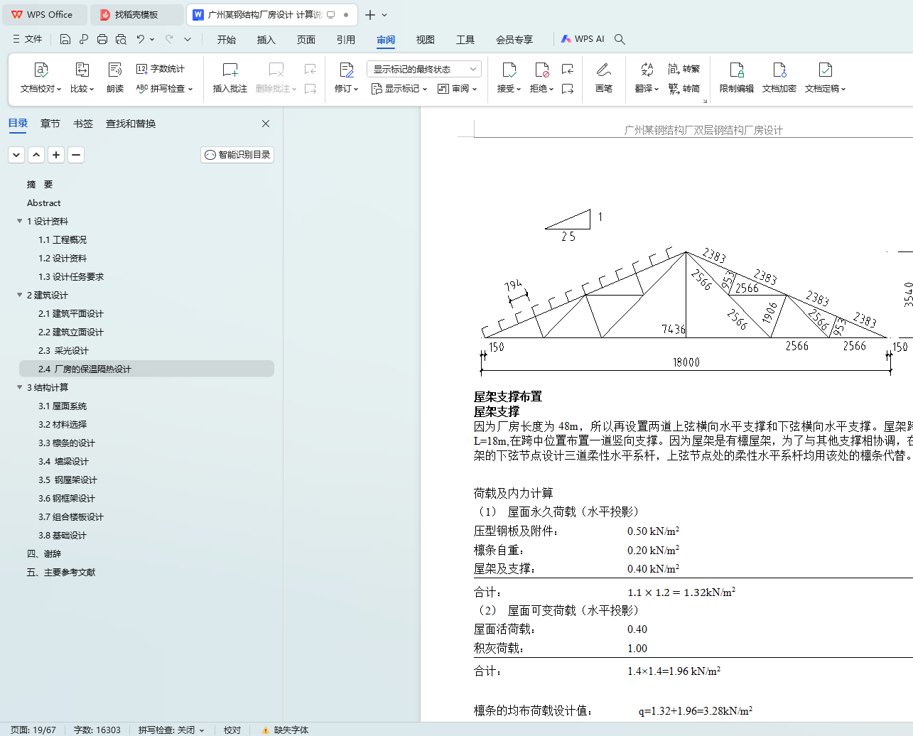 本文详细阐述了广州某钢结构厂房的设计计算过程。在建筑设计方面,我们深入研究了建筑方案的确定,包括平面柱网尺寸、建筑高度的合理选择,以及建筑平面、立面和剖面的精心设计。同时,我们也对主要部位的构造设计及材料做法进行了细致考虑,并绘制了相应的建筑施工图。在结构设计方面,我们根据建筑设计方案及原始设计资料,选择了合适的结构体系,并确定了柱距、跨度、支撑体系等关键参数,合理布置了结构构件。在此基础上,我们初步确定了材料强度等级及构件截面尺寸。随后,我们对厂房横向刚架进行了荷载计算、内力分析及截面设计,同时也完成了钢屋架、檩条、墙架及柱间支撑的设计。此外,我们还进行了基础的设计及配筋,并绘制了结构施工图。本研究不仅为广州某钢结构厂房的建设提供了全面的设计指导,也为类似工程的设计提供了有益的参考。