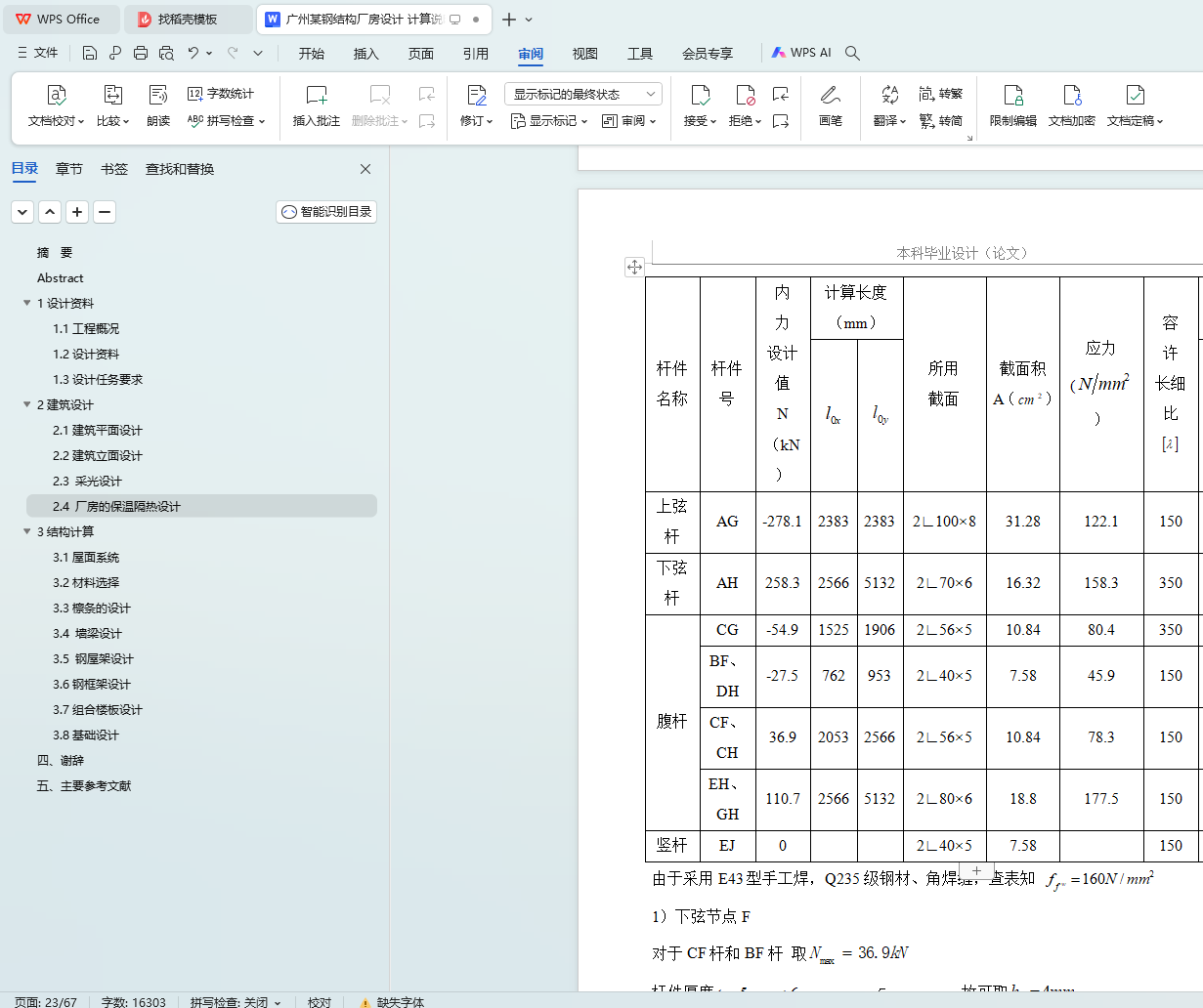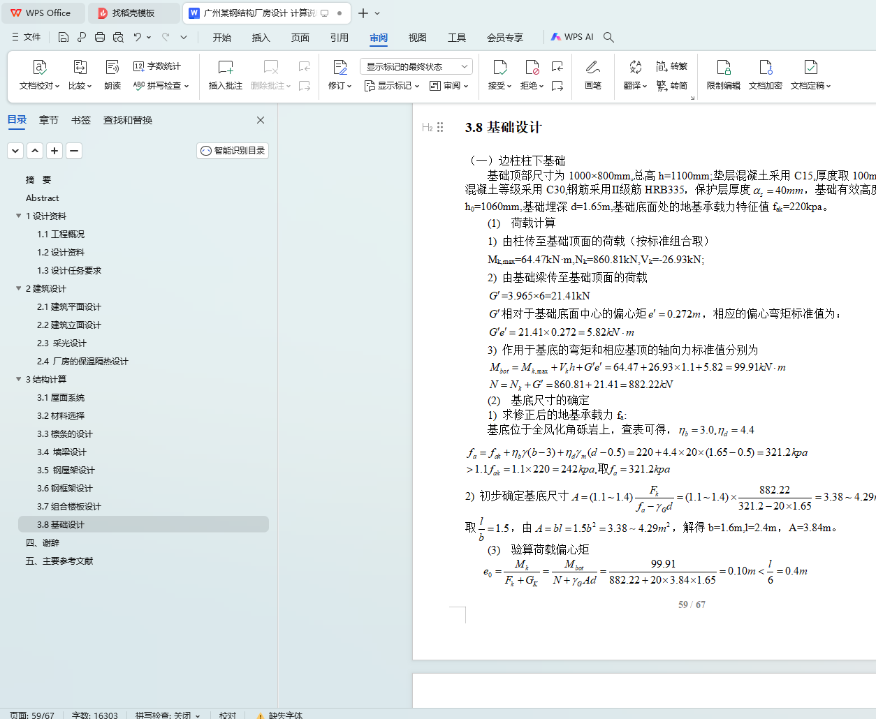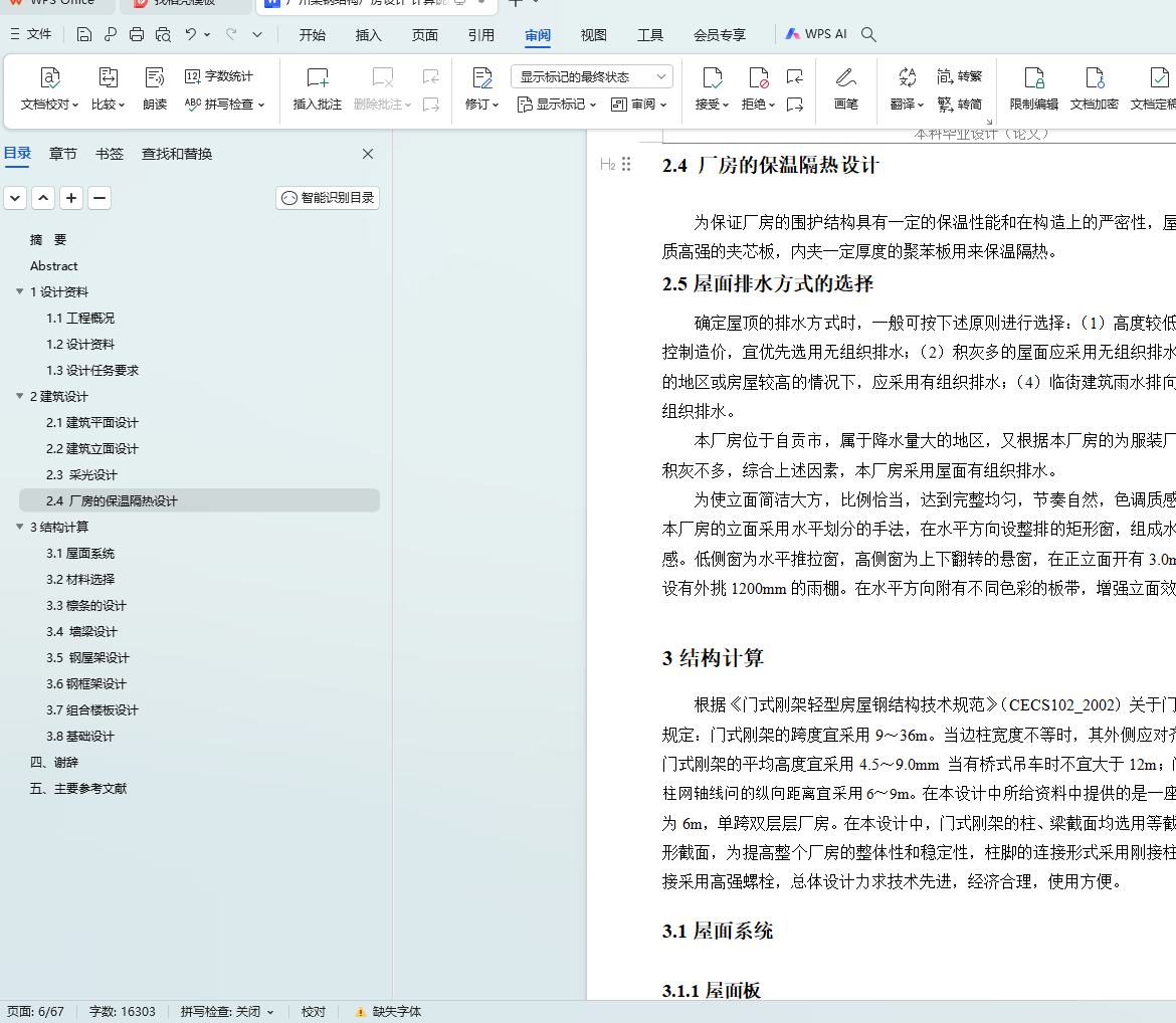 本文详细阐述了广州某钢结构厂房的设计计算过程。在建筑设计方面,我们深入研究了建筑方案的确定,包括平面柱网尺寸、建筑高度的合理选择,以及建筑平面、立面和剖面的精心设计。同时,我们也对主要部位的构造设计及材料做法进行了细致考虑,并绘制了相应的建筑施工图。在结构设计方面,我们根据建筑设计方案及原始设计资料,选择了合适的结构体系,并确定了柱距、跨度、支撑体系等关键参数,合理布置了结构构件。在此基础上,我们初步确定了材料强度等级及构件截面尺寸。随后,我们对厂房横向刚架进行了荷载计算、内力分析及截面设计,同时也完成了钢屋架、檩条、墙架及柱间支撑的设计。此外,我们还进行了基础的设计及配筋,并绘制了结构施工图。本研究不仅为广州某钢结构厂房的建设提供了全面的设计指导,也为类似工程的设计提供了有益的参考。