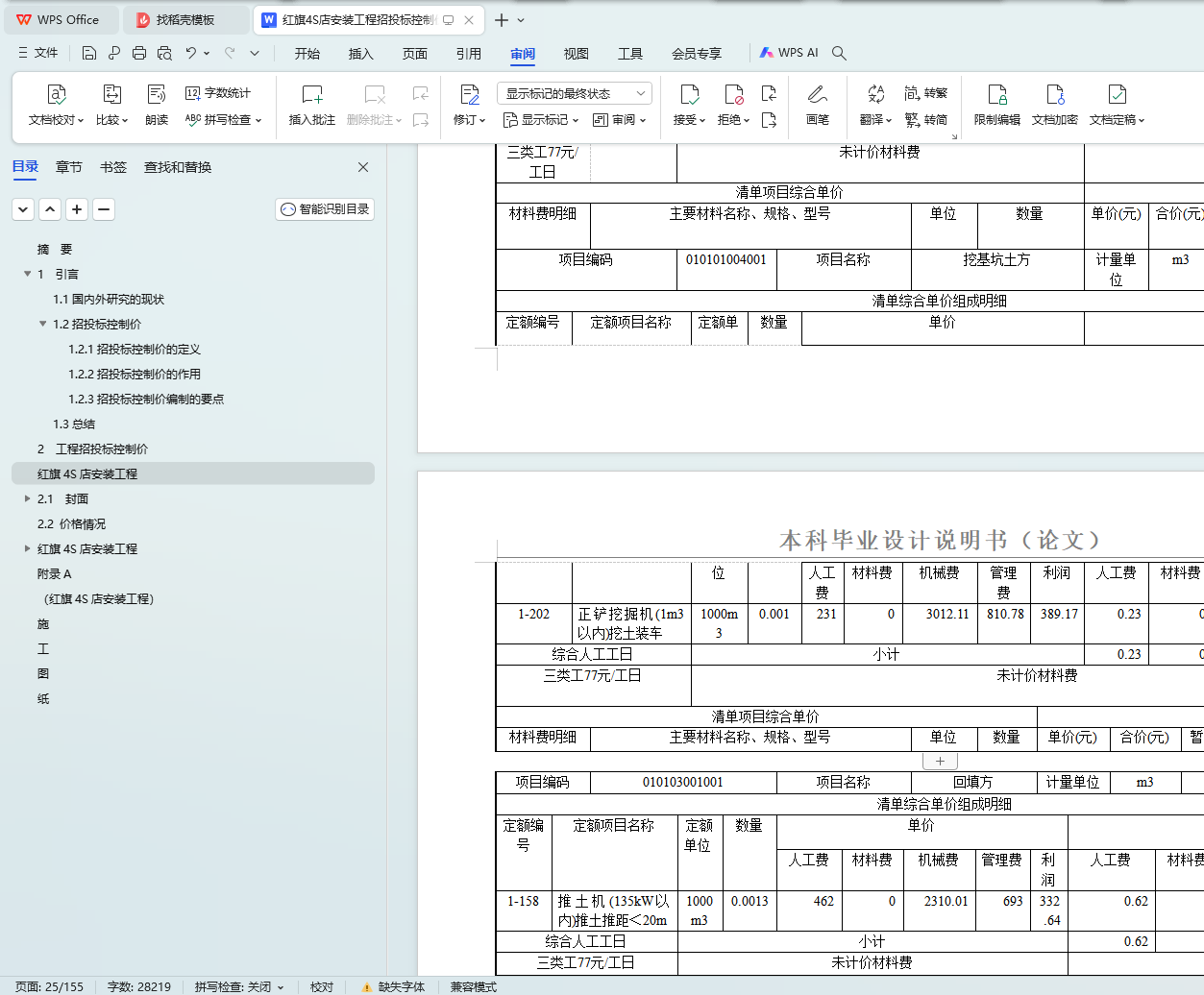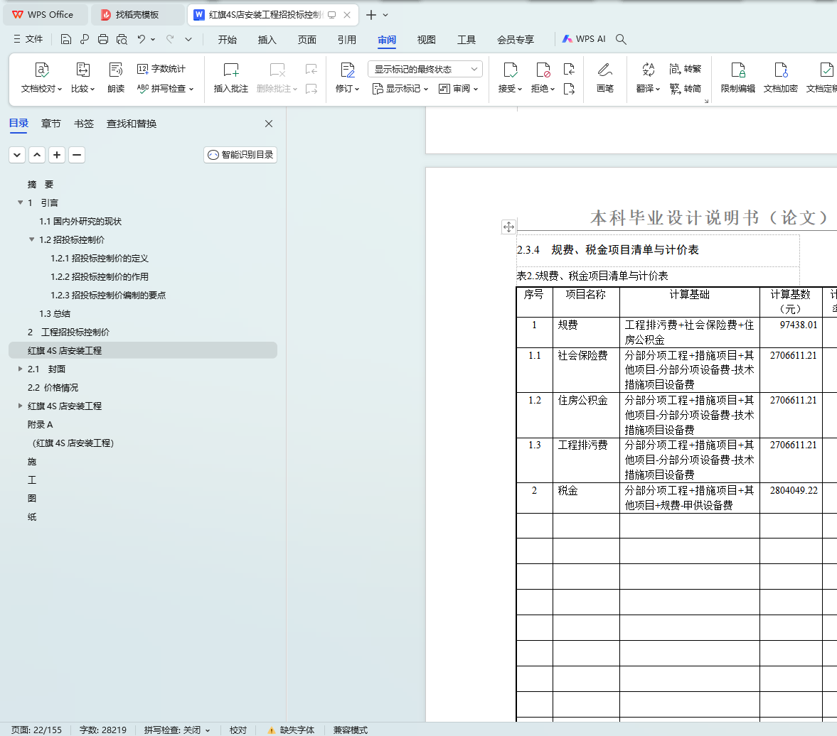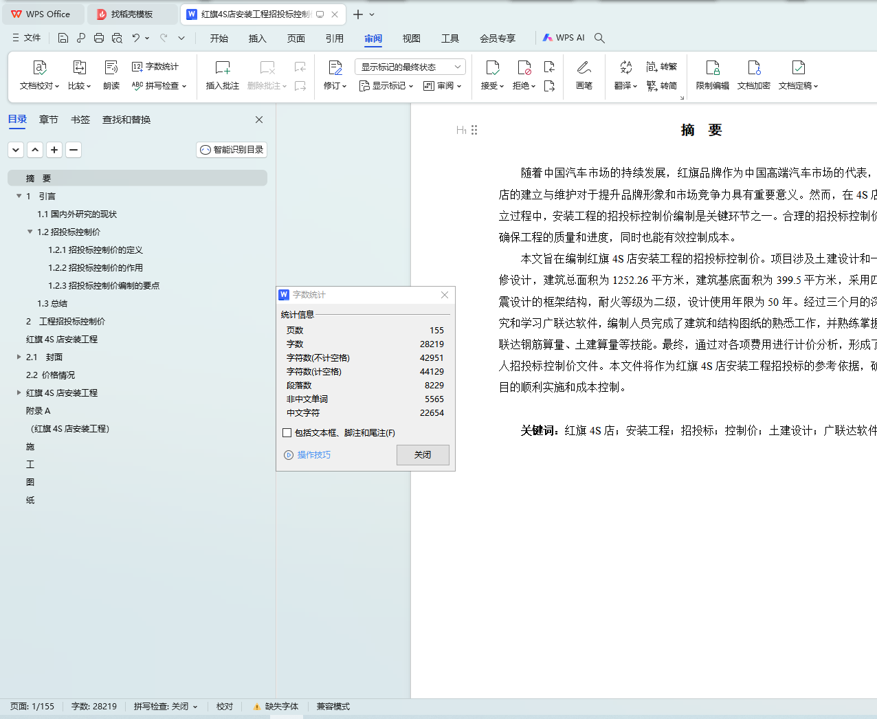 本文旨在编制红旗4S店安装工程的招投标控制价。项目涉及土建设计和一般装修设计,建筑总面积为1252.26平方米,建筑基底面积为399.5平方米,采用四级抗震设计的框架结构,耐火等级为二级,设计使用年限为50年。经过三个月的深入研究和学习广联达软件,编制人员完成了建筑和结构图纸的熟悉工作,并熟练掌握了广联达钢筋算量、土建算量等技能。最终,通过对各项费用进行计价分析,形成了招标人招投标控制价文件。本文件将作为红旗4S店安装工程招投标的参考依据,确保项目的顺利实施和成本控制。