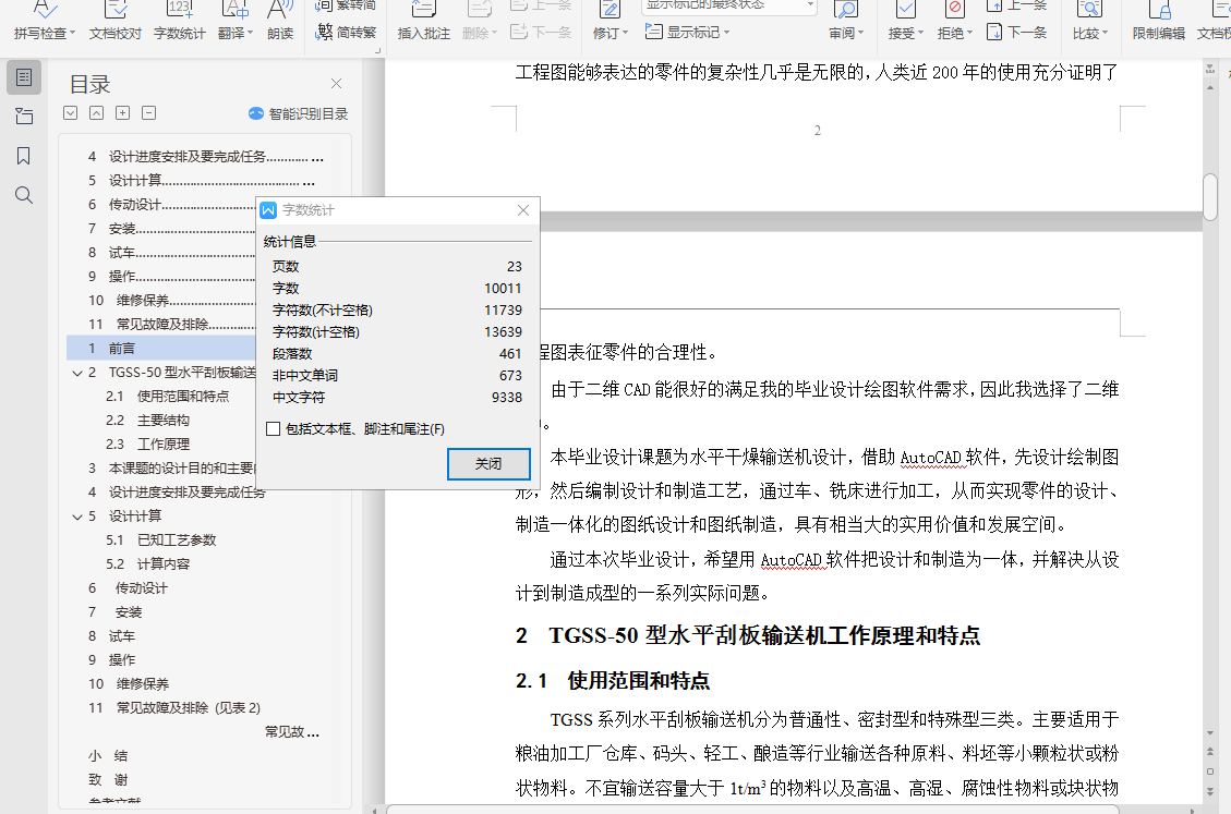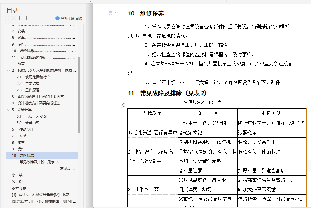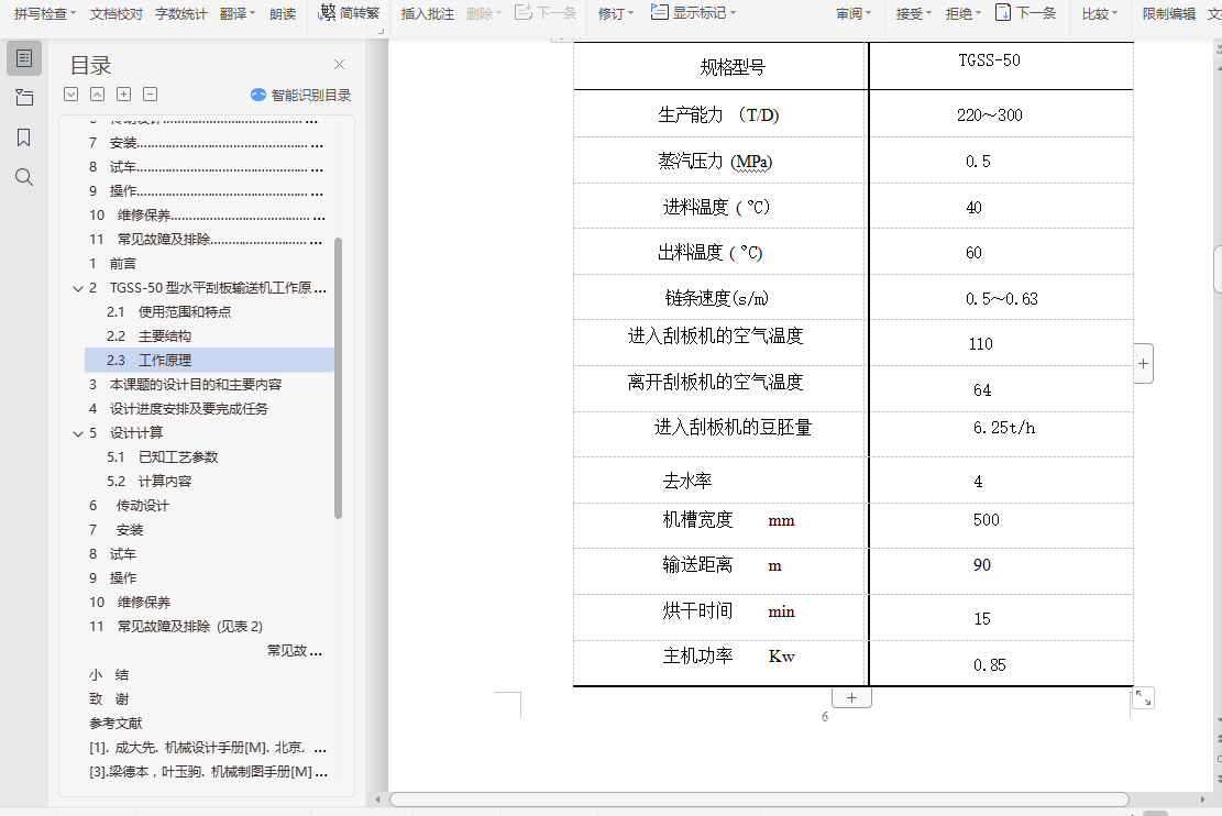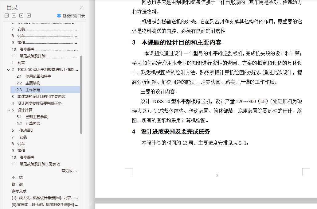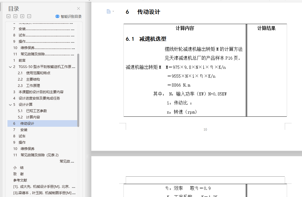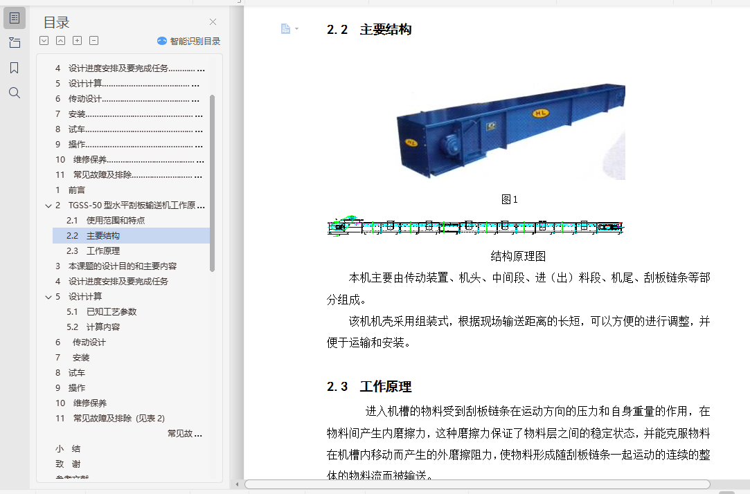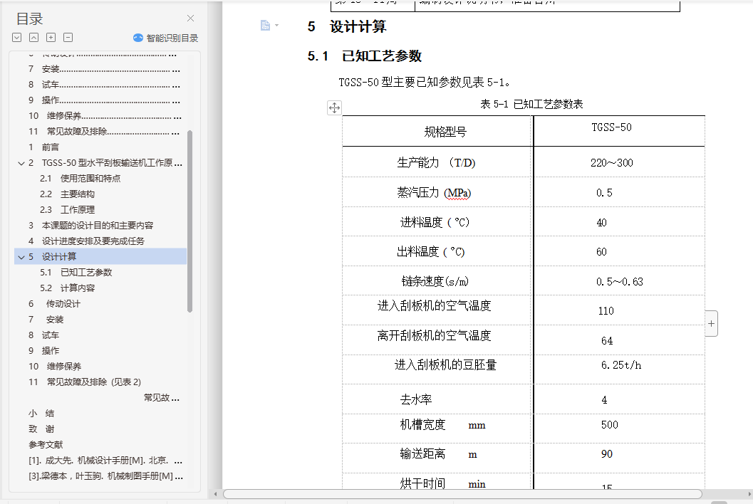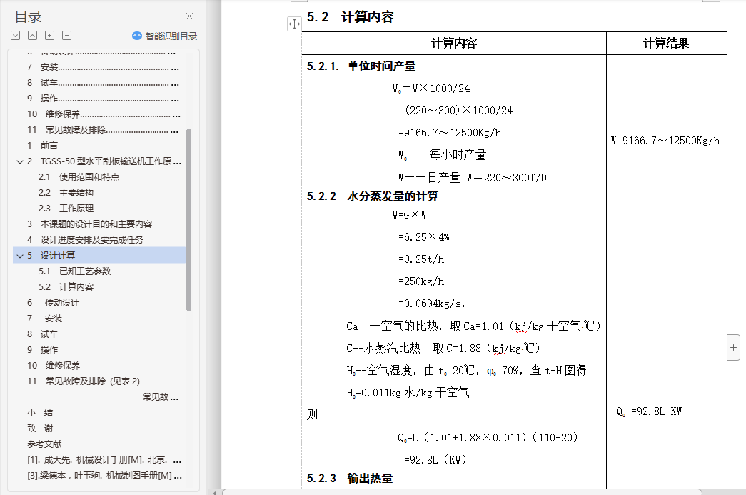 目 录1 前言…………………………………………………………………………… 12 水平刮板输送机工作原理和特点…………………………………………… 32.1 使用范围和特点…………………………………………………………… 32.2 主要结构 ………………………………………………………………… 42.3 工作原理…………………………………………………………………… 43 本课题的设计目的和主要内容……………………………………………… 54 设计进度安排及要完成任务………………………………………………… 55 设计计算……………………………………………………………………… 65.1 已知工艺参数……………………………………………………………… 65.2 计算内容…………………………………………………………………… 75.2.1. 单位时间产量…………………………………………………………… 75.2.2 水分蒸发量的计算……………………………………………………… 75.2.3 输出热量………………………………………………………………… 75.2.4 空气消耗……………………………………………………………………85.2.5 风机风量的计算……………………………………………………………85.2.6 换热量的计算………………………………………………………………95.2.7 加热蒸汽消耗量的计算……………………………………………………95.2.8 换热面积的计算……………………………………………………………96 传动设计……………………………………………………………………… 106.1 减速机选型……………………………………………………………………106.2 联轴器选择………………………………………………………………… 116.3 齿轮计算………………………………………………………………………117 安装………………………………………………………………………………168 试车………………………………………………………………………………179 操作………………………………………………………………………………1710 维修保养……………………………………………………………………… 1811 常见故障及排除…………………………………………………………… 18结束语…………………………………………………………………………… 19致谢……………………………………………………………………………… 21参考文献…………………………………………………………………………… 22