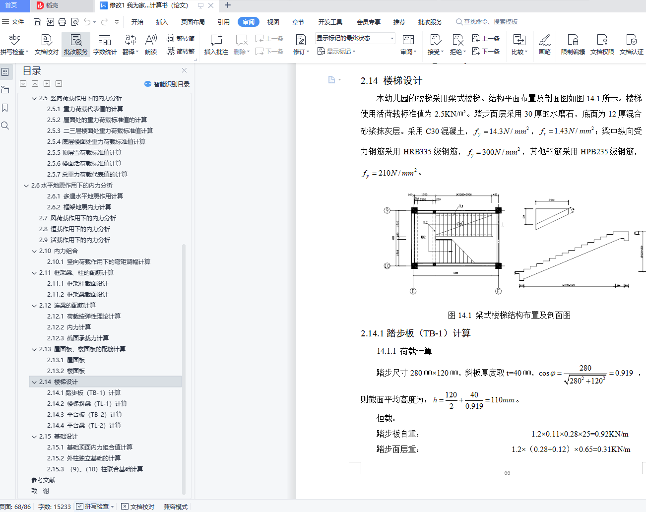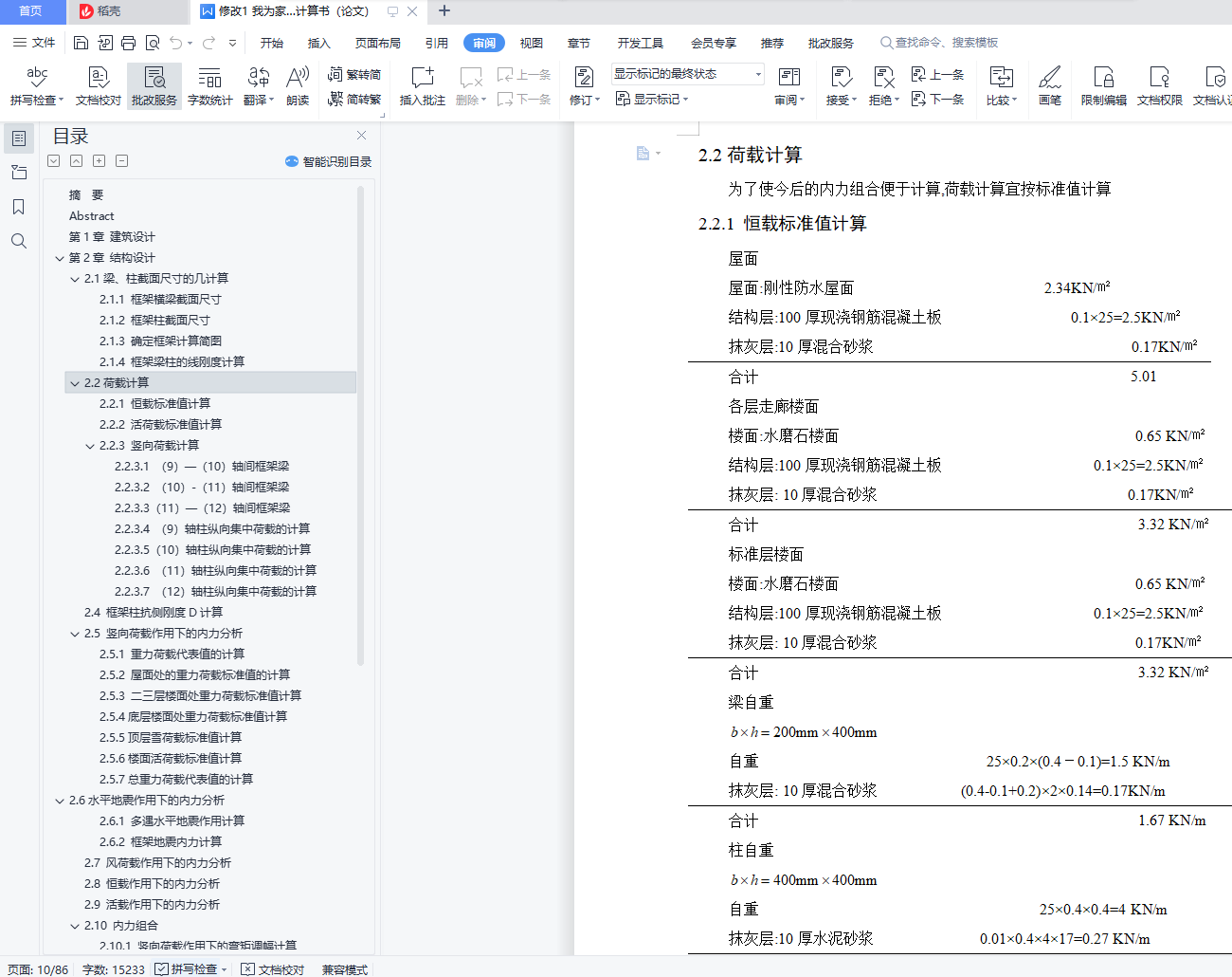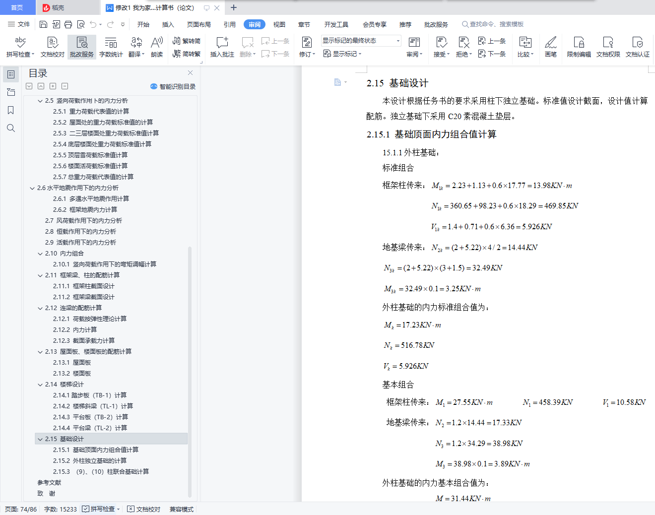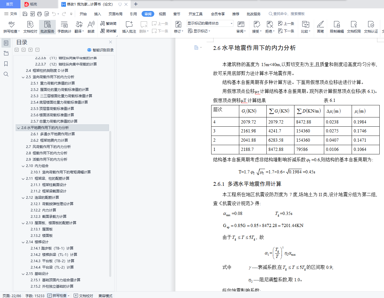 目 录摘 要 1Abstract 2第1章 建筑设计 3第2章 结构设计 42.1梁、柱截面尺寸的几计算 42.1.1 框架横梁截面尺寸 42.1.2 框架柱截面尺寸 42.1.3 确定框架计算简图 62.1.4 框架梁柱的线刚度计算 62.2荷载计算 82.2.1 恒载标准值计算 82.2.2 活荷载标准值计算 102.2.3 竖向荷载计算 102.4 框架柱抗侧刚度D计算 162.5 竖向荷载作用下的内力分析 172.5.1 重力荷载代表值的计算 172.5.2 屋面处的重力荷载标准值的计算 172.5.3 二三层楼面处重力荷载标准值计算 182.5.4底层楼面处重力荷载标准值计算 192.5.5顶层雪荷载标准值计算 192.5.6楼面活荷载标准值计算 192.5.7总重力荷载代表值的计算 192.6水平地震作用下的内力分析 202.6.1 多遇水平地震作用计算 202.6.2 框架地震内力计算 222.7 风荷载作用下的内力分析 262.8 恒载作用下的内力分析 312.9 活载作用下的内力分析 352.10 内力组合 382.10.1 竖向荷载作用下的弯矩调幅计算 382.11 框架梁、柱的配筋计算 472.11.1 框架柱截面设计 472.11.2 框架梁截面设计 522.12 连梁的配筋计算 582.12.1 荷载按弹性理论计算 582.12.2 内力计算 582.12.3 截面承载力计算 592.13 屋面板、楼面板的配筋计算 592.13.1 屋面板 602.13.2 楼面板 632.14 楼梯设计 662.14.1踏步板(TB-1)计算 662.14.2 楼梯斜梁(TL-1)计算 672.14.3 平台板(TB-2)计算 692.14.4 平台梁(TL-2)计算 692.15 基础设计 722.15.1 基础顶面内力组合值计算 722.15.2 外柱独立基础的计算 732.15.3 (9)、(10)柱联合基础计算 78参考文献 82致 谢 84