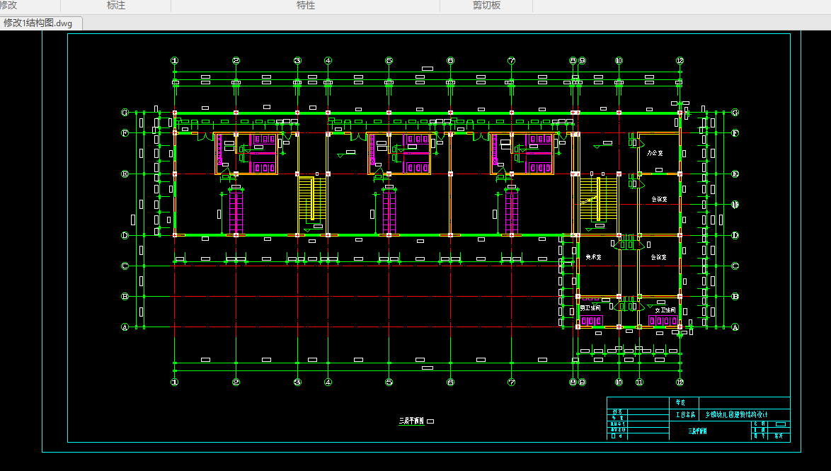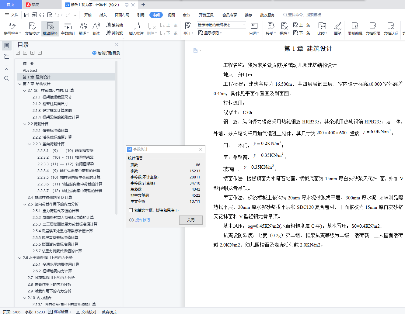 摘 要本次项目为乡镇幼儿园建筑结构设计,拟建一12班的中大型幼儿园,总建筑面积控制在3000M2左右,主体建筑不超过三层。根据建筑的使用功能要求,本幼儿园为框架结构;工程采用混凝土框架结构,楼板、屋盖、楼梯均采用钢筋混凝土现浇。本工程以手算优先,用结构专业辅助软件PKPM计算整体结构的配筋面积。根据配筋面积进行绘图。第⑤轴横向框架为本次手算的任务,明确其计算简图与各个计算参数;然后根据建筑做法确定其所受的恒载、活载、风载、地震作用,计算梁、柱、板与基础的内力进行内力组合后得到各截面的控制内力;最后进行各构件的配筋计算。根据工程地质资料,结构采用独立基础。关键词:家乡建设;幼儿园;建筑;结构;计算AbstractThis project is the architectural structure design of township kindergartens. It is planned to be a large kindergarten. The total construction area is controlled at about 3000M2, and the main building is no more than three floors.According to the use function requirements of the building, the kindergarten is a frame structure; the project adopts concrete frame structure, floor, roof and stairs are cast-in-place reinforced concrete.The project is given priority by hand, and the reinforcement area of the overall structure is calculated by the structural professional auxiliary software PKPM.Dratted according to the reinforcement area.The horizontal frame of ⑤ -axis is the task of manual calculation, clarify the calculation diagram and each calculation parameters; then determine the constant load, live load, wind load and seismic action, according to the construction practice, calculate the internal force of beam, column, plate and foundation to control the internal force of each section; finally calculate the reinforcement of each component.According to the engineering geological data, the structure adopts an independent basis.Key words: hometown construction; kindergarten; construction; structure; calculation