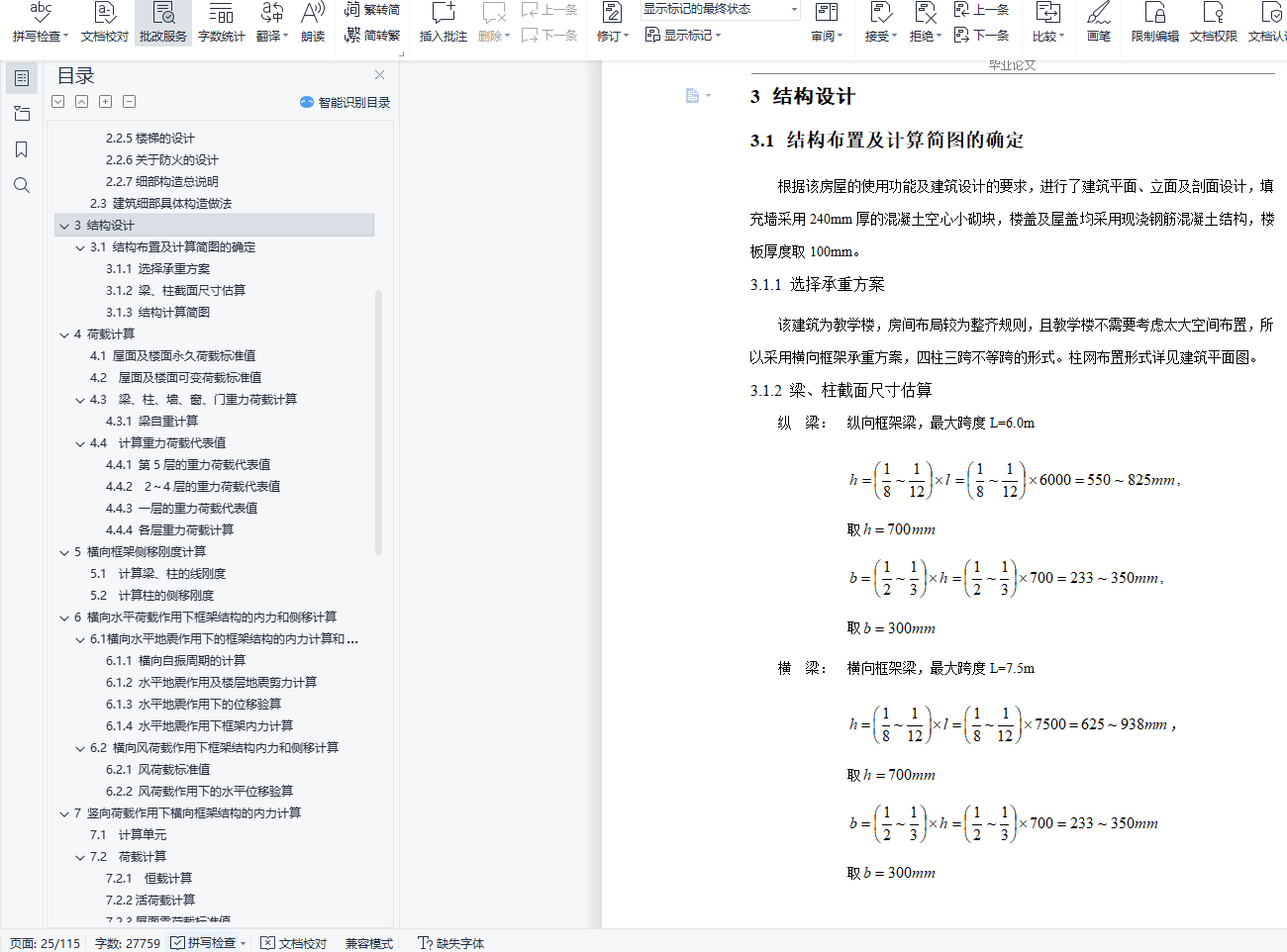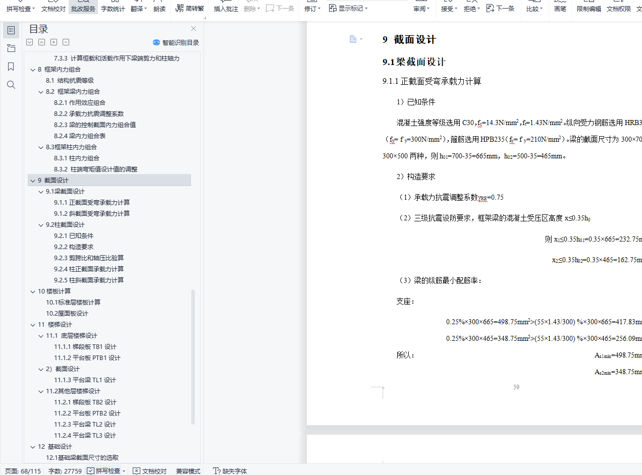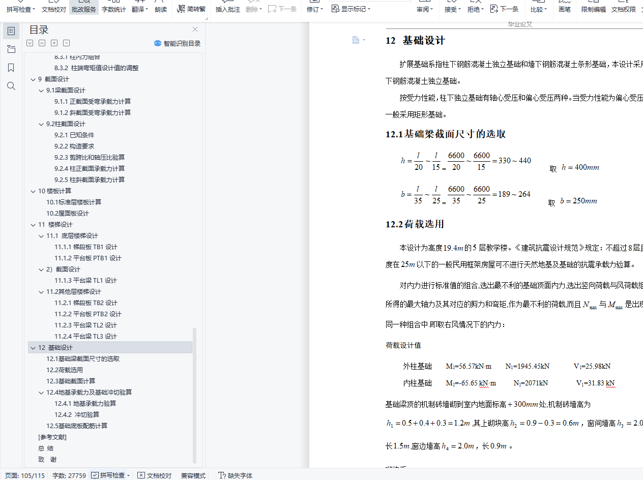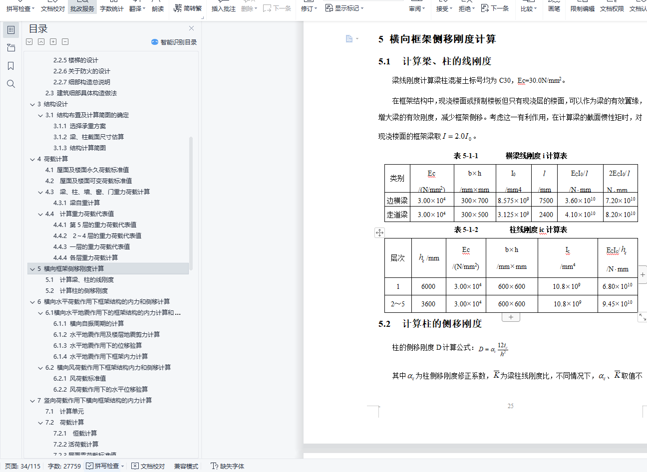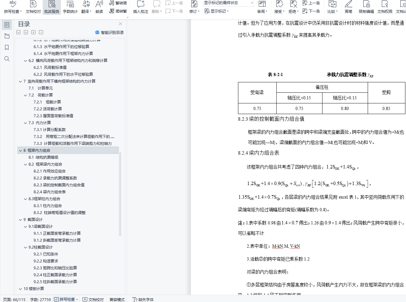 结构设计以手算为主,主要以横向一榀框架的内力计算和配筋为主。计算内容包括重力荷载计算,框架刚度计算,水平荷载作用下框架结构的内力和侧移计算、竖向荷载作用下框架结构的内力计算、内力组合、框架梁柱的截面配筋计算、罕遇地震作用下弹塑性变形验算、楼梯和楼板的配筋计算以及基础设计。绘制了基础平面布置图、所计算横向一榀框架的基础详图和配筋图,标准层柱、梁平法配筋图,标准层楼板和楼梯的配筋图等。