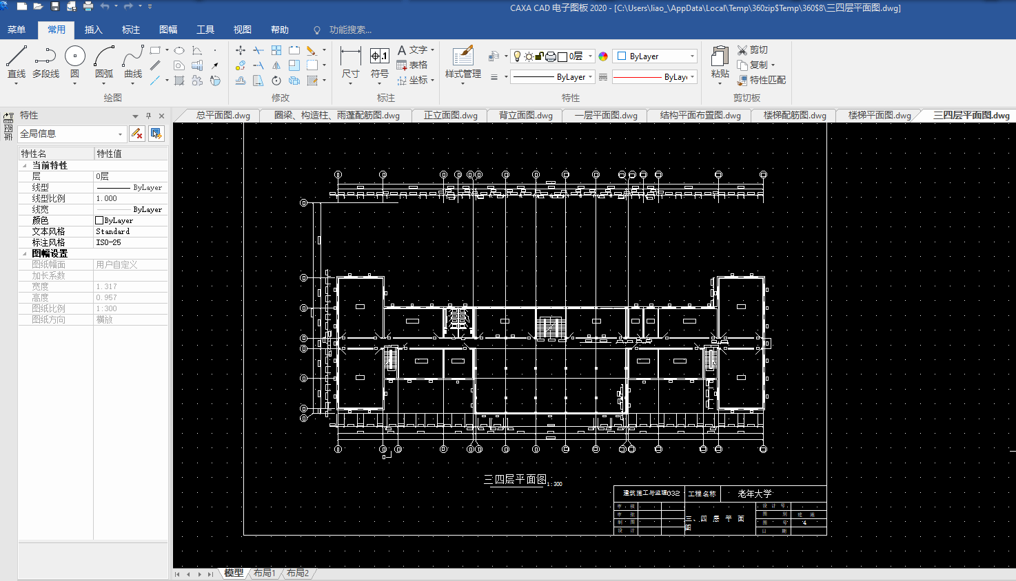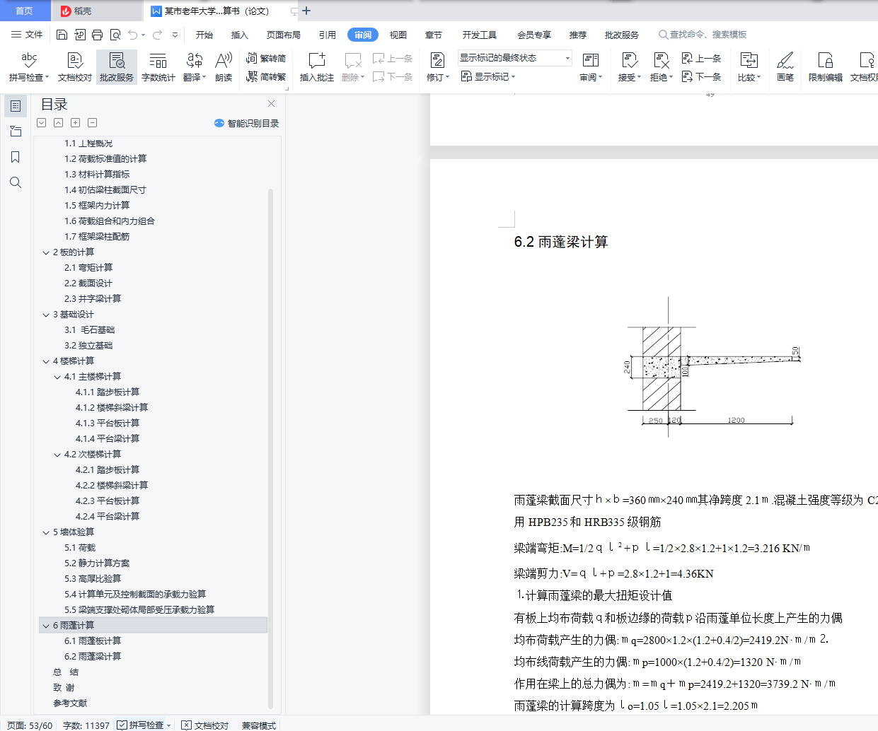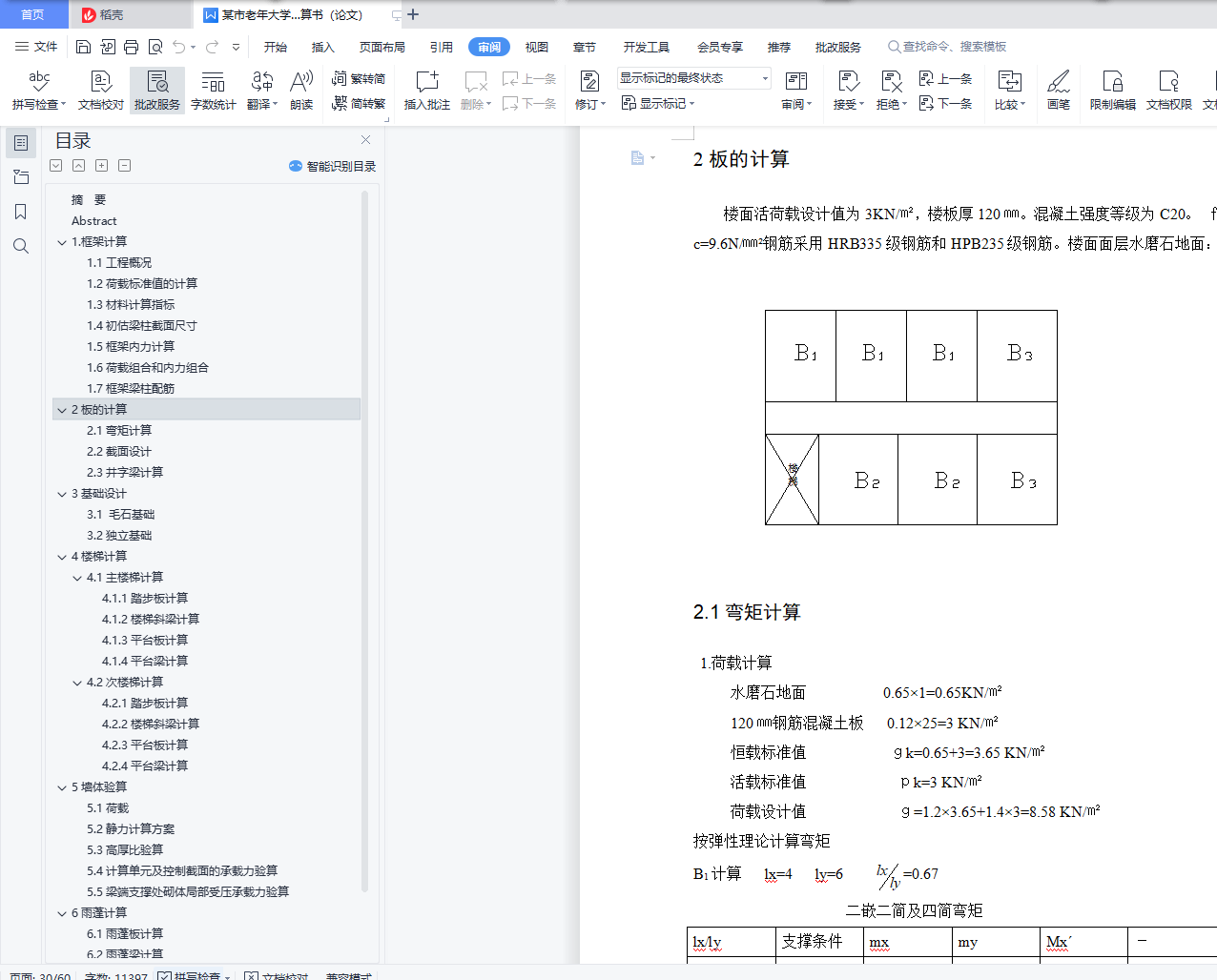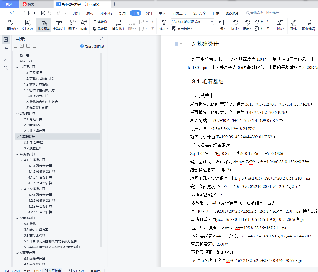 摘 要随着我国国民经济的高速发展,居民生活水平的普遍提高,社会的结构也在悄然发生变化,许多新的社会问题开始出现,其中"老龄社会"已经成为全国乃至全世界密切关注的一个重要课题。面对"老龄化"的挑战,如何使老年人"老有所养、老有所医、老有所学、老有所乐"已经引起了政府和理论界的高度重视。如何创造适宜老年人生活环境,提高老年人的生活质量,总结完善相关设计策略方法,是目前急需研究的课题。老年教育是解决社会老龄化的一个重要方面。本次设计为某市老年大学建筑结构设计,总面积为6000平米,本文介绍了老年大学建筑结构设计的全过程,包括结构的选型,结构设计与抗震分析。该工程结构存在错层,大空间,反向曲面屋面,可为同类工程设计提供参考。关键词:老年大学;活动中心;建筑设计;结构设计;CAD设计AbstractWith the rapid development of China's national economy, the general improvement of residents' living standards, the structure of the society is also quietly changing, and many new social problems began to appear, among which the "aging society" has become an important topic of close attention to the whole country and even the whole world.In the face of the challenge of "aging", how to make the elderly "care, care, learning, the elderly" has attracted the great attention of the government and the theoretical community.How to create a suitable living environment for the elderly, improve the quality of life of the elderly, and summarize and improve the relevant design strategies and methods are urgent research topics at present.Education for the elderly is an important aspect of solving social aging.This design is the architectural structure design of a university for the aged in a city, with a total area of 6,000 square meters. This paper introduces the whole process of the architectural structure design of a university for the aged, including the selection of the structure, structural design and seismic analysis.The engineering structure has the wrong layer, large space and reverse curved roof, which can provide reference for similar engineering design.Key words: university for the elderly; activity center; architectural design; structural design; CAD design目 录摘 要 IAbstract II1.框架计算 11.1工程概况 11.2荷载标准值的计算 21.3材料计算指标 31.4初估梁柱截面尺寸 41.5框架内力计算 61.6荷载组合和内力组合 151.7框架梁柱配筋 222板的计算 262.1弯矩计算 262.2截面设计 282.3井字梁计算 293基础设计 313.1 毛石基础 313.2独立基础 324楼梯计算 354.1主楼梯计算 354.1.1踏步板计算 364.1.2楼梯斜梁计算 374.1.3平台板计算 384.1.4平台梁计算 384.2次楼梯计算 394.2.1踏步板计算 404.2.2楼梯斜梁计算 414.2.3平台板计算 434.2.4平台梁计算 435墙体验算 455.1荷载 455.2静力计算方案 465.3高厚比验算 465.4计算单元及控制截面的承载力验算 465.5梁端支撑处砌体局部受压承载力验算 486雨蓬计算 496.1雨蓬板计算 496.2雨蓬梁计算 50总 结 53致 谢 54参考文献 55