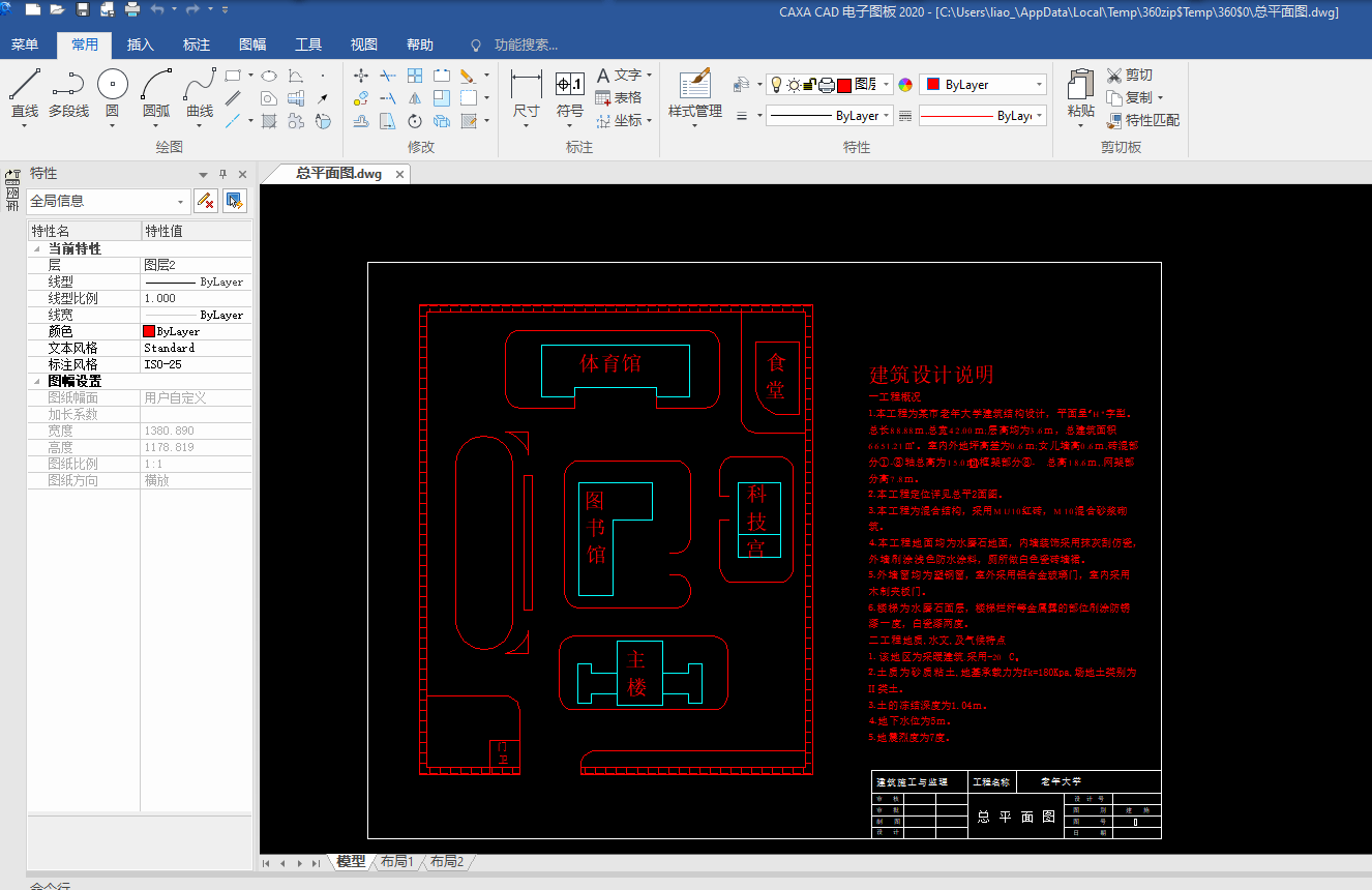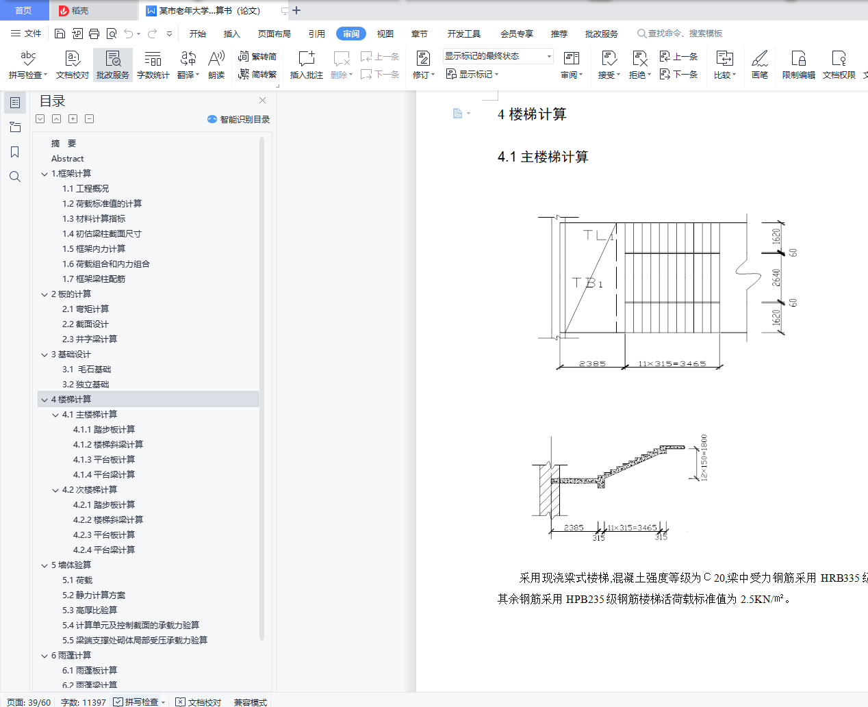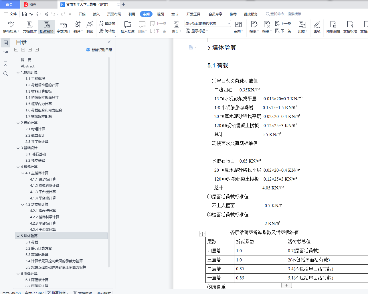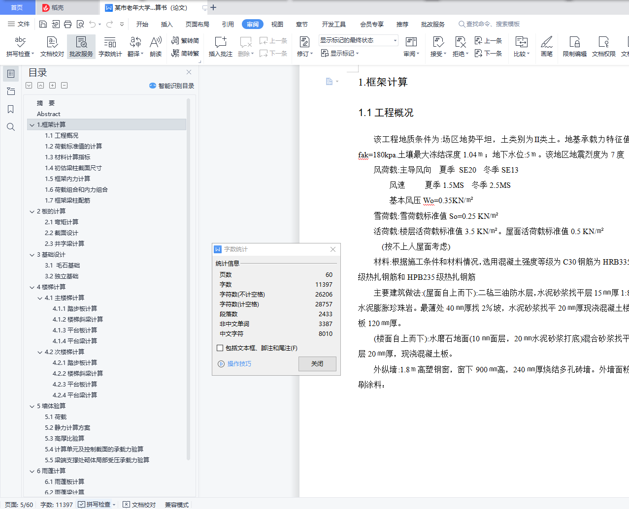 摘 要随着我国国民经济的高速发展,居民生活水平的普遍提高,社会的结构也在悄然发生变化,许多新的社会问题开始出现,其中"老龄社会"已经成为全国乃至全世界密切关注的一个重要课题。面对"老龄化"的挑战,如何使老年人"老有所养、老有所医、老有所学、老有所乐"已经引起了政府和理论界的高度重视。如何创造适宜老年人生活环境,提高老年人的生活质量,总结完善相关设计策略方法,是目前急需研究的课题。老年教育是解决社会老龄化的一个重要方面。本次设计为某市老年大学建筑结构设计,总面积为6000平米,本文介绍了老年大学建筑结构设计的全过程,包括结构的选型,结构设计与抗震分析。该工程结构存在错层,大空间,反向曲面屋面,可为同类工程设计提供参考。关键词:老年大学;活动中心;建筑设计;结构设计;CAD设计AbstractWith the rapid development of China's national economy, the general improvement of residents' living standards, the structure of the society is also quietly changing, and many new social problems began to appear, among which the "aging society" has become an important topic of close attention to the whole country and even the whole world.In the face of the challenge of "aging", how to make the elderly "care, care, learning, the elderly" has attracted the great attention of the government and the theoretical community.How to create a suitable living environment for the elderly, improve the quality of life of the elderly, and summarize and improve the relevant design strategies and methods are urgent research topics at present.Education for the elderly is an important aspect of solving social aging.This design is the architectural structure design of a university for the aged in a city, with a total area of 6,000 square meters. This paper introduces the whole process of the architectural structure design of a university for the aged, including the selection of the structure, structural design and seismic analysis.The engineering structure has the wrong layer, large space and reverse curved roof, which can provide reference for similar engineering design.Key words: university for the elderly; activity center; architectural design; structural design; CAD design目 录摘 要 IAbstract II1.框架计算 11.1工程概况 11.2荷载标准值的计算 21.3材料计算指标 31.4初估梁柱截面尺寸 41.5框架内力计算 61.6荷载组合和内力组合 151.7框架梁柱配筋 222板的计算 262.1弯矩计算 262.2截面设计 282.3井字梁计算 293基础设计 313.1 毛石基础 313.2独立基础 324楼梯计算 354.1主楼梯计算 354.1.1踏步板计算 364.1.2楼梯斜梁计算 374.1.3平台板计算 384.1.4平台梁计算 384.2次楼梯计算 394.2.1踏步板计算 404.2.2楼梯斜梁计算 414.2.3平台板计算 434.2.4平台梁计算 435墙体验算 455.1荷载 455.2静力计算方案 465.3高厚比验算 465.4计算单元及控制截面的承载力验算 465.5梁端支撑处砌体局部受压承载力验算 486雨蓬计算 496.1雨蓬板计算 496.2雨蓬梁计算 50总 结 53致 谢 54参考文献 55