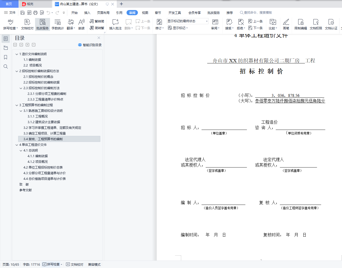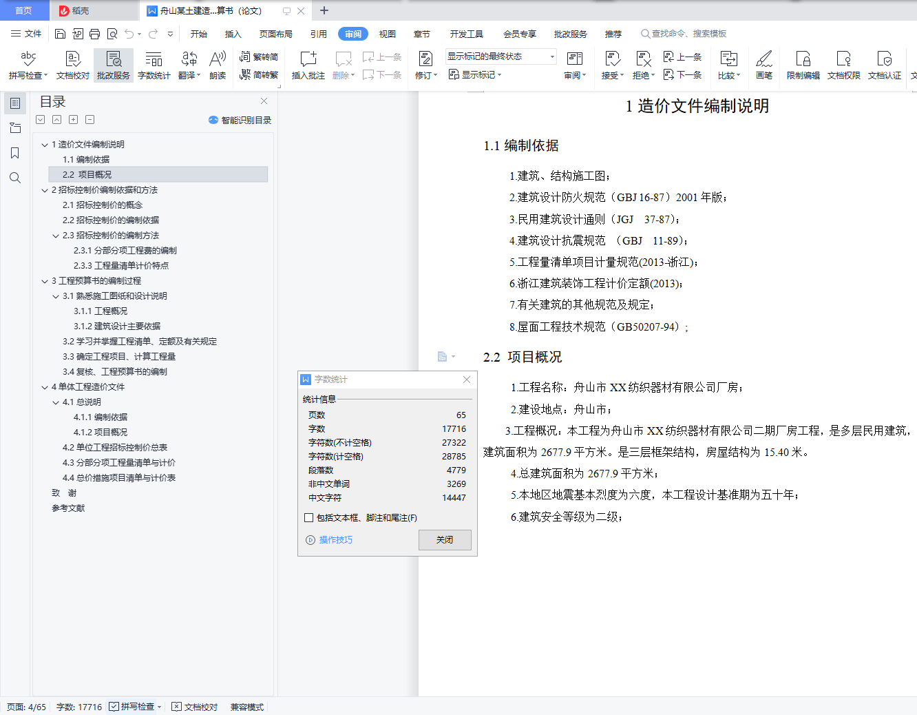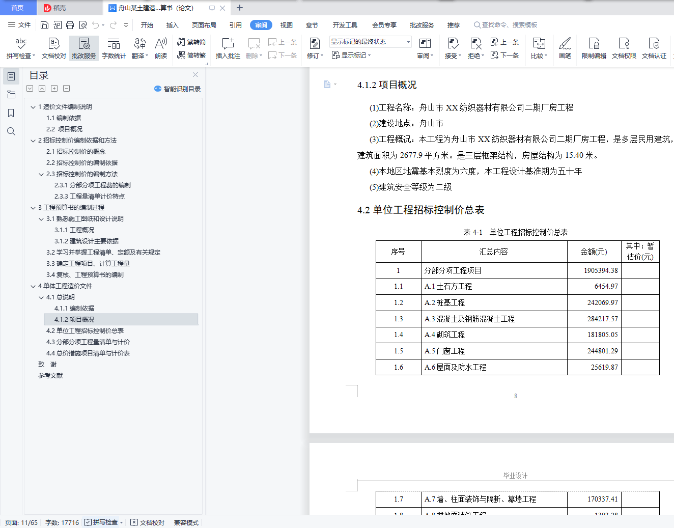 摘要随着现代经济的不断发展,建筑行业已经到了前所未有的发展阶段,而且在我国的经济发展中,建筑业的发展又起着至关重要的作用,与我国的经济命脉息息相关。在规模庞大的项目建设过程中,如何在投资中降低成本、提高收益,是每个建筑投资者所面临的问题,而建筑工程预算就是建筑企业在施工中依据国家的相关的法律法规,准确科学地评估了工程在每个施工步骤和施工顺序中所需要投入的资金,并且对各个阶段投入的资金进行有效的合理的配置,所以工程预算在实际的工程项目建设中有着十分重要的作用。只有建筑工程预算的作用得到最大化的发挥,合理的控制工程造价、有效使用投入资金、科学分配施工资料和人员,才能达到控制企业成本、提高企业利润的目的。工程采用施工图预算编制方法,施工图预算作为建筑工程造价的重要依据,是招标、投标、签订施工合同、工程施工管理和竣工决算的重要文件,根据具体工程采取科学合理的方法编制施工图预算,对确保工程造价的准确性具有十分重要的意义。毕业设计过程中,通过熟悉图纸、图集、定额了解工程基本情况根据工程量计算基础工程、混凝土工程、砌筑工程钢筋工程、装饰装修工程,选取广联达软件套用浙江地区清单得出工程项目总造价。关键词:土建工程;施工图预算;工程量;总造价;工程量清单ABSTRACTWith the continuous development of modern economy, the construction industry has reached an unprecedented development stage, and in China's economic development, the development of the construction industry plays a vital role, which is closely related to China's economic lifeline.In the process of large project construction, how to reduce the cost and improve income in investment, is the problem faced by each construction investor, and the construction project budget is the construction enterprise according to the national laws and regulations, accurately and scientifically evaluate the project in each construction step and construction order, and effective reasonable allocation of funds in each stage, so the project budget has a very important role in the actual project construction.Only when the role of construction project budget is maximized, reasonable control of project cost, effective use of investment funds, and scientific allocation of construction materials and personnel, can the purpose of controlling enterprise costs and improving enterprise profits be achieved.Project using construction drawing budget method, construction drawing budget as an important basis for construction project cost, is the bidding, bidding, construction contract, project construction management and completion final accounts of important documents, according to the specific project take scientific and reasonable method to prepare construction drawing budget, to ensure the accuracy of the project cost has of great significance.In the process of graduation design, through familiar with the drawings, atlas, quota to understand the basic situation of the basic engineering, concrete engineering, masonry engineering reinforcement engineering, decoration engineering, select Guangda software to apply the list of Zhejiang region to obtain the total cost of the project.Key words: civil engineering; construction drawing budget; project quantity; total cost; bill of quantities目 录1造价文件编制说明 11.1编制依据 12.2 项目概况 12招标控制价编制依据和方法 22.1招标控制价的概念 22.2招标控制价的编制依据 22.3招标控制价的编制方法 22.3.1分部分项工程费的编制 22.3.3其他项目费应按下列规定计价 32.3.3工程量清单计价特点 33工程预算书的编制过程 53.1熟悉施工图纸和设计说明 53.1.1工程概况 53.1.2建筑设计主要依据 53.2学习并掌握工程清单、定额及有关规定 53.3确定工程项目、计算工程量 53.4复核、工程预算书的编制 54单体工程造价文件 74.1总说明 84.1.1编制依据 84.1.2项目概况 84.2单位工程招标控制价总表 84.3分部分项工程量清单与计价 104.4总价措施项目清单与计价表 17致 谢 60参考文献 61