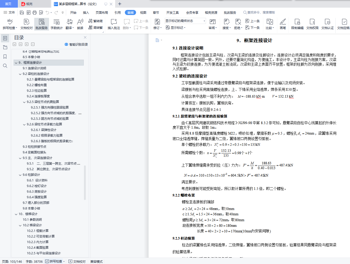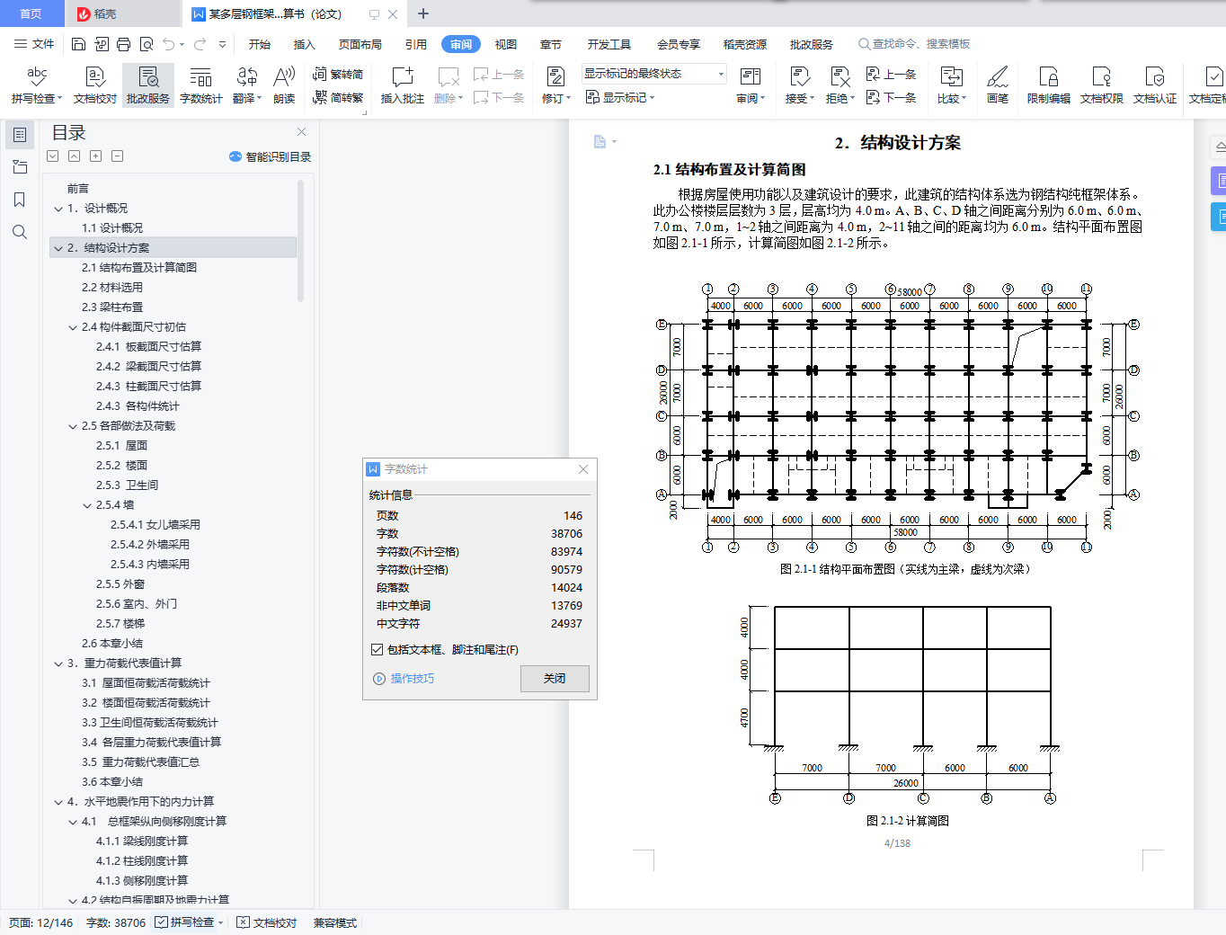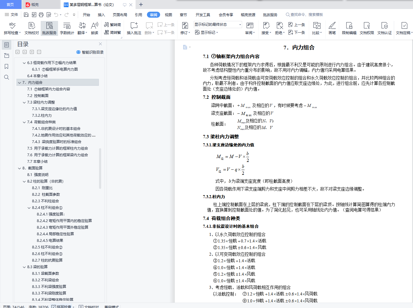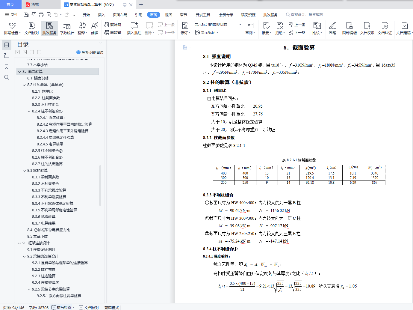 目 录【摘要】 1【关键词】 1前言 21.设计概况 31.1设计概况 32.结构设计方案 42.1结构布置及计算简图 42.2材料选用 52.3梁柱布置 52.4构件截面尺寸初估 52.4.1 板截面尺寸估算 52.4.2 梁截面尺寸估算 52.4.3 柱截面尺寸估算 62.4.3 各构件统计 72.5各部做法及荷载 82.5.1 屋面 82.5.2 楼面 82.5.3 卫生间 82.5.4墙 82.5.5外窗 92.5.6室内、外门 92.5.7楼梯 92.6本章小结 93.重力荷载代表值计算 103.1 屋面恒荷载活荷载统计 103.2 楼面恒荷载活荷载统计 103.3卫生间恒荷载活荷载统计 103.4 各层重力荷载代表值计算 103.5 重力荷载代表值汇总 123.6本章小结 124.水平地震作用下的内力计算 134.1 总框架纵向侧移刚度计算 134.1.1梁线刚度计算 134.1.2柱线刚度计算 144.1.3侧移刚度计算 164.2结构自振周期及地震力计算 194.2.1结构横向自振周期计算 194.2.2水平地震作用下横向地震力计算 204.2.3水平地震作用下横向位移验算 214.3水平地震作用下纵向框架结构的内力计算 224.3.1柱弯矩值及剪力值计算 224.3.2梁弯矩值及剪力值计算 234.3.3柱轴力计算 244.3.4 ⑦榀框架手电算内力图 254.3.5电算与手算误差分析 314.4本章小结 315.左风荷载作用下的内力计算 325.1 左风荷载作用计算 325.2 左风荷载作用下电算内力图 335.3 小结 366.竖向荷载作用下框架结构的内力计算 376.1 ⑦榀框架竖向荷载统计 376.1.1 墙线荷载计算 376.1.2 三层荷载 376.1.3 一、二层荷载 386.1.4 恒活荷载布置图 406.2活荷载作用下⑦榀框架内力计算 426.2.1各构件相对线刚度计算 426.2.2梁端弯矩计算 426.2.3分配系数计算以及端部弯矩计算 436.2.4分层法时梁端内力图 496.2.5剪力统计 536.2.6轴力统计 546.2.7 ⑦榀框架手电算内力图 556.2.8手电算误差分析 616.3恒荷载作用下⑦榀内力结果 626.3.1 ⑦榀框架手电算内力图 626.4本章小结 657.内力组合 667.1 ⑦轴框架内力组合内容 667.2 控制截面 667.3梁柱内力调整 667.3.1.梁支座边缘处的内力值 667.3.2.柱内力 667.4 荷载组合种类 667.4.1.非抗震设计时的基本组合 667.4.2.地震作用效应和其他荷载效应的基本组合 677.4.3 梁挠度验算时的标准组合 677.5 用于承载力计算的框架柱内力组合 677.6 用于承载力计算的框架梁内力组合 777.7本章小结 858.截面验算 868.1 强度说明 868.2柱的验算(非抗震) 868.2.1 刚重比 868.2.2 柱截面参数 868.2.3不利柱组合 868.2.4柱不利组合① 868.2.5柱不利组合② 898.2.6柱不利组合③ 908.2.7柱的抗震验算 908.3梁的验算 918.3.1梁截面参数 918.3.2不利梁组合 918.3.3不利梁强度验算 918.3.3不利梁刚度验算 918.3.4不利梁整体稳定验算 928.3.5不利梁局部稳定性验算 928.3.6抗震验算 928.3.7电算结果 938.4 ⑦轴框架总电算应力比 948.5本章小结 949.框架连接设计 959.1连接设计说明 959.2梁柱的连接设计 959.2.1悬臂梁段与框架梁的连接验算 959.2.2螺栓布置 959.2.3柱边验算 959.2.4连接板厚度 969.2.5梁柱节点抗震验算 969.2.6梁柱节点承载力验算 999.3柱柱拼接节点 1019.4变截面柱接头 1019.5主、次梁连接设计 1019.5.1 二、三层第一跨主、次梁节点设计(7轴) 1019.5.2 其它跨主、次梁节点设计 1029.6柱脚设计 1029.6.1 设计资料 1029.6.2栓钉设计 1039.6.3底板设计 1039.6.4强度验算 1059.7埋入部分的顶部 1059.8本章小结 10610.楼梯设计 10710.1参数说明 10710.2梯梁设计 10710.2.1恒载计算 10710.2.2可变荷载计算 10810.2.3内力计算 10810.2.4截面验算 10810.2.5与平台梁连接设计 10910.2.6底层梯梁连接设计 10910.3踏步设计 10910.3.1荷载及内力计算 11010.3.2截面验算 11010.4平台板设计 11110.4.1荷载及内力计算 11110.4.2配筋计算 11110.5平台梁设计 11110.5.1荷载及内力计算 11110.5.2截面验算 11210.6梯柱设计 11310.7 本章小结 11311 混凝土楼板设计 11411.1参数说明 11411.2 屋面板设计(弹性法) 11411.2.1屋面板结构布置图 11411.2.2荷载统计 11511.2.3 计算跨度及折减方式 11511.2.4跨中及支座弯矩计算 11511.2.5配筋计算 11911.3 楼板设计(塑性法) 12111.3.1楼板结构布置图 12111.3.2荷载计算 12211.3.3 计算跨度及折减方式 12211.3.4跨中及支座弯矩计算 12311.3.5配筋计算 12611.4 构造要求 12811.5楼板与框架钢梁的连接 12911.6 本章小结 12912.地基基础设计 13012.1参数说明 13012.2地基变形验算 13012.3基础尺寸估算 13012.4计算基础梁内力 13112.5基础底板计算 13212.6肋梁计算 13312.6.1正截面强度计算 13312.6.2斜截面强度计算 13312.7抗震验算 13412.8构造要求 13412.9 本章小结 13413.总结 135参考文献 136致谢 137【Abstract】 138【Keyword】 138【摘要】本案为某办公楼钢结构及施工图设计。实体工程为钢框架办公楼,该建筑地上为三层,突出屋面层一层,地下零层,总建筑面积为4707.05平方米。此办公楼为钢框架结构,具有强度高、塑性韧性好、重量轻、制作简单、施工工期短等优点,但同时钢结构也具有耐热不耐火、耐腐性差等缺点,所以设计此办公楼的时候采取了充分的预防措施。水平地震作用采用底部剪力法来计算;侧移刚度和结构的自振周期用D值法计算;竖向荷载下的结构内力用分层法计算;考虑有地震和无地震两种方式组合有关的内力效应。整个设计符合现行结构设计规范要求,保证结构有足够的抗震性能,从而实现“小震不坏,中震可修,大震不倒”的设防目标。【关键词】钢框架结构 抗震设计 内力组合【Abstract】 The design of this project is analyse of the multi-layered steel construction of office building and designed of the detail drawing . The structural style is the multi-layered steel porta