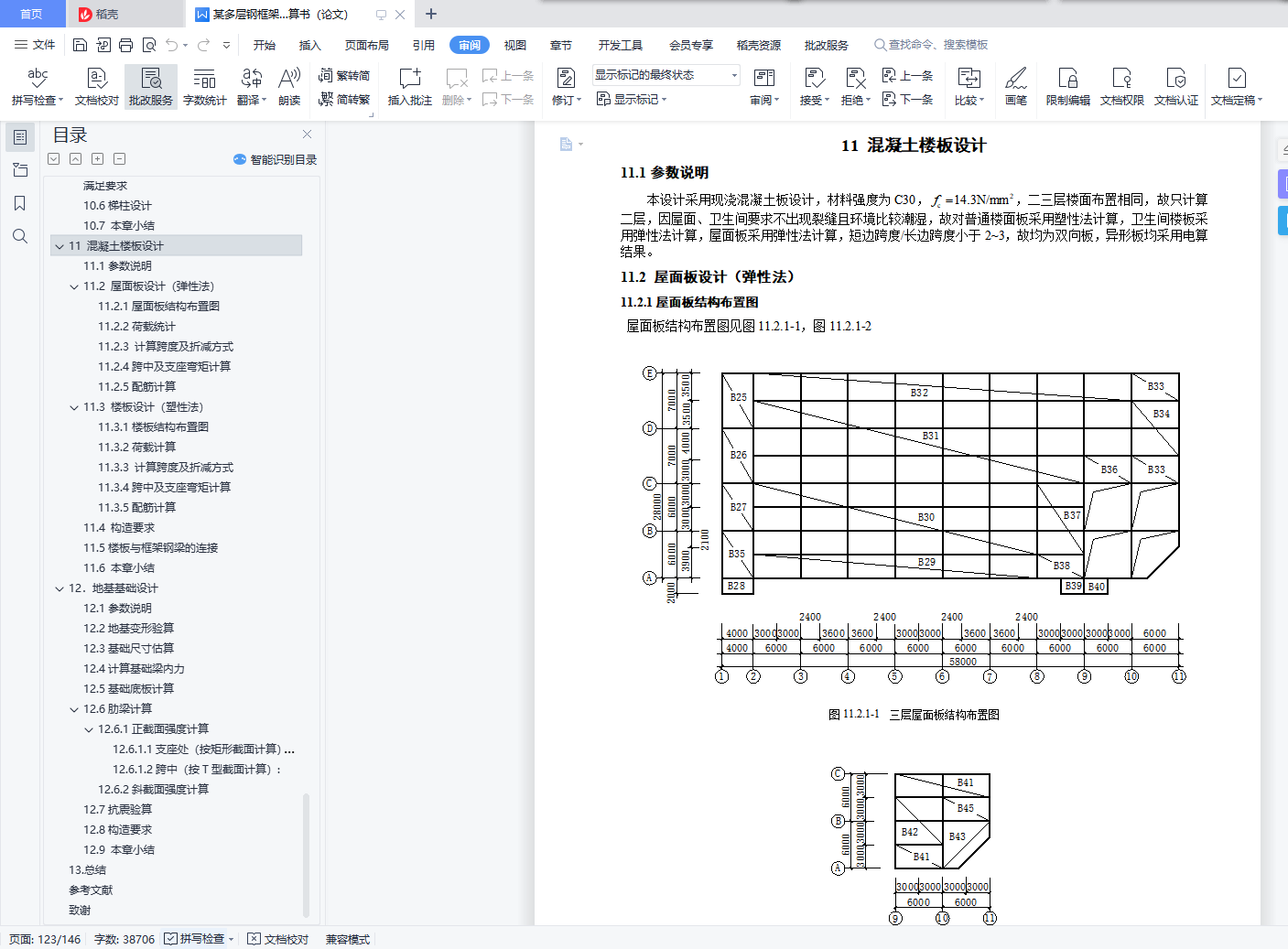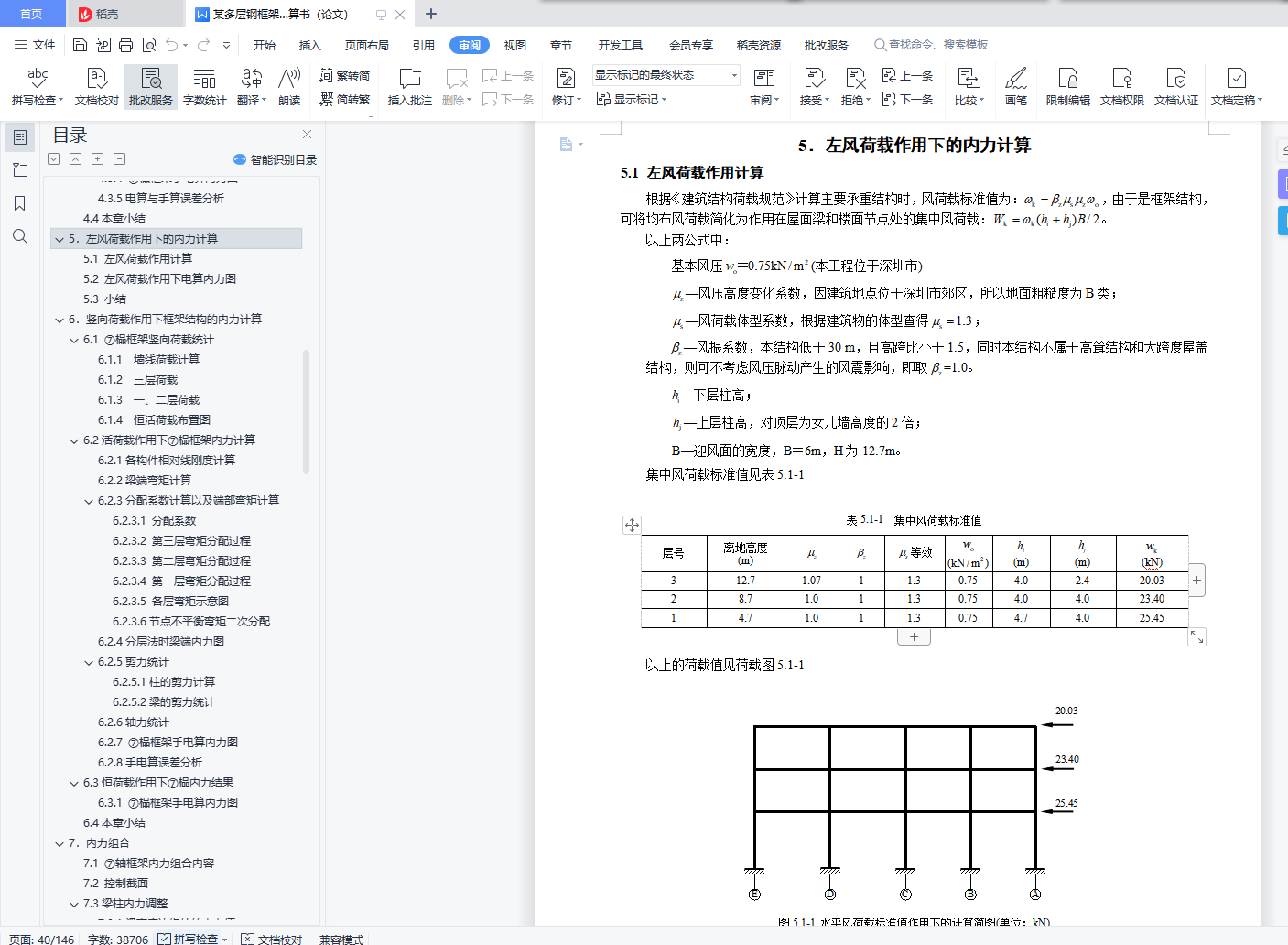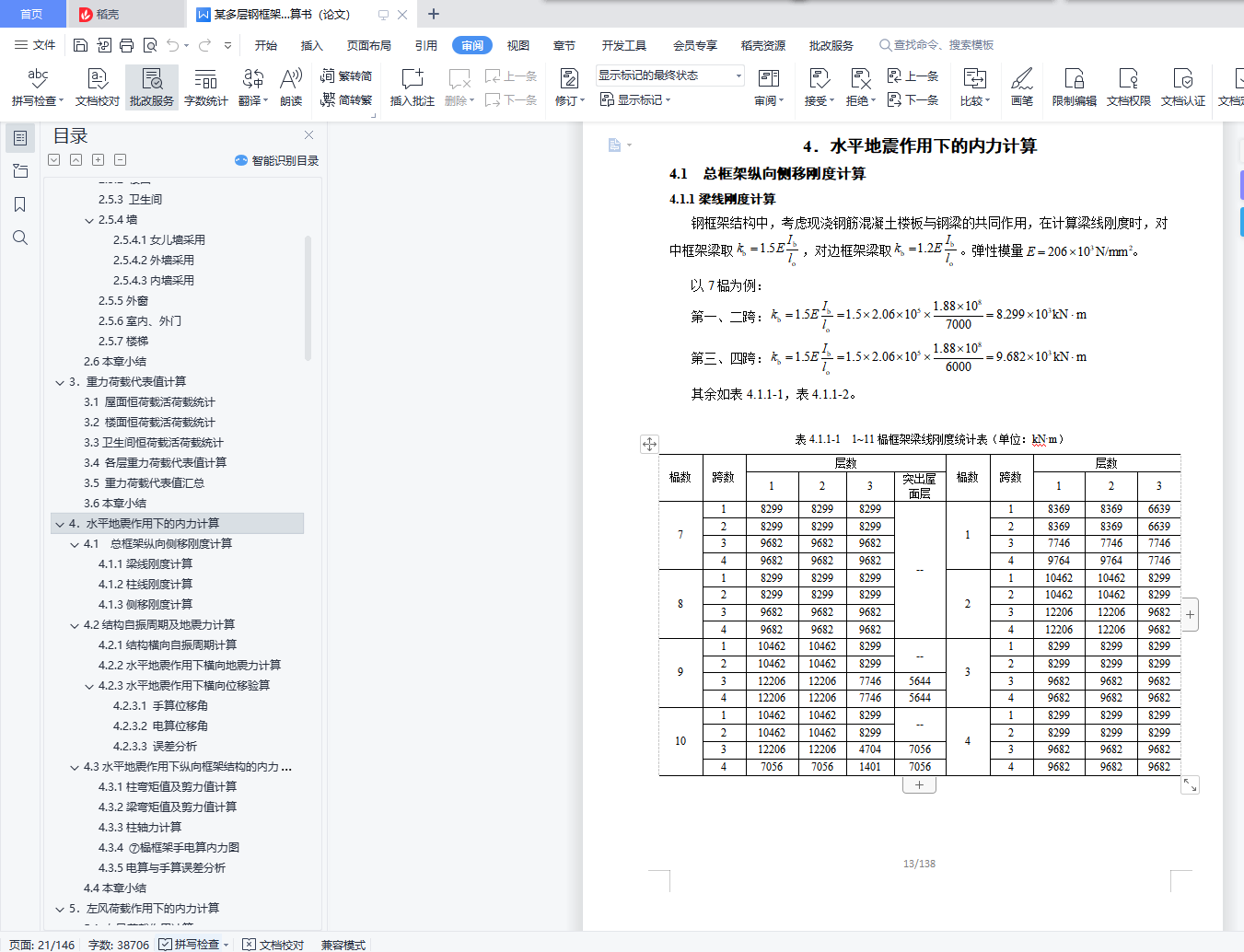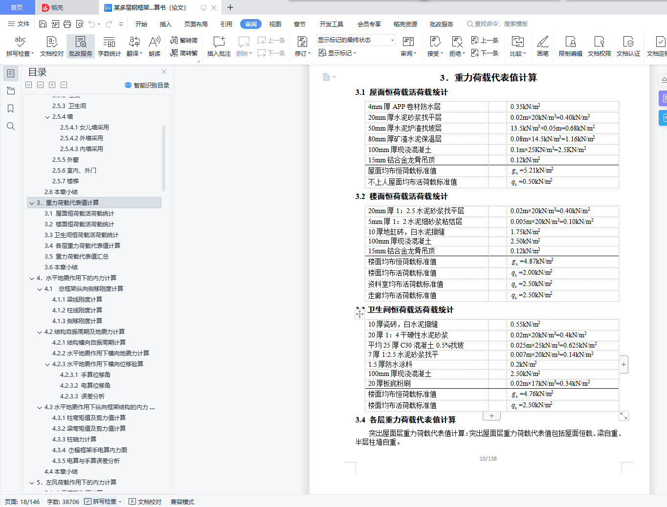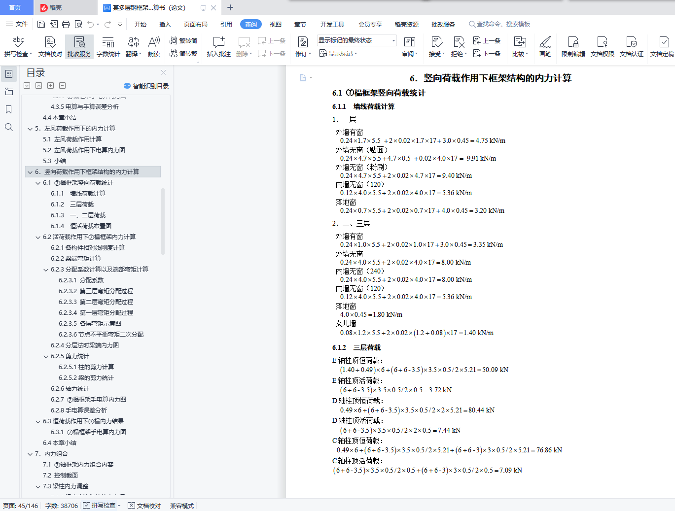 目 录【摘要】 1【关键词】 1前言 21.设计概况 31.1设计概况 32.结构设计方案 42.1结构布置及计算简图 42.2材料选用 52.3梁柱布置 52.4构件截面尺寸初估 52.4.1 板截面尺寸估算 52.4.2 梁截面尺寸估算 52.4.3 柱截面尺寸估算 62.4.3 各构件统计 72.5各部做法及荷载 82.5.1 屋面 82.5.2 楼面 82.5.3 卫生间 82.5.4墙 82.5.5外窗 92.5.6室内、外门 92.5.7楼梯 92.6本章小结 93.重力荷载代表值计算 103.1 屋面恒荷载活荷载统计 103.2 楼面恒荷载活荷载统计 103.3卫生间恒荷载活荷载统计 103.4 各层重力荷载代表值计算 103.5 重力荷载代表值汇总 123.6本章小结 124.水平地震作用下的内力计算 134.1 总框架纵向侧移刚度计算 134.1.1梁线刚度计算 134.1.2柱线刚度计算 144.1.3侧移刚度计算 164.2结构自振周期及地震力计算 194.2.1结构横向自振周期计算 194.2.2水平地震作用下横向地震力计算 204.2.3水平地震作用下横向位移验算 214.3水平地震作用下纵向框架结构的内力计算 224.3.1柱弯矩值及剪力值计算 224.3.2梁弯矩值及剪力值计算 234.3.3柱轴力计算 244.3.4 ⑦榀框架手电算内力图 254.3.5电算与手算误差分析 314.4本章小结 315.左风荷载作用下的内力计算 325.1 左风荷载作用计算 325.2 左风荷载作用下电算内力图 335.3 小结 366.竖向荷载作用下框架结构的内力计算 376.1 ⑦榀框架竖向荷载统计 376.1.1 墙线荷载计算 376.1.2 三层荷载 376.1.3 一、二层荷载 386.1.4 恒活荷载布置图 406.2活荷载作用下⑦榀框架内力计算 426.2.1各构件相对线刚度计算 426.2.2梁端弯矩计算 426.2.3分配系数计算以及端部弯矩计算 436.2.4分层法时梁端内力图 496.2.5剪力统计 536.2.6轴力统计 546.2.7 ⑦榀框架手电算内力图 556.2.8手电算误差分析 616.3恒荷载作用下⑦榀内力结果 626.3.1 ⑦榀框架手电算内力图 626.4本章小结 657.内力组合 667.1 ⑦轴框架内力组合内容 667.2 控制截面 667.3梁柱内力调整 667.3.1.梁支座边缘处的内力值 667.3.2.柱内力 667.4 荷载组合种类 667.4.1.非抗震设计时的基本组合 667.4.2.地震作用效应和其他荷载效应的基本组合 677.4.3 梁挠度验算时的标准组合 677.5 用于承载力计算的框架柱内力组合 677.6 用于承载力计算的框架梁内力组合 777.7本章小结 858.截面验算 868.1 强度说明 868.2柱的验算(非抗震) 868.2.1 刚重比 868.2.2 柱截面参数 868.2.3不利柱组合 868.2.4柱不利组合① 868.2.5柱不利组合② 898.2.6柱不利组合③ 908.2.7柱的抗震验算 908.3梁的验算 918.3.1梁截面参数 918.3.2不利梁组合 918.3.3不利梁强度验算 918.3.3不利梁刚度验算 918.3.4不利梁整体稳定验算 928.3.5不利梁局部稳定性验算 928.3.6抗震验算 928.3.7电算结果 938.4 ⑦轴框架总电算应力比 948.5本章小结 949.框架连接设计 959.1连接设计说明 959.2梁柱的连接设计 959.2.1悬臂梁段与框架梁的连接验算 959.2.2螺栓布置 959.2.3柱边验算 959.2.4连接板厚度 969.2.5梁柱节点抗震验算 969.2.6梁柱节点承载力验算 999.3柱柱拼接节点 1019.4变截面柱接头 1019.5主、次梁连接设计 1019.5.1 二、三层第一跨主、次梁节点设计(7轴) 1019.5.2 其它跨主、次梁节点设计 1029.6柱脚设计 1029.6.1 设计资料 1029.6.2栓钉设计 1039.6.3底板设计 1039.6.4强度验算 1059.7埋入部分的顶部 1059.8本章小结 10610.楼梯设计 10710.1参数说明 10710.2梯梁设计 10710.2.1恒载计算 10710.2.2可变荷载计算 10810.2.3内力计算 10810.2.4截面验算 10810.2.5与平台梁连接设计 10910.2.6底层梯梁连接设计 10910.3踏步设计 10910.3.1荷载及内力计算 11010.3.2截面验算 11010.4平台板设计 11110.4.1荷载及内力计算 11110.4.2配筋计算 11110.5平台梁设计 11110.5.1荷载及内力计算 11110.5.2截面验算 11210.6梯柱设计 11310.7 本章小结 11311 混凝土楼板设计 11411.1参数说明 11411.2 屋面板设计(弹性法) 11411.2.1屋面板结构布置图 11411.2.2荷载统计 11511.2.3 计算跨度及折减方式 11511.2.4跨中及支座弯矩计算 11511.2.5配筋计算 11911.3 楼板设计(塑性法) 12111.3.1楼板结构布置图 12111.3.2荷载计算 12211.3.3 计算跨度及折减方式 12211.3.4跨中及支座弯矩计算 12311.3.5配筋计算 12611.4 构造要求 12811.5楼板与框架钢梁的连接 12911.6 本章小结 12912.地基基础设计 13012.1参数说明 13012.2地基变形验算 13012.3基础尺寸估算 13012.4计算基础梁内力 13112.5基础底板计算 13212.6肋梁计算 13312.6.1正截面强度计算 13312.6.2斜截面强度计算 13312.7抗震验算 13412.8构造要求 13412.9 本章小结 13413.总结 135参考文献 136致谢 137【Abstract】 138【Keyword】 138【摘要】本案为某办公楼钢结构及施工图设计。实体工程为钢框架办公楼,该建筑地上为三层,突出屋面层一层,地下零层,总建筑面积为4707.05平方米。此办公楼为钢框架结构,具有强度高、塑性韧性好、重量轻、制作简单、施工工期短等优点,但同时钢结构也具有耐热不耐火、耐腐性差等缺点,所以设计此办公楼的时候采取了充分的预防措施。水平地震作用采用底部剪力法来计算;侧移刚度和结构的自振周期用D值法计算;竖向荷载下的结构内力用分层法计算;考虑有地震和无地震两种方式组合有关的内力效应。整个设计符合现行结构设计规范要求,保证结构有足够的抗震性能,从而实现“小震不坏,中震可修,大震不倒”的设防目标。【关键词】钢框架结构 抗震设计 内力组合【Abstract】 The design of this project is analyse of the multi-layered steel construction of office building and designed of the detail drawing . The structural style is the multi-layered steel porta