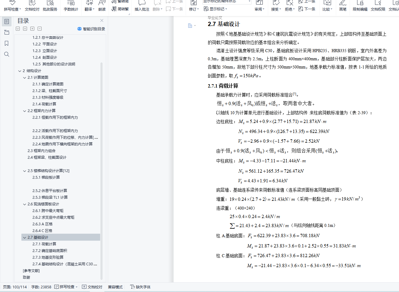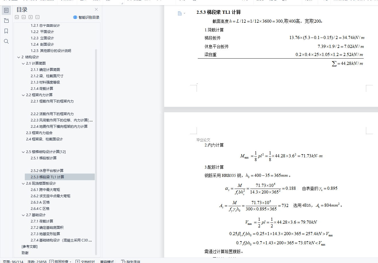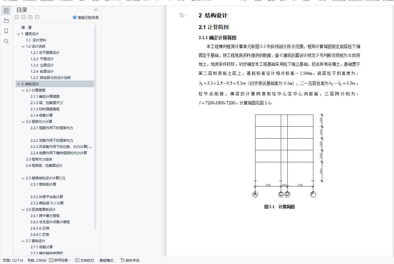 本科毕业论文(设计)题 目: 某中学宿舍楼建筑结构设计学 院:学生姓名:专 业: 土木工程班 级:指导教师:起止日期:目 录摘 要 41 建筑设计 61.1 设计资料 61.2设计说明 81.2.1总平面图设计 81.2.2 平面设计 81.2.3 立面设计 81.2.4 剖面设计 91.2.5 其他部分的设计说明 92 结构设计 122.1计算简图 122.1.1确定计算简图 122.1.2梁、柱截面尺寸 142.1.3材料强度等级 142.1.4荷载计算 142.2框架内力计算 232.2.1恒载作用下的框架内力 232.2.2活载作用下的框架内力 312.2.3风荷载作用下的位移、内力计算 462.2.4地震作用下横向框架的内力计算 492.3框架内力组合 582.4框架梁、柱截面设计 702.5楼梯结构设计计算 942.5.1梯段板计算 952.5.2休息平台板计算 962.5.3梯段梁TL1计算 962.6现浇楼面板设计 972.6.1跨中最大弯矩 982.6.2求支座中点最大弯矩 992.6.3 A区格 1002.6.4 C区格 1012.7基础设计 1032.7.1荷载计算 1032.7.2确定基础底面积 1042.7.3地基变形验算 1072.7.4基础结构设计 109参考文献 113致谢 114某中学宿舍楼建筑结构设计摘 要本设计为湖州市某中学五层学生宿舍的设计,主要包括建筑设计和结构设计两个部分。该公寓高16.5m,总建筑面积为3500m2,耐火等级为二级,抗震设防烈度为7度。建筑设计的内容包括平面、立面及剖面设计。结构设计包括框架设计、构件设计和基础设计等。其中,框架采用钢筋混凝土横向框架承重布置方案,基础采用钢筋混凝土柱下独立基础。本文对10轴1榀横向框架进行了配筋设计。在确定了框架布局与分配统计得到各种荷载、作用的大小之后,选择合理简单的计算方法进行荷载下作用下的内力计算、荷载效应组合等,并在此基础上,根据最不利原则进行内力组合,最后得到配筋成果。此外,本设计还采用了PKPM软件进行设计,绘制出了结构施工图。[关键词] 宿舍楼;框架结构;建筑设计;结构设计;Architectural and structural design of a private school's dormitory[Abstract]This design is for a 5-floor student dormitory of a high school in Huzhou . It mainly includes two parts which are the architectural design and the structural design.The height of the dormitory is 16.5m, and the total floor space is 3500m2, the fireproof levels is two , and its earthquake resistance fortification intensity is 7 degrees. Architectural design includes plane, vertical surface and section plane design.Structural design including frame design, component design and foundation design and so on. Among them, the frame uses the reinforced concrete crosswise frame load-bearing scheme of arrangement, the foundation uses the independent foundation under the reinforced concrete column .The article carries out the reinforcement design on the 10 axis 1 transverse frames .Having determined the frame layout and the assignment statistics ,we obtain each kind of load and the function size, then select a simple and reasonable method to calculate the load calculation, load effect combination and so on, and on the base of this, carries on the endogenic force combination according to the most disadvantageous principle, finally obtains the muscle achievement. In addition, this article also used the PKPM software to carry on the design, and to obtained the structure construction drawing.[Key words] dormitory ; frame structure; architectural design;