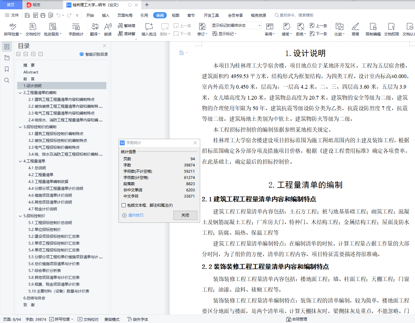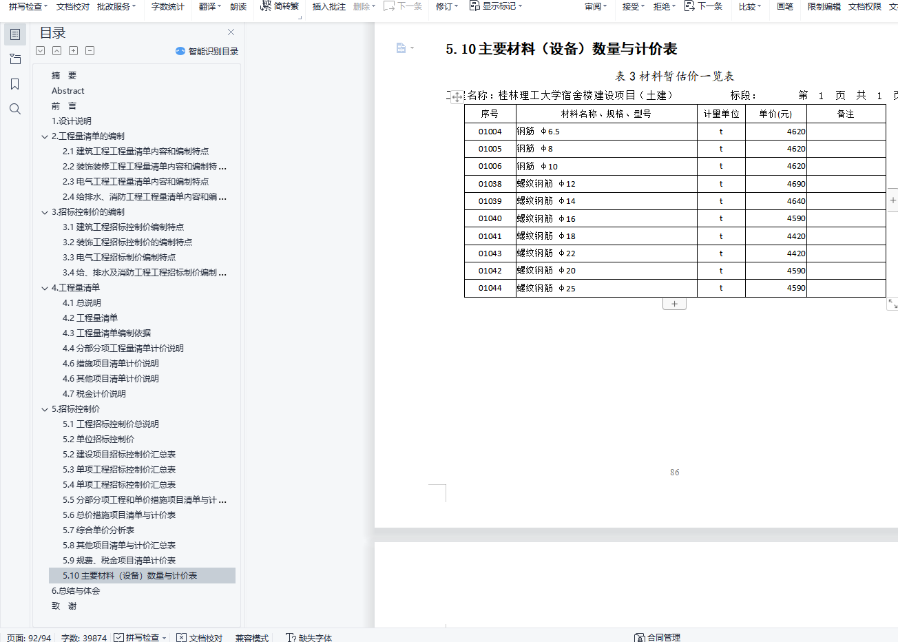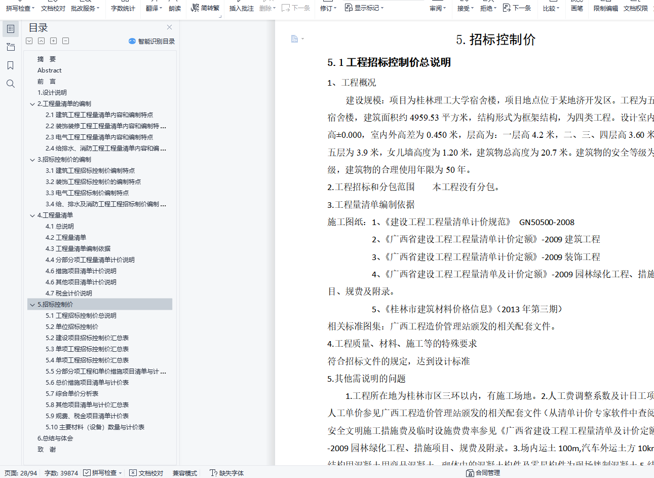 摘 要招标控制价是根据国家或省级、行业建设主管部门颁发的有关计价依据和办法,按设计施工图纸计算的,对招标工程限定的最高工程造价。招标控制价包括分部分项工程费、措施项目费、其他项目费、规费、税金。建设工程工程量清单是是建设工程招投标工作中,由招标人按国家统一的工程量计算规则提供工程数量,由投标人自主报价,并按照经评审低价中标的工程造价计价模式。表示的是实行工程量清单计价的建设工程的分部分项工程项目、措施项目、其它项目、规费项目和税金项目的名称和相应的数量。本设计的主要内容为桂林理工大学宿舍楼工程招标控制价编制,工程建筑总面积为4959.53平方米,工程类别为四类工程,抗震等级为三级,抗震设防烈度为7度。根据《11G101-1、2、3图集》和《建设工程工程量清单计价规范》的规则计算出钢筋、混凝土、装饰等各分部分项工程量,此次毕业设计主要为正确独立完成该工程量计算,并进行工程量清单编制工作,包括建筑工程、装饰装修工程、电气工程、给排水工程、消防工程以及各单位工程对应的措施项目,并进行工程概况指标参数分析和工程造价基础指标参数分析。关键词:宿舍楼;工程量;清单;招标;控制价AbstractThe bidding control price is calculated according to the relevant pricing basis and methods issued by the national or provincial or industrial construction competent departments, and the maximum project cost limited by the design and construction drawings.The tender control price includes partial project fees, measures and project fees, other project fees, regulatory fees and taxes.The bill of quantities of construction project is in the bidding work of construction project, the tenderer provides the number of projects according to the unified calculation rules of project quantity of the state, the bidder offers the price independently, and the project cost of the low price after evaluation.It represents the name and corresponding number of partial projects, measures projects, other projects, fees projects and tax projects of the bill of quantities valuation.The main contents of this design are the bidding control price preparation of the dormitory building of Guilin University of Technology. The total construction area is 4959.53 square meters, the project category is four types of projects, the seismic grade is level 3, and the seismic fortification intensity is 7 degrees.According to the rules of reinforcement, concrete, decoration and other parts of quantities. The graduation design is mainly to complete the project quantity calculation, and prepare the bill of quantities, including construction engineering, decoration engineering, electrical engineering, water supply and drainage engineering, fire control engineering and measures corresponding to each unit engineering, and conduct parameter analysis of project overview index and project cost basic index parameters.Key words: dormitory building; project quantity; list; bidding; control price目 录摘 要 IAbstract II前 言 11.设计说明 22.工程量清单的编制 22.1建筑工程工程量清单内容和编制特点 22.2装饰装修工程工程量清单内容和编制特点 22.3电气工程工程量清单内容和编制特点 22.4给排水、消防工程工程量清单内容和编制特点 33.招标控制价的编制 33.1建筑工程招标控制价编制特点 33.2装饰工程招标控制价的编制特点 43.3电气工程招标制价编制特点 43.4给、排水及消防工程工程招标制价编制特点 54.工程量清单 54.1总说明 54.2工程量清单 54.3工程量清单编制依据 164.4分部分项工程量清单计价说明 164.6措施项目清单计价说明 174.6其他项目清单计价说明 214.7税金计价说明 215.招标控制价 225.1工程招标控制价总说明 225.2单位招标控制价 235.2建设项目招标控制价汇总表 245.3单项工程招标控制价汇总表 255.4单项工程招标控制价汇总表 355.5分部分项工程和单价措施项目清单与计价表 465.6总价措施项目清单与计价表 495.7综合单价分析表 505.8其他项目清单与计价汇总表 845.9规费、税金项目清单计价表 855.10主要材料(设备)数量与计价表 866.总结与体会 87致 谢 88