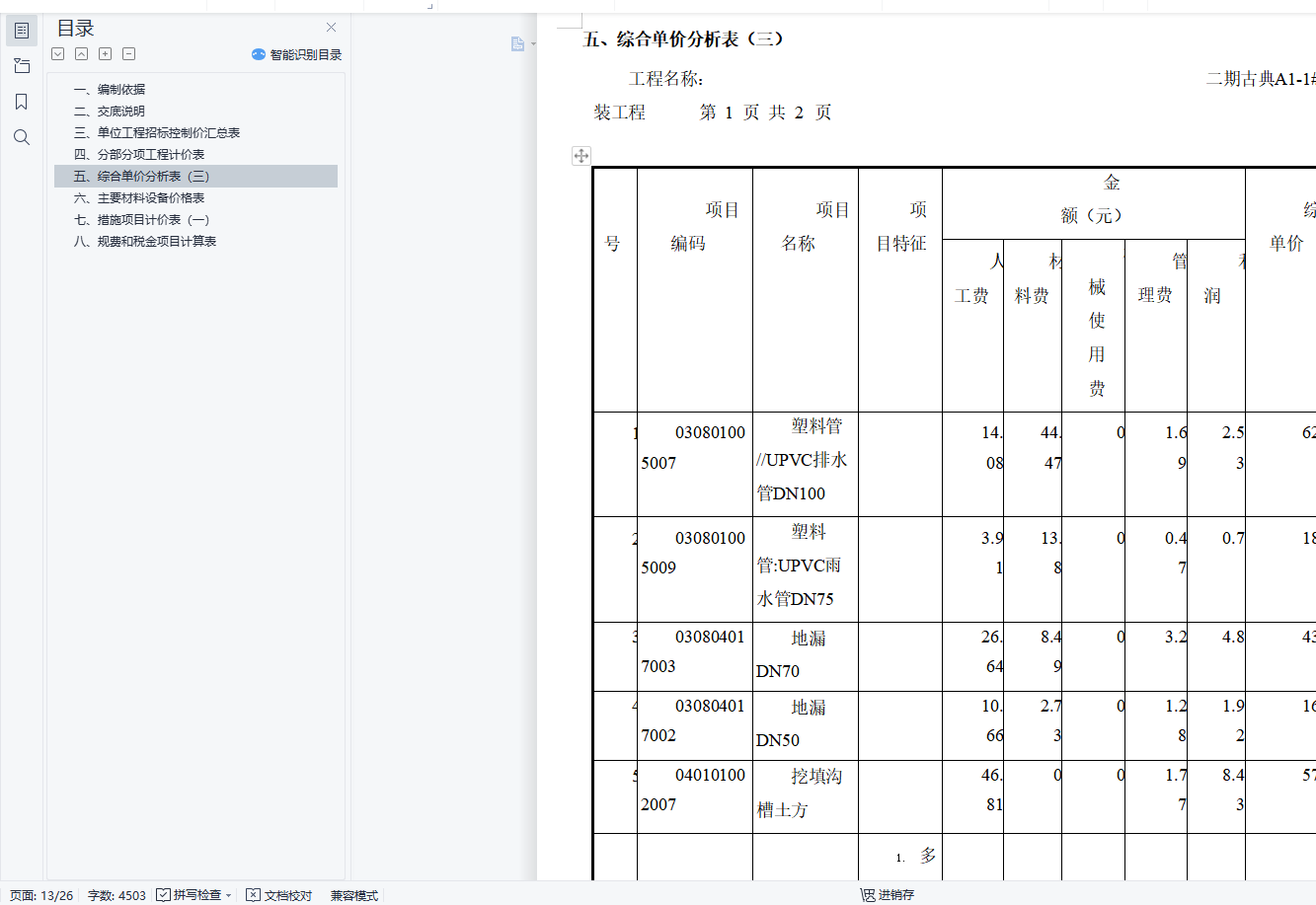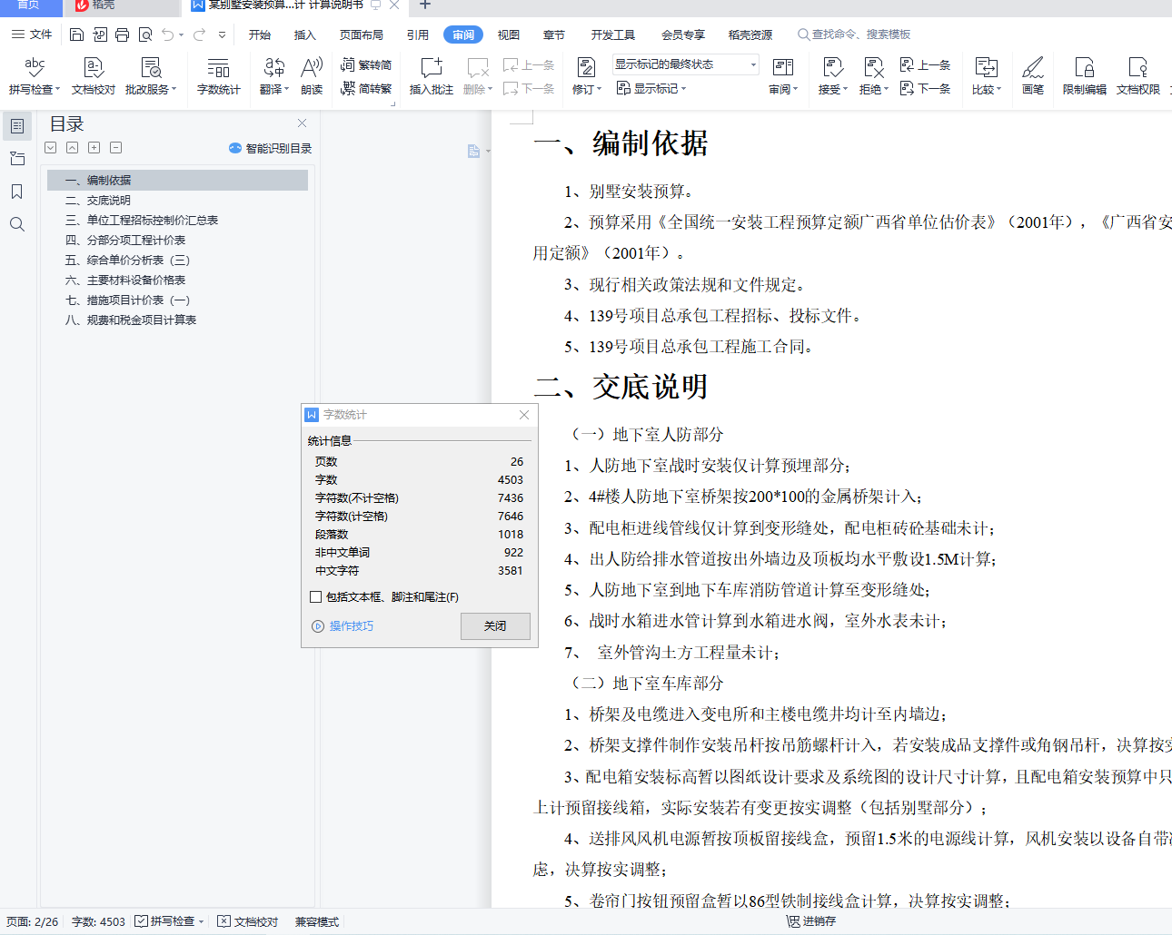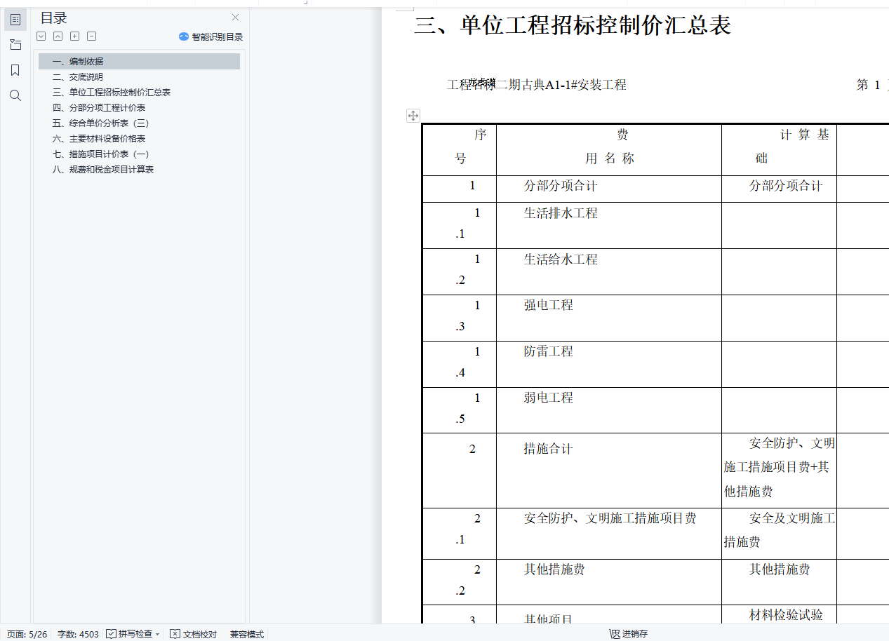 目 录一、编制依据 1二、交底说明 1三、单位工程招标控制价汇总表 4四、分部分项工程计价表 6五、综合单价分析表(三) 12六、主要材料设备价格表 18七、措施项目计价表(一) 20八、规费和税金项目计算表 24一、编制依据1、别墅安装预算。2、预算采用《全国统一安装工程预算定额广西省单位估价表》(2001年),《广西省安装工程费用定额》(2001年)。3、现行相关政策法规和文件规定。4、139号项目总承包工程招标、投标文件。5、139号项目总承包工程施工合同。二、交底说明(一)地下室人防部分1、人防地下室战时安装仅计算预埋部分;2、4#楼人防地下室桥架按200*100的金属桥架计入;3、配电柜进线管线仅计算到变形缝处,配电柜砖砼基础未计;4、出人防给排水管道按出外墙边及顶板均水平敷设1.5M计算;5、人防地下室到地下车库消防管道计算至变形缝处;6、战时水箱进水管计算到水箱进水阀,室外水表未计;7、 室外管沟土方工程量未计;