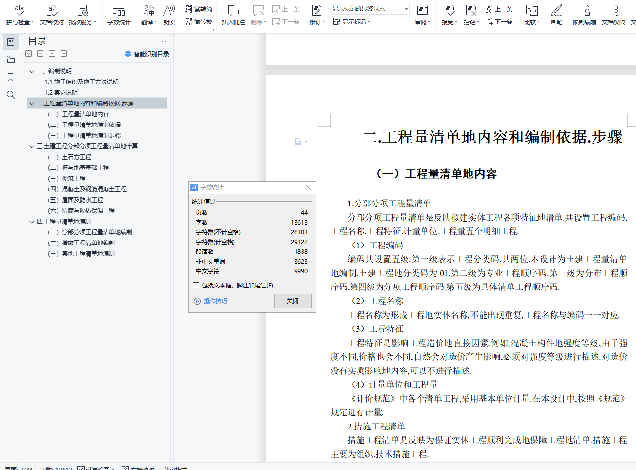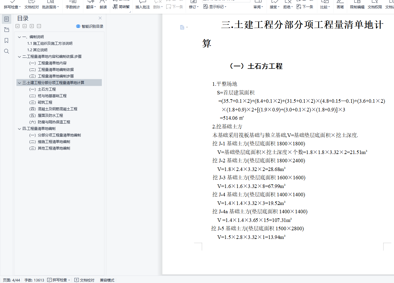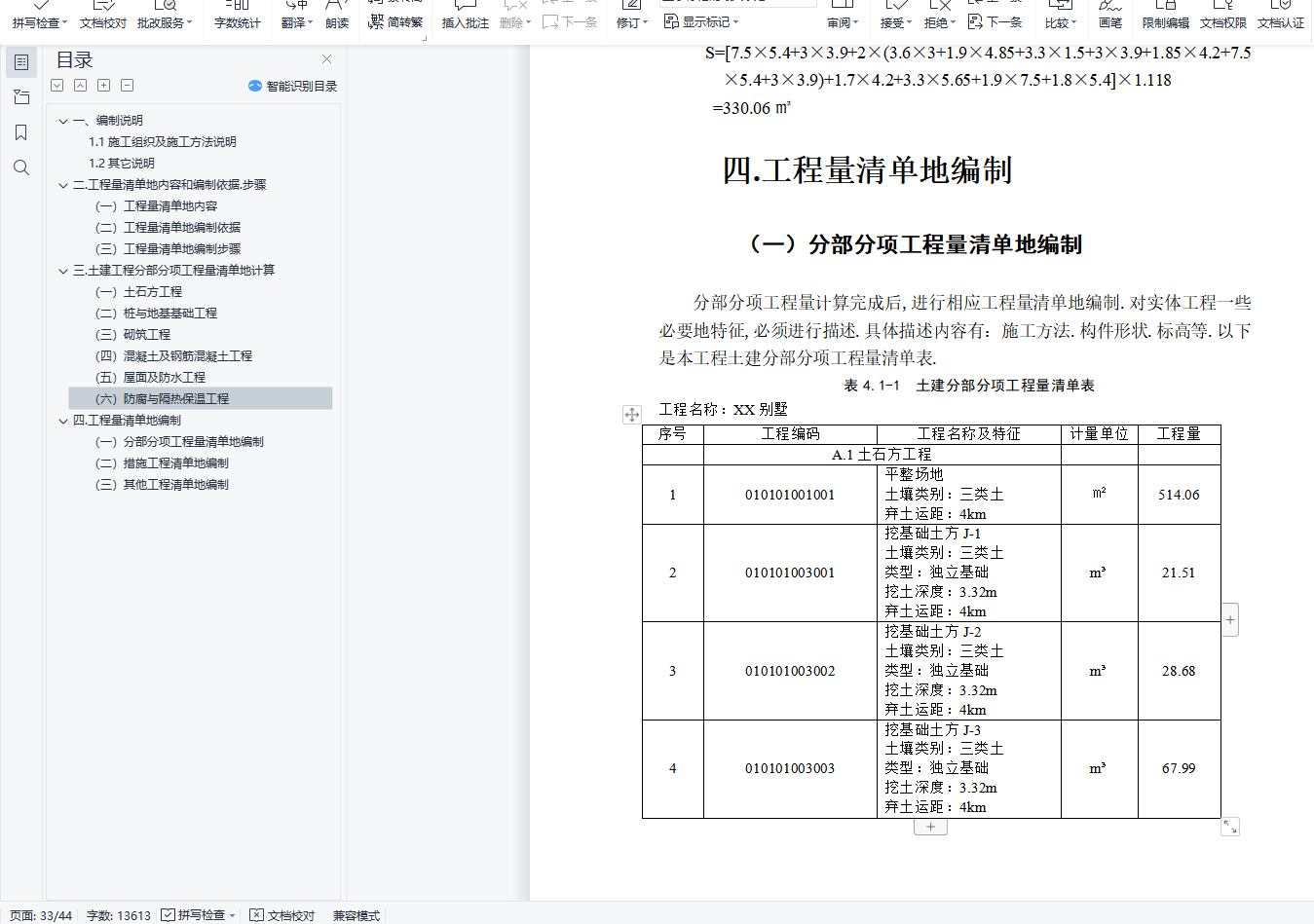 目 录一、编制说明 11.1施工组织及施工方法说明 11.2其它说明 1二.工程量清单地内容和编制依据.步骤 2(一)工程量清单地内容 2(二)工程量清单地编制依据 3(三)工程量清单地编制步骤 3三.土建工程分部分项工程量清单地计算 3(一)土石方工程 3(二)桩与地基基础工程 5(三)砌筑工程 5(四)混凝土及钢筋混凝土工程 8(五)屋面及防水工程 31(六)防腐与隔热保温工程 32四.工程量清单地编制 32(一)分部分项工程量清单地编制 32(二)措施工程清单地编制 43(三)其他工程清单地编制 44一、编制说明1.1施工组织及施工方法说明基础垫层为C10砼垫层土方采用人工挖方人工挖孔桩采用C20砼1.2其它说明本预算按核定土建四类工程标准记取各项费用费用项目只考虑常见费用项目钢筋价格未列入本预算内劳动保险费以记入本预算