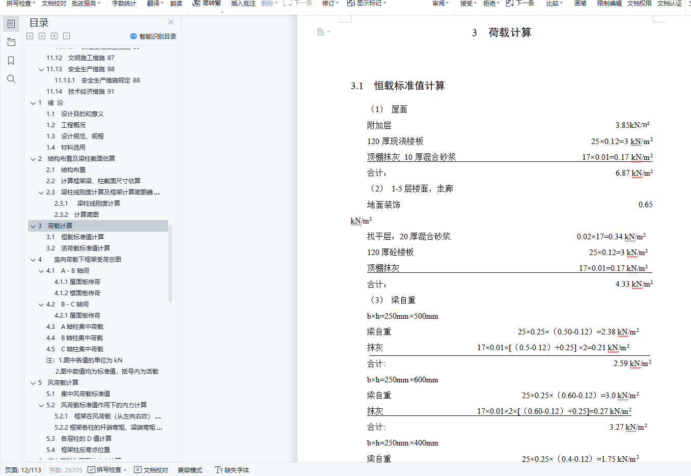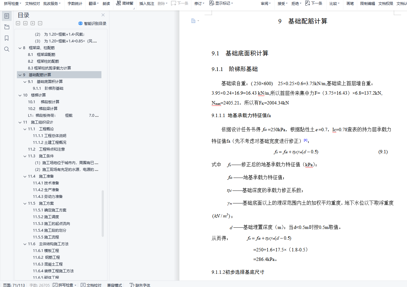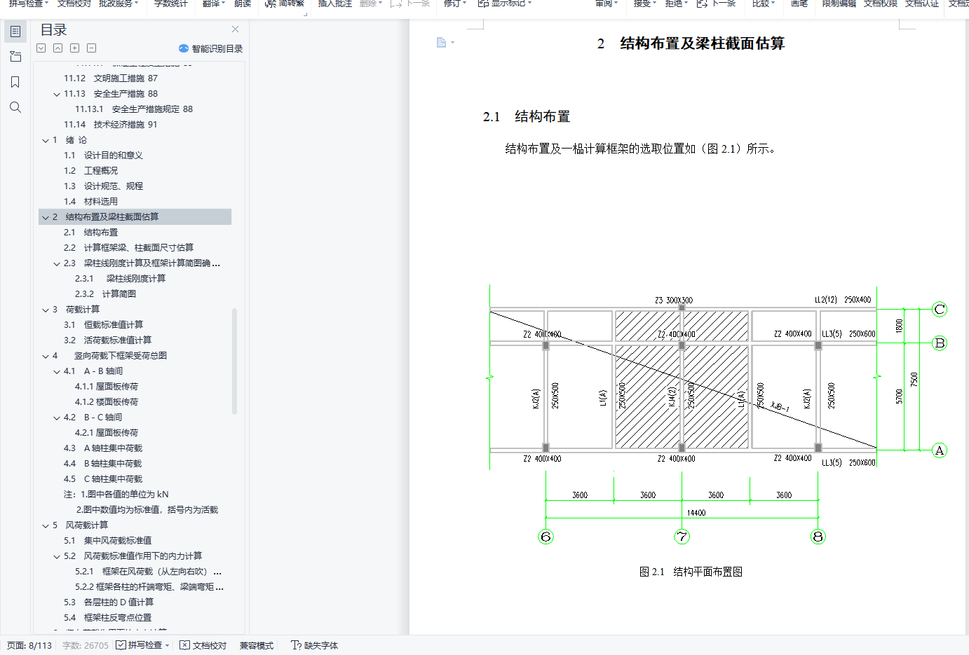 摘 要金奕华建设单位办公楼位于郑州市高新技术产业开发区文化大道北。严格按照《办公建筑设计规范》(JGJ67-2006)、《建筑设计防火规范》(GB50016-2006)、《建筑结构荷载规范》(GB50009-2001)、《混凝土结构设计规范》(GB50010-2002)、《建筑地基基础设计规范》(GB50007-2002)、《抗震设计规范》(GB50011-2001)等国家现行规范对本办公楼进行建筑设计,结构设计。施工组织设计中的时间定额按照河南省99定额套用。本设计先对建筑的平面、立面进行设计,随后对建筑的基础、梁、板、柱进行配筋计算,最后进行施工组织设计和施工场地平面设计。整个设计都符合国家现行规范要求。设计过程中采用天正7.0和AutoCAD2014软件进行建筑设计,采用算易结构软件计算基础配筋,用广厦10.0建筑结构CAD软件计算整个工程的梁板柱配筋,用梦龙2006软件绘出施工网络图。设计具有一定的可靠性、安全性、创造性。本次项目现浇钢筋混凝土框架结构,计算书包含建筑结构选型,建筑荷载计算,框架配筋计算,基础计算,楼梯计算。其中建筑荷载计算过程中垂直荷载采用迭代法计算,水平荷载采用D值法计算,通过荷载组合确定一榀框架结构的控制内力,最后完成一榀框架的配筋,并手绘了一榀框架配筋图。关键词: 建筑设计,结构设计,框架,配筋,施工ABSTRACTThe commercial office building is located in the north of Cultural Avenue of Zhoukou High-tech Industrial Development Zone.Building design and structure design in strict accordance with the current national specifications such as Code for the Design of Office Buildings (JGJ67-2006), Code for Fire Prevention of Buildings (GB50016-2006), Code for Loading (GB50009-2001), Code for the Design of Concrete Structures (GB50010-2002), Code for the Design of Building Foundation (GB50007-2002), and Seismic Design Code (GB50011-2001).The time quota in the construction organization design shall be applied according to the 99 quota in Henan Province.This design first designs the plane and facade of the building, then calculates the foundation, beams, boards, and columns, and finally conducts the construction organization design and construction site plane design.The whole design meets the current national specifications.During the design process, Tianzhu 7.0 and AutoCAD2014 software were used for architectural design, easy structural software was used to calculate basic reinforcement, beam and column reinforcement of the whole project were calculated with Guangxia 10.0 building structure CAD software, and the construction network drawing was drawn with Menglong 2006 software.The design has certain reliability, safety and creativity.The cast-in-place reinforced concrete frame structure of this project includes building structure selection, building load calculation, frame reinforcement calculation, foundation calculation, and stair calculation.Among them, during the building load calculation process, the vertical load is calculated by iterative method, and the horizontal load is calculated by D value method. The control internal force of a frame structure is determined through the load combination, and finally the reinforcement of a frame was completed, and a frame reinforcement map is hand-drawn.Keywords : architectural design, structural design, frame, reinforcement, construction目 录1 绪论 11.1 设计目的和意义 11.2 工程概况 11.3 设计规范、规程 11.4 材料选用 12 结构布置及梁柱截面估算 22.1 结构布置 22.2 计算框架梁、柱截面尺寸估算 32.3 梁柱线刚度计算及框架计算简图确定 32.3.1 梁柱线刚度计算 32.3.2 计算简图 43 荷载计算 63.1 恒载标准值计算 63.2 活荷载标准值计算 74 竖向荷载下框架受荷总图 84.1 A-B轴间 84.1.1 屋面板传荷 84.1.2 楼面板传荷 84.2 B-C轴间 84.2.1 屋面板传荷 84.3 A轴柱集中荷载 94.4 B轴柱集中荷载 104.5 C轴柱集中荷载 105 风荷载计算 135.1 集中风荷载标准值 135.2 风荷载标准值作用下的内力计算 135.2.1 框架在风荷载(从左向右吹)下的内力用D值法进行计算 135.2.2 框架各柱的杆端弯矩、梁端弯矩计算 145.3 各层柱的D值计算 145.4 框架柱反弯点位置 156 竖向荷载作用下的内力计算 187 内力组合 377.1 梁柱内力组合 378 框架梁、柱配筋 538.1 框架梁配筋 538.2 框架柱的配筋 558.3 框架柱抗剪承载力计算 589 基础配筋计算 599.1 基础底面积计算 599.1.1 阶梯形基础 5910 楼梯计算 6510.1 梯段板计算 6510.2 梯段梁计算 6611 施工组织设计 6711.1 工程概论 6711.1.1 工程总体说明 6711.1.2 土建工程概况 6711.2 工程特点和注意 6711.3 施工条件 6711.4 施工准备 6811.4.1 技术准备 6811.4.2 生产准备 6811.4.3 劳动力准备 6811.5 施工方案 6911.5.1 确定施工方案 6911.5.2 施工的起点流向 6911.5.3 施工段的划分 6911.5.4 施工流程 7011.6 主体结构施工方法 7111.6.1 模板工程 7111.6.2 钢筋工程 7211.6.3 混凝土工程 7311.6.4 装修工程施工方法 7411.6.5 砌体工程 7511.6.6 门窗工程 7611.7 单位工程持续时间 7711.8 网络图绘制 8311.9 资源计划 8411.9.1 劳动力需要计划 8411.9.2 施工机具设备需要计划 8411.9.3 施工计量器具的投入 8411.10 施工平面图设计 8511.11 技术组织措施 8511.11.1 保证工程质量措施 8511.12 文明施工措施 8711.13 安全生产措施 8811.13.1 安全生产措施规定 8811.14 技术经济措施 91结论 92参考文献 93致谢 94