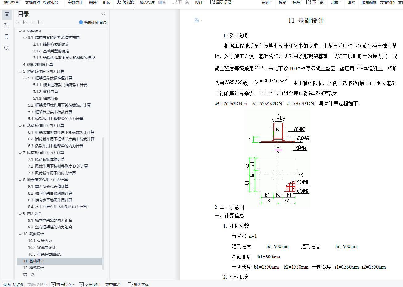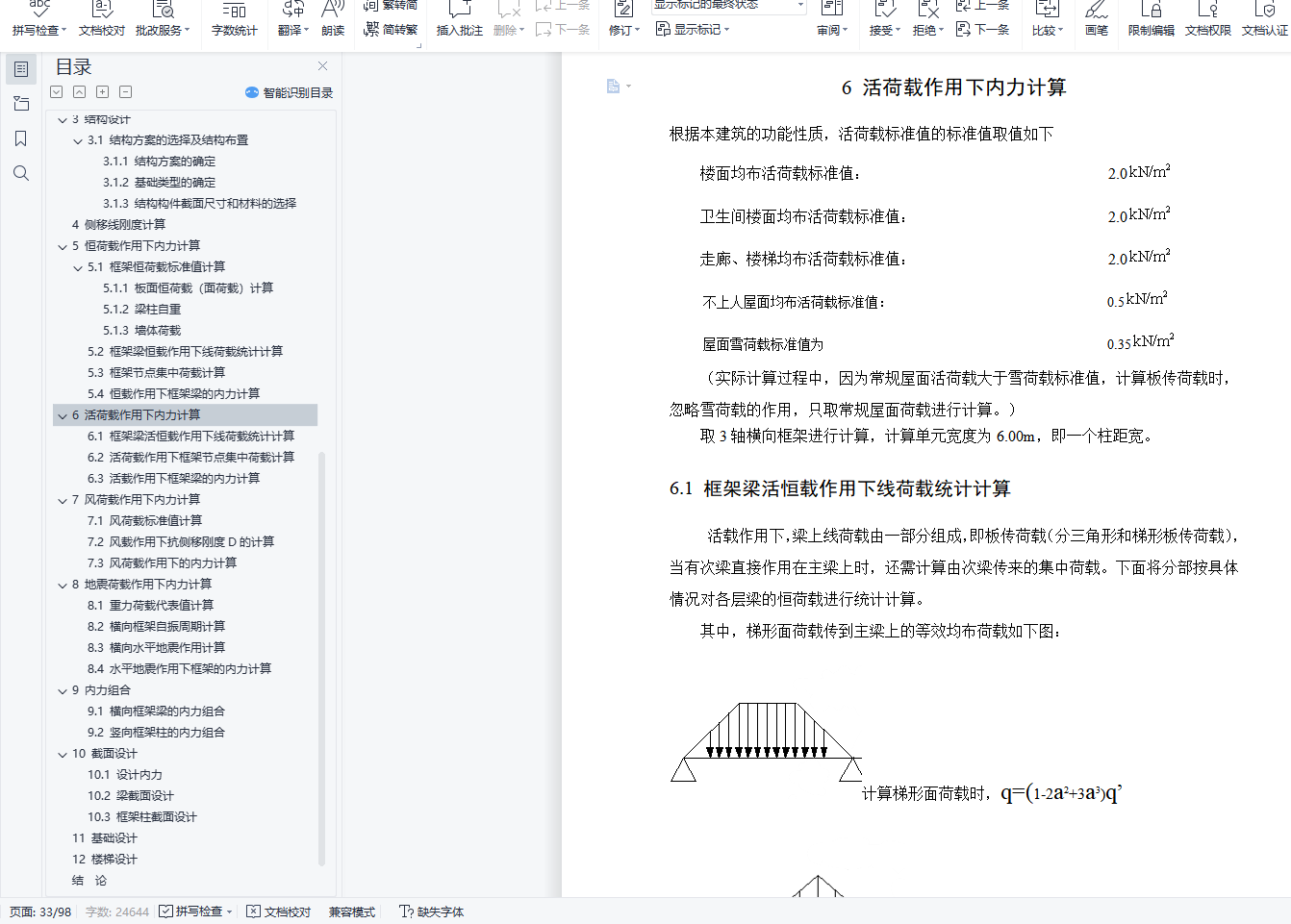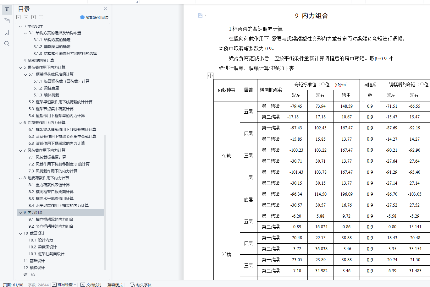 摘 要本项目为郑州地区税务局办公大楼设计,为现浇钢筋混凝土框架结构。在研究生设计过程中,主要进行建筑设计和结构设计两部分。结构设计分为手工计算和计算机计算两部分,建筑部分主要划分建筑功能,进一步确定建筑的平面图、立面和剖面。在结构设计部分,主要是梁柱的横断面设计和整栋建筑的抗震设计。手工计算部分的具体内容是对选定的水平框架的结构梁和柱进行设计,即根据确定的计算图,通过梁的统计计算,将水平荷载和竖向荷载组合起来,是一个组合的力,并用作设计标准来确定梁和柱的横截面尺寸和所需的钢筋面积。除了设计梁和柱外,还需要根据研究生设计的要求进行地基和现浇板。计算机计算部主要采用PKPM对整体结构和荷载输入进行建模,得到计算机化结果并分析合理性,然后绘制梁、板、柱结构的施工图,最后比较人工计算的结果。并分析计算机计算结果及产生差异的原因。关键词: 建筑设计;结构设计;办公楼;荷载计算;计算配筋AbstractThe project is designed by the Office Building of Zhoukou Regional Taxation Bureau and is a concrete frame system.In the graduate design process, the architectural design and structural design are mainly conducted.The structural design is divided into two parts: manual calculation and computer calculation. The building part is mainly divided into building functions to further determine the floor plan, elevation and section of the building.In the structural design section, it is mainly the cross-section design of beams and columns and the seismic design of the whole building.The specific content of the manual calculation section is to design the structural beams and columns of the selected horizontal frame, that is, combining the horizontal and vertical loads through the statistical calculation, is a combined force and used as a design standard to determine the cross-section size of the beam and column and the required reinforcement area.In addition to designing beams and columns, foundations and cast-in-place plates are required according to the requirements of the graduate design.The computer computing department mainly uses PKPM to model the overall structure and load input, obtain the computerized results and analyze the rationality, then draw the construction drawing of the beam, plate and column structure, and finally compare the results of manual calculation.The computer calculation results and the differences are analyzed.Key words: architectural design; structural design; office building; load calculation; calculation of reinforcement目 录摘要 3前言 41 设计任务及基本要求 51.1 设计原始资料 51.2 建筑设计要求 51.3结构设计任务及要求 52 建筑设计说明 62.1建筑平面设计 62.2剖面设计 63 结构设计 73.1 结构方案的选择及结构布置 74 侧移线刚度计算 115 恒荷载作用下内力计算 125.1 框架恒荷载标准值计算 125.2 框架梁恒载作用下线荷载统计计算 135.3 框架节点集中荷载计算 165.4 恒载作用下框架梁的内力计算 196 活荷载作用下内力计算 266.1 框架梁活恒载作用下线荷载统计计算 276.2 活荷载作用下框架节点集中荷载计算 286.3 活载作用下框架梁的内力计算 307 风荷载作用下内力计算 377.1 风荷载标准值计算 377.2 风载作用下抗侧移刚度D的计算: 387.3 风荷载作用下的内力计算 408 地震荷载作用下内力计算 458.1 重力荷载代表值计算 458.2 横向框架自振周期计算 478.3 横向水平地震作用计算 488.4 水平地震作用下框架的内力计算 509 内力组合 549.1 横向框架梁的内力组合 559.2 竖向框架柱的内力组合 6210 截面设计 6810.1 设计内力 6810.2 梁截面设计 6810.3 框架柱截面设计 7011 基础设计 7412 楼梯设计 80结论 85谢辞 86参考文献 87