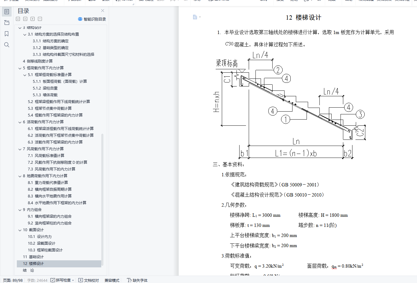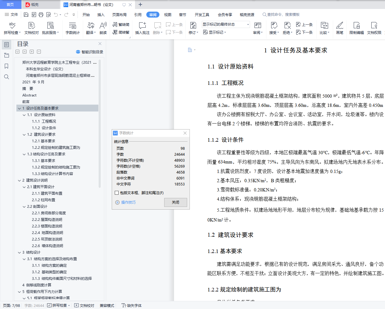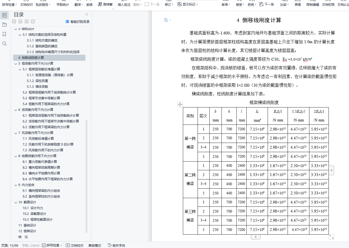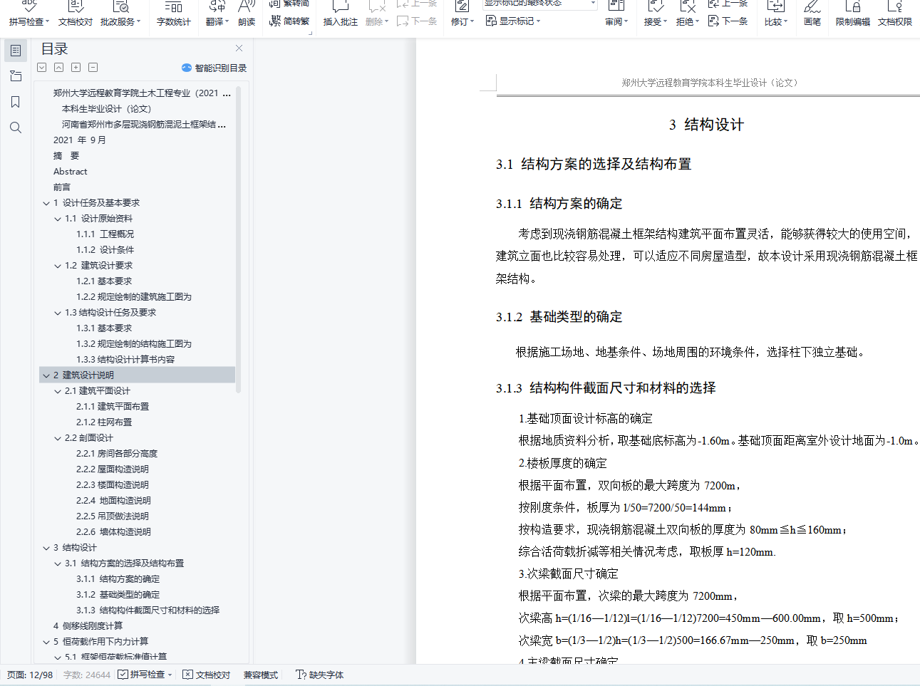 摘 要本项目为郑州地区税务局办公大楼设计,为现浇钢筋混凝土框架结构。在研究生设计过程中,主要进行建筑设计和结构设计两部分。结构设计分为手工计算和计算机计算两部分,建筑部分主要划分建筑功能,进一步确定建筑的平面图、立面和剖面。在结构设计部分,主要是梁柱的横断面设计和整栋建筑的抗震设计。手工计算部分的具体内容是对选定的水平框架的结构梁和柱进行设计,即根据确定的计算图,通过梁的统计计算,将水平荷载和竖向荷载组合起来,是一个组合的力,并用作设计标准来确定梁和柱的横截面尺寸和所需的钢筋面积。除了设计梁和柱外,还需要根据研究生设计的要求进行地基和现浇板。计算机计算部主要采用PKPM对整体结构和荷载输入进行建模,得到计算机化结果并分析合理性,然后绘制梁、板、柱结构的施工图,最后比较人工计算的结果。并分析计算机计算结果及产生差异的原因。关键词: 建筑设计;结构设计;办公楼;荷载计算;计算配筋AbstractThe project is designed by the Office Building of Zhoukou Regional Taxation Bureau and is a concrete frame system.In the graduate design process, the architectural design and structural design are mainly conducted.The structural design is divided into two parts: manual calculation and computer calculation. The building part is mainly divided into building functions to further determine the floor plan, elevation and section of the building.In the structural design section, it is mainly the cross-section design of beams and columns and the seismic design of the whole building.The specific content of the manual calculation section is to design the structural beams and columns of the selected horizontal frame, that is, combining the horizontal and vertical loads through the statistical calculation, is a combined force and used as a design standard to determine the cross-section size of the beam and column and the required reinforcement area.In addition to designing beams and columns, foundations and cast-in-place plates are required according to the requirements of the graduate design.The computer computing department mainly uses PKPM to model the overall structure and load input, obtain the computerized results and analyze the rationality, then draw the construction drawing of the beam, plate and column structure, and finally compare the results of manual calculation.The computer calculation results and the differences are analyzed.Key words: architectural design; structural design; office building; load calculation; calculation of reinforcement目 录摘要 3前言 41 设计任务及基本要求 51.1 设计原始资料 51.2 建筑设计要求 51.3结构设计任务及要求 52 建筑设计说明 62.1建筑平面设计 62.2剖面设计 63 结构设计 73.1 结构方案的选择及结构布置 74 侧移线刚度计算 115 恒荷载作用下内力计算 125.1 框架恒荷载标准值计算 125.2 框架梁恒载作用下线荷载统计计算 135.3 框架节点集中荷载计算 165.4 恒载作用下框架梁的内力计算 196 活荷载作用下内力计算 266.1 框架梁活恒载作用下线荷载统计计算 276.2 活荷载作用下框架节点集中荷载计算 286.3 活载作用下框架梁的内力计算 307 风荷载作用下内力计算 377.1 风荷载标准值计算 377.2 风载作用下抗侧移刚度D的计算: 387.3 风荷载作用下的内力计算 408 地震荷载作用下内力计算 458.1 重力荷载代表值计算 458.2 横向框架自振周期计算 478.3 横向水平地震作用计算 488.4 水平地震作用下框架的内力计算 509 内力组合 549.1 横向框架梁的内力组合 559.2 竖向框架柱的内力组合 6210 截面设计 6810.1 设计内力 6810.2 梁截面设计 6810.3 框架柱截面设计 7011 基础设计 7412 楼梯设计 80结论 85谢辞 86参考文献 87