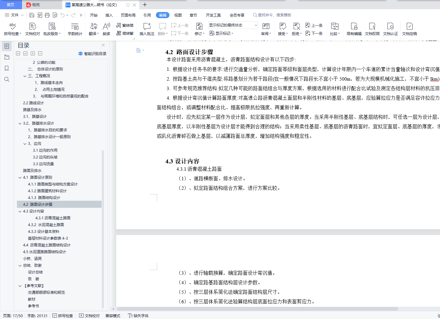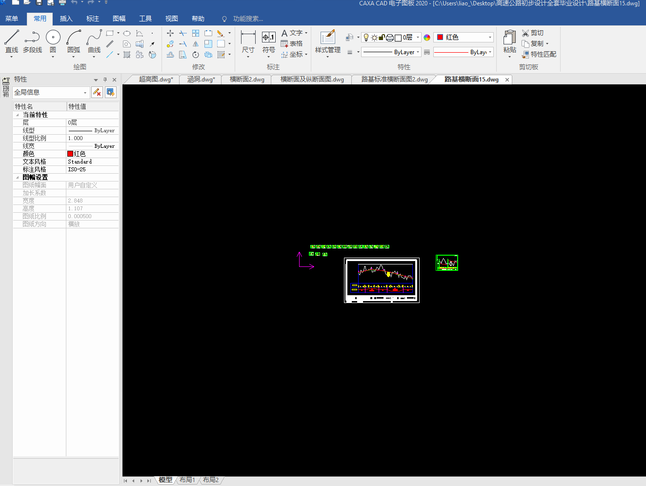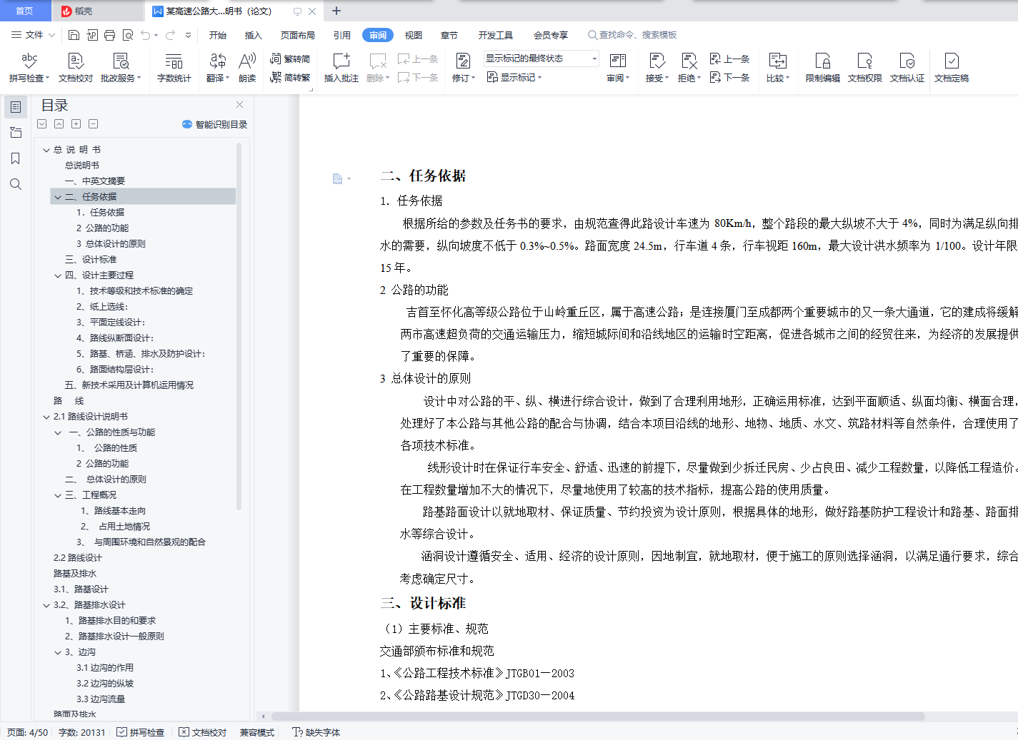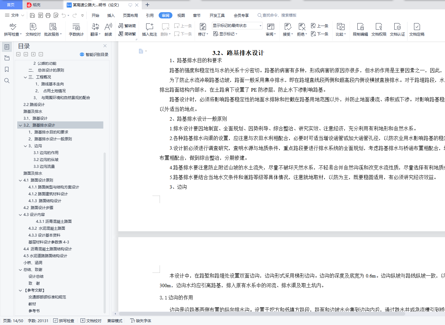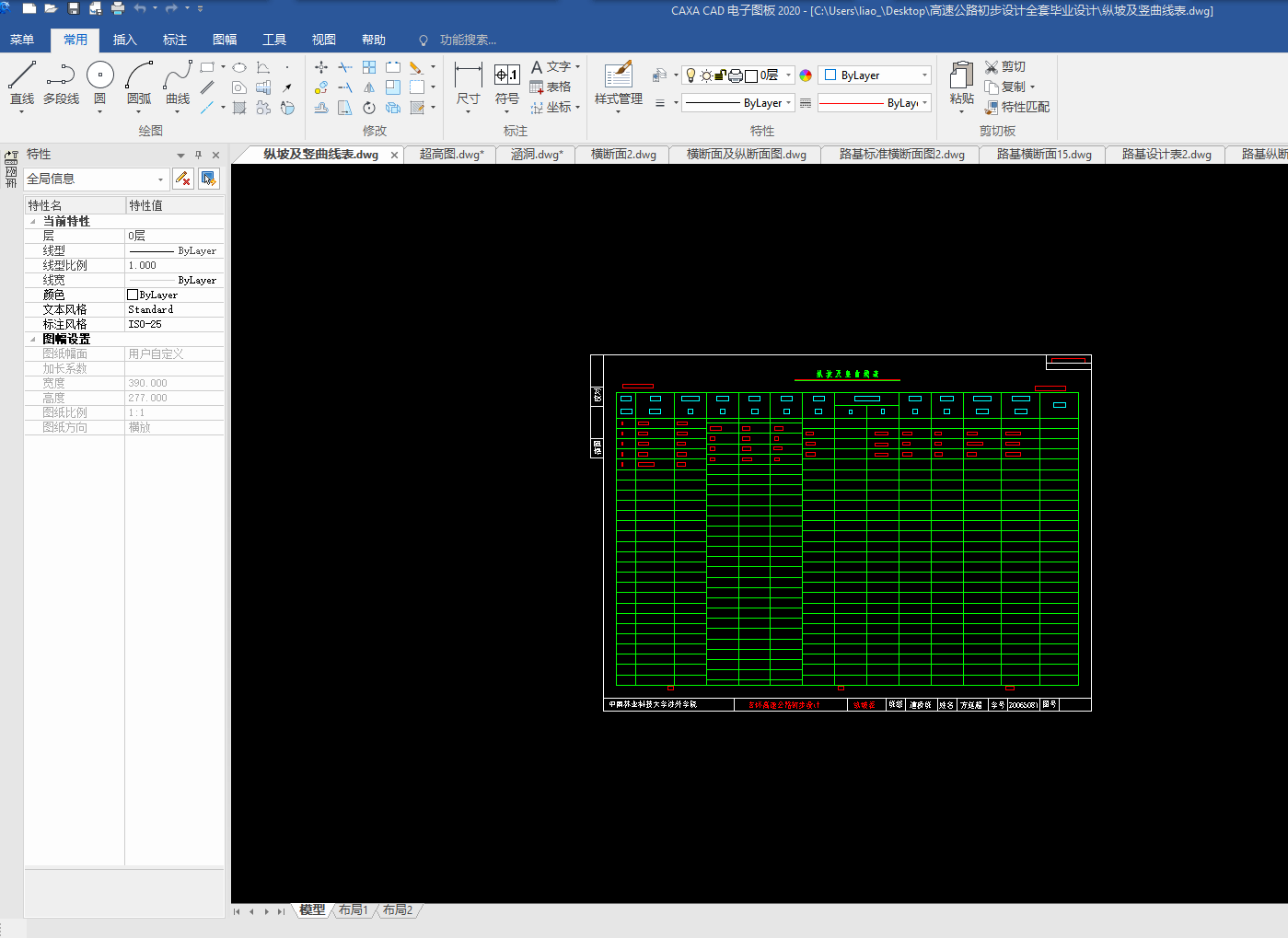 目录总 说 明 书 2总说明书 3一、中英文摘要 3二、任务依据 41. 任务依据 52 公路的功能 53 总体设计的原则 5三、设计标准 5四、设计主要过程 61、 技术等级和技术标准的确定 62、 纸上选线: 63、 平面定线设计: 64、 路线纵断面设计: 65、 路基、桥涵、排水及防护设计: 66、 路面结构层设计: 7五、新技术采用及计算机运用情况 7路 线 82.1路线设计说明书 9一、公路的性质与功能 91、 公路的性质 92 公路的功能 9二、 总体设计的原则 9三、工程概况 91、路线基本走向 92、 占用土地情况 93、 与周围环境和自然景观的配合 92.2路线设计 9路基及排水 143.1、路基设计 153.2、路基排水设计 151、路基排水目的和要求 152、路基排水设计一般原则 153、边沟 153.1边沟的作用 163.2边沟的纵坡 163.3边沟流量 16路面及排水 174.1 路面设计原则 184.1.1路面类型与结构方案设计 184.1.2路面建筑材料设计 184.1.3 路面结构设计 184.2 路面设计步骤 184.3设计内容 184.3.1沥青混凝土路面 184.3.2 水泥混凝土路面 194.3.3设计基本资料 19基层材料设计参数表4-3 204.4 沥青混凝土路面结构设计 204.5水泥道路路面结构设计 34小桥、涵洞 46总结、致谢 49设计总结 51致 谢 51【参考文献】 51交通部部颁标准和规范 51教材 51参考书 51总说明书一、中英文摘要【摘 要】: 本次毕业设计的主要任务是道路初步设计。本次设计在分析地形的基础上,做了路线设计,包括平面定线与比选、纵断面及横断面的设计;在路线设计的基础上做了路基和路面的初步设计,路基设计中主要进行了排水和边坡的设计,路面则选择了沥青混凝土路面和水泥混凝土路面两种方案,另外在每种方案设计的同时也选取了两种不同的材料类型进行比选和推荐。【关键词】:道路初步设计 路线设计 路基和路面初步设计 沥青混凝土路面水泥混凝土路面【Abstract】:The main task of the graduation is the preliminary design of road, including flat-alignment with the selection, and cross-sectional profile of the design of the road design done on the basis of the road embankment and the preliminary design, design of the main embankment A drainage and slope design, was chosen the road of asphalt pavement and cement concrete pavement two programmes, and in each design has also selected two different types of materials selection and recommendation【Key words】:Preliminary design of road Route Design Roadbed and preliminary design of the road Asphalt concrete pavement Concrete Pavement