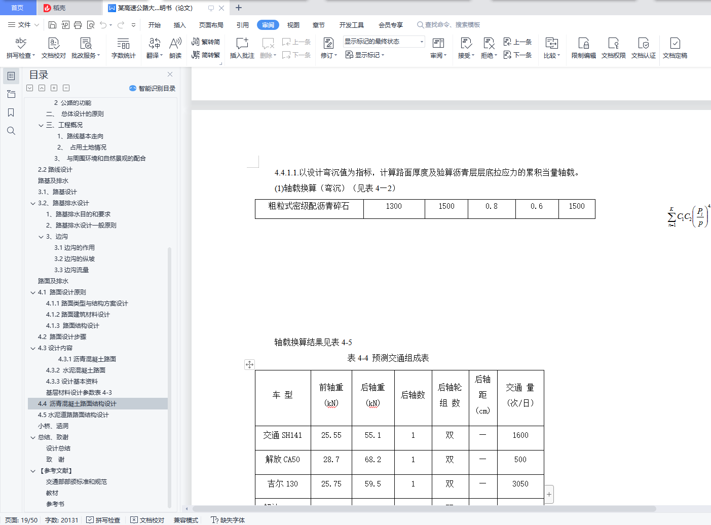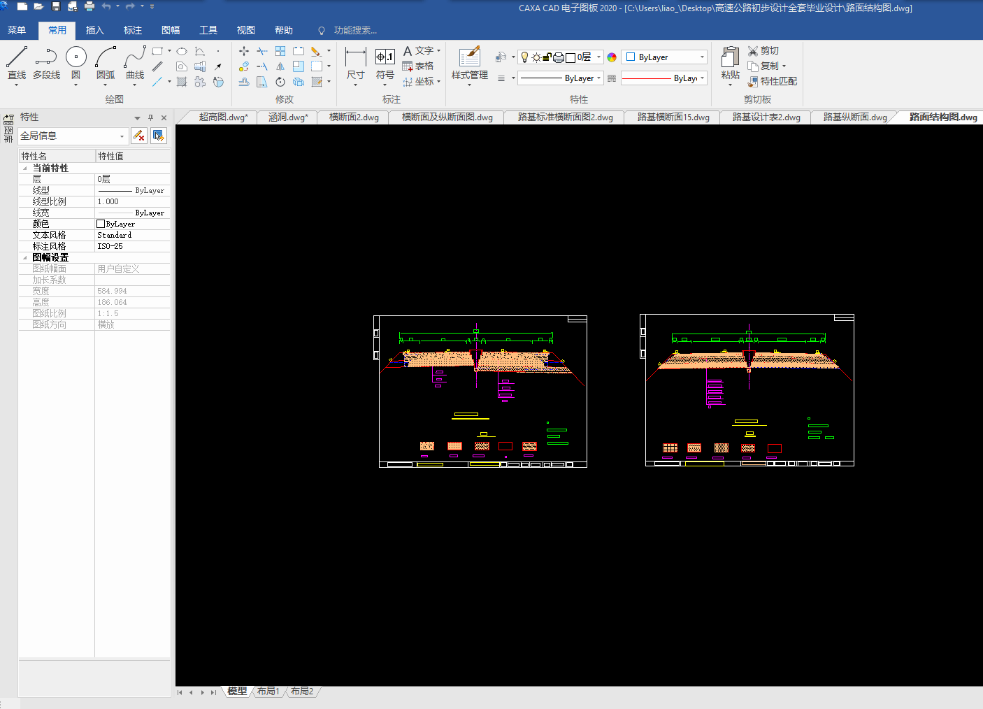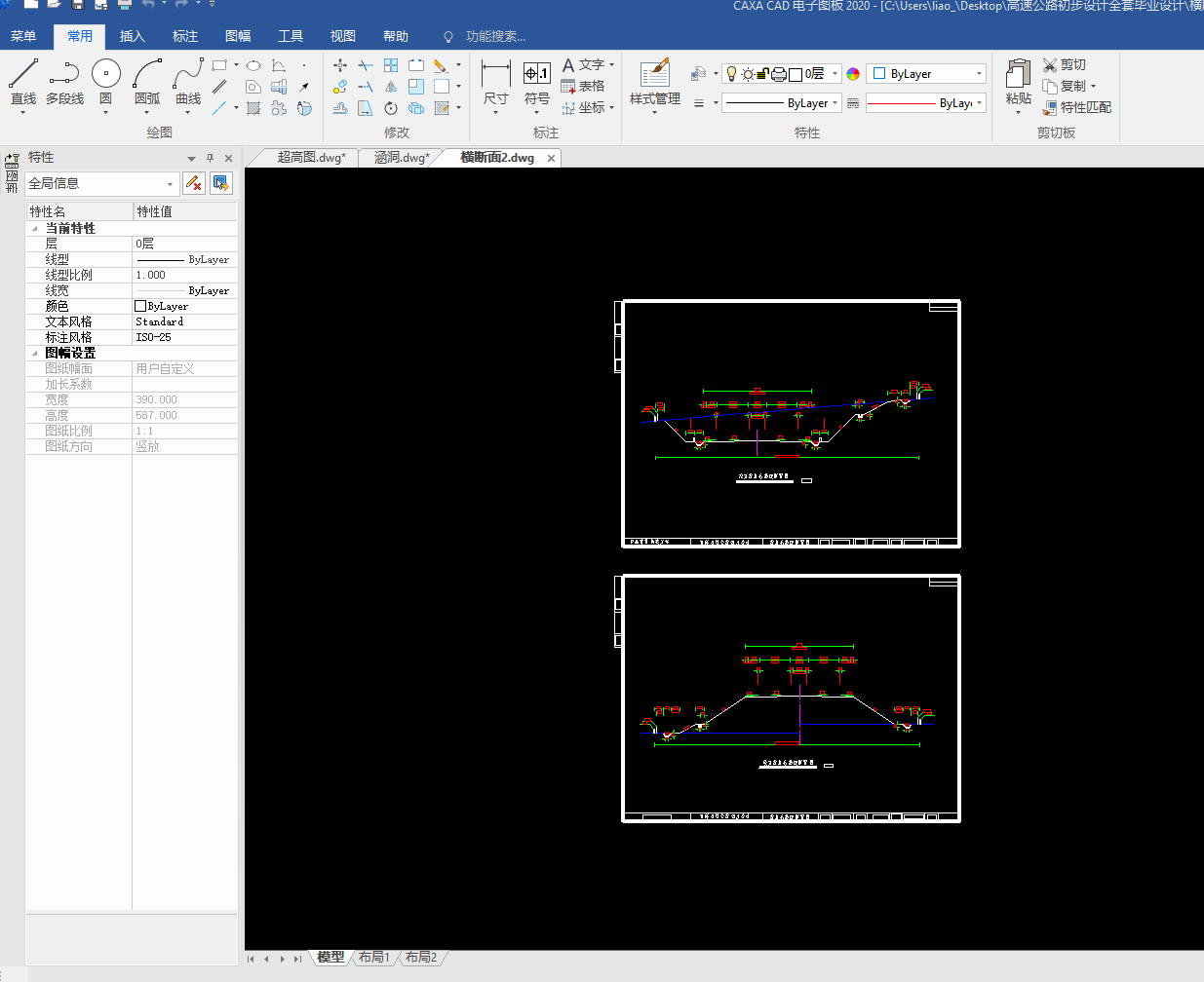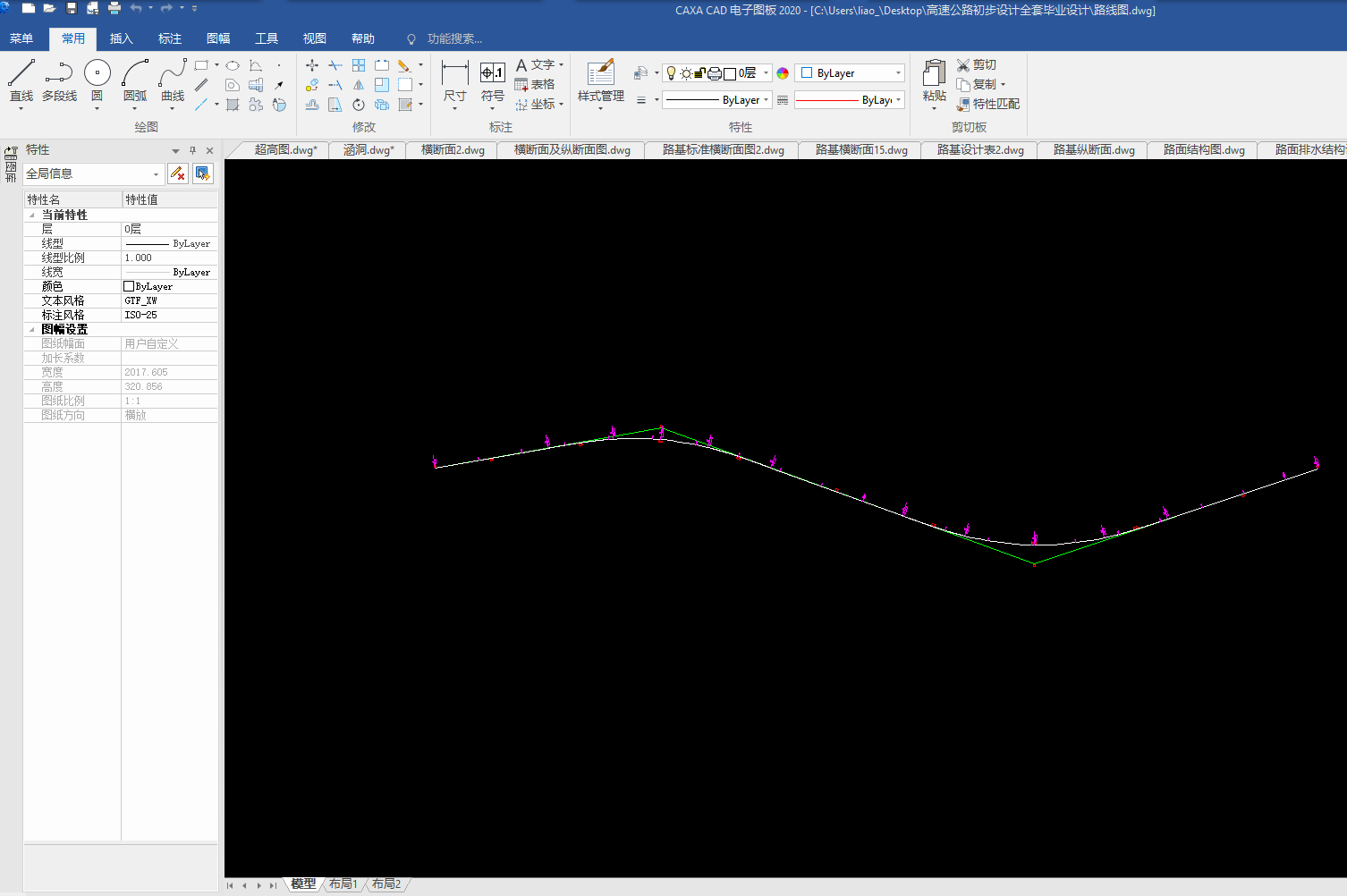 目录总 说 明 书 2总说明书 3一、中英文摘要 3二、任务依据 41. 任务依据 52 公路的功能 53 总体设计的原则 5三、设计标准 5四、设计主要过程 61、 技术等级和技术标准的确定 62、 纸上选线: 63、 平面定线设计: 64、 路线纵断面设计: 65、 路基、桥涵、排水及防护设计: 66、 路面结构层设计: 7五、新技术采用及计算机运用情况 7路 线 82.1路线设计说明书 9一、公路的性质与功能 91、 公路的性质 92 公路的功能 9二、 总体设计的原则 9三、工程概况 91、路线基本走向 92、 占用土地情况 93、 与周围环境和自然景观的配合 92.2路线设计 9路基及排水 143.1、路基设计 153.2、路基排水设计 151、路基排水目的和要求 152、路基排水设计一般原则 153、边沟 153.1边沟的作用 163.2边沟的纵坡 163.3边沟流量 16路面及排水 174.1 路面设计原则 184.1.1路面类型与结构方案设计 184.1.2路面建筑材料设计 184.1.3 路面结构设计 184.2 路面设计步骤 184.3设计内容 184.3.1沥青混凝土路面 184.3.2 水泥混凝土路面 194.3.3设计基本资料 19基层材料设计参数表4-3 204.4 沥青混凝土路面结构设计 204.5水泥道路路面结构设计 34小桥、涵洞 46总结、致谢 49设计总结 51致 谢 51【参考文献】 51交通部部颁标准和规范 51教材 51参考书 51总说明书一、中英文摘要【摘 要】: 本次毕业设计的主要任务是道路初步设计。本次设计在分析地形的基础上,做了路线设计,包括平面定线与比选、纵断面及横断面的设计;在路线设计的基础上做了路基和路面的初步设计,路基设计中主要进行了排水和边坡的设计,路面则选择了沥青混凝土路面和水泥混凝土路面两种方案,另外在每种方案设计的同时也选取了两种不同的材料类型进行比选和推荐。【关键词】:道路初步设计 路线设计 路基和路面初步设计 沥青混凝土路面水泥混凝土路面【Abstract】:The main task of the graduation is the preliminary design of road, including flat-alignment with the selection, and cross-sectional profile of the design of the road design done on the basis of the road embankment and the preliminary design, design of the main embankment A drainage and slope design, was chosen the road of asphalt pavement and cement concrete pavement two programmes, and in each design has also selected two different types of materials selection and recommendation【Key words】:Preliminary design of road Route Design Roadbed and preliminary design of the road Asphalt concrete pavement Concrete Pavement