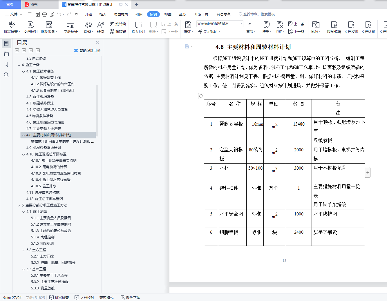 根据施工组织设计中的施工进度计划和施工预算中的工料分析, 编制工程所需的材料用量计划,做为备料、供料工作和确定仓库、堆 场面积及组织运输的依据。主要材料计划见下表,根据材料需用量计划,做好材料的申请、订货和采购工作,使计划得到落实。组织材料按计划进场,并做好保管工作。