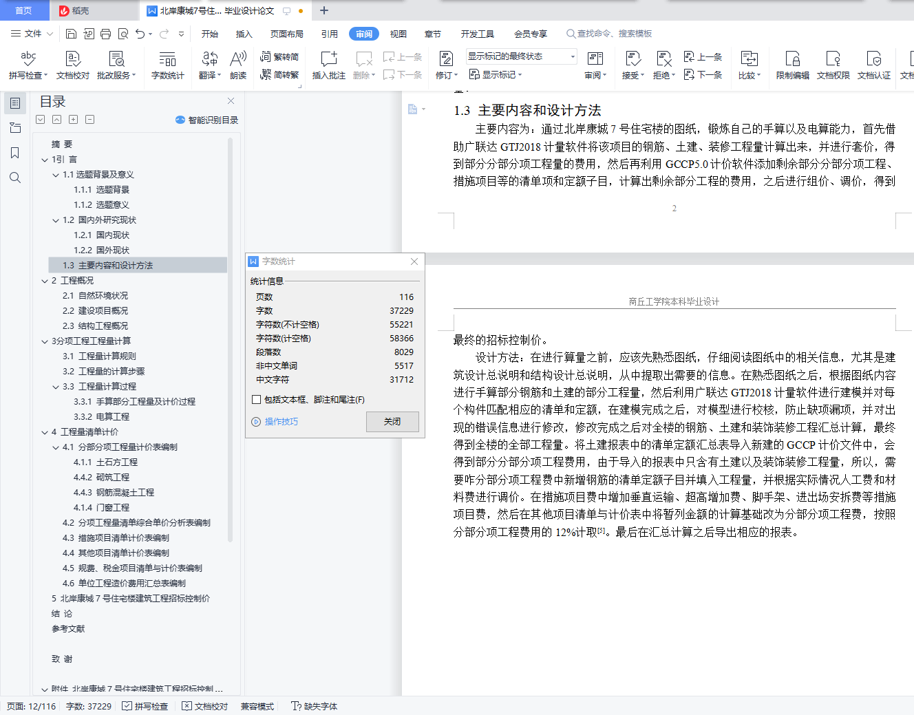 本文是以河南省郑州市北岸康城7号住宅楼的建筑施工图和结构施工图为基础编制的招标控制价,首先运用广联达算量软件对图纸进行建模处理并进行套价,汇总计算后得到详细的工程量清单,然后对工程进行部分结构进行手工算量;最终通过广联达算量软件得出该建筑的钢筋、土建、装饰装修以及部分措施项目费用。将通过广联达算量软件得到的清单定额汇总表导入广联达计价软件中之后,根据当期的市场信息价对人材机费用进行调价并计取措施项目费用等,最终得到该建筑的招标控制价。