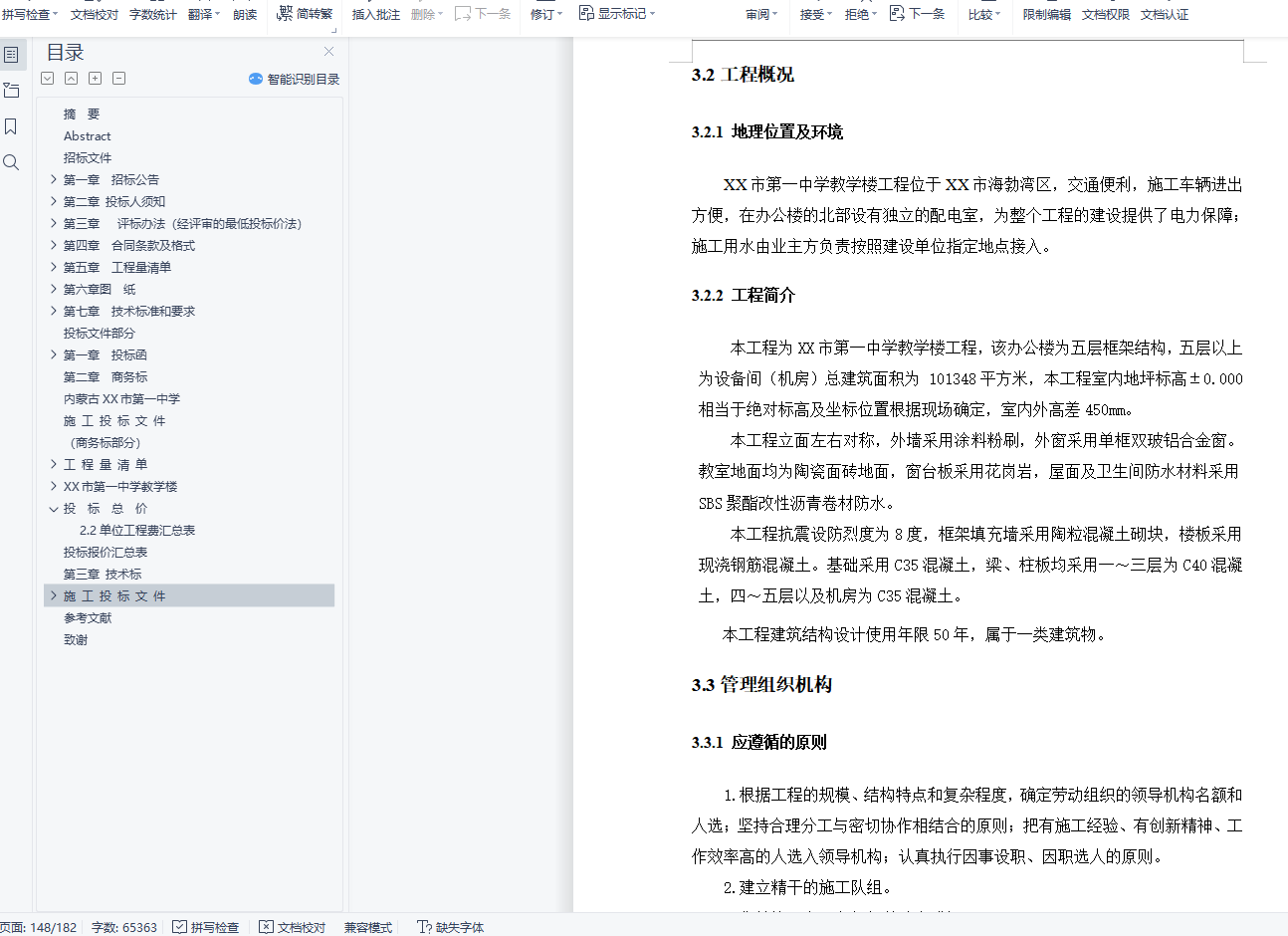 本设计严格按照招投标相关法律法规编制该工程的招标文件与投标文件。本工程为六层框架结构,总建筑面积为101348平方米。招标文件主要包括招标公告、投标须知、评标办法 、合同条款、合同协议书格式、工程量清单、图 纸、工程技术要求和规范、投标文件格式。投标文件是经过认真阅读和分析招标文件编制出来,分为两大部分:商务标部分和技术标部分。商务标由投标函、投标报价和资格审查资料三部分组成,反应工程报价和投标企业的情况。技术标主要内容绘制施工平面布置图、进度计划双代号时标网络图、进度计划横道图对本工程的施工现场及进度进行了全面的管理,保证本工程能够按照要求顺利完成。