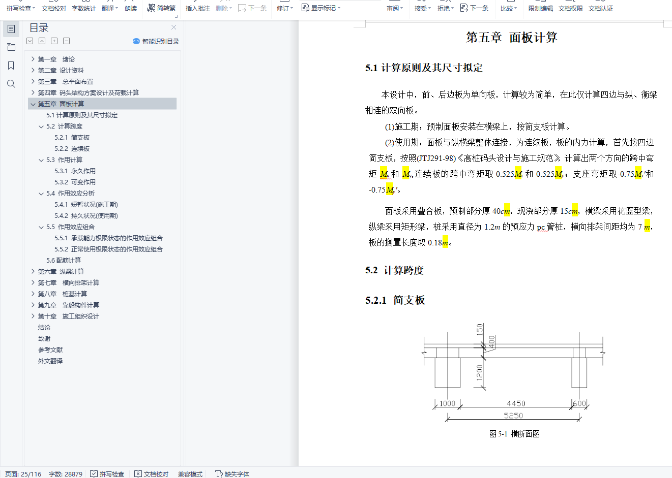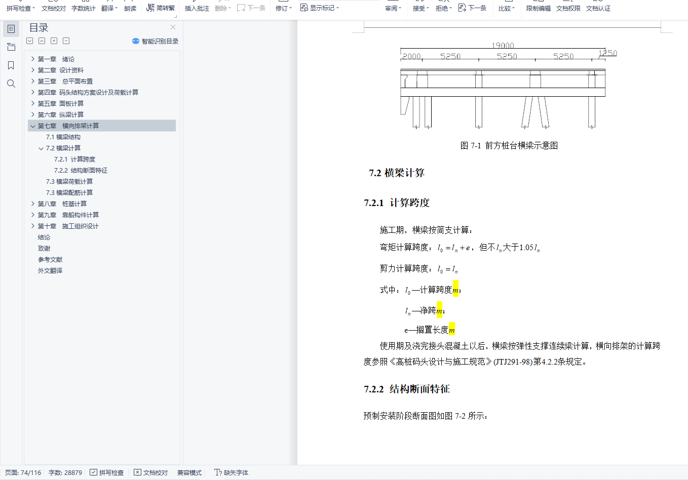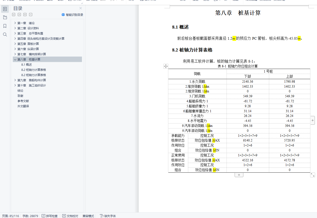 第二、对所承受的荷载以及各构件进行了计算,这部分是本设计的核心内容,包括对面板、纵梁、横向排架、桩基和靠船构件的详细计算,其中横向排架和桩基采用上海易工软件进行了计算。