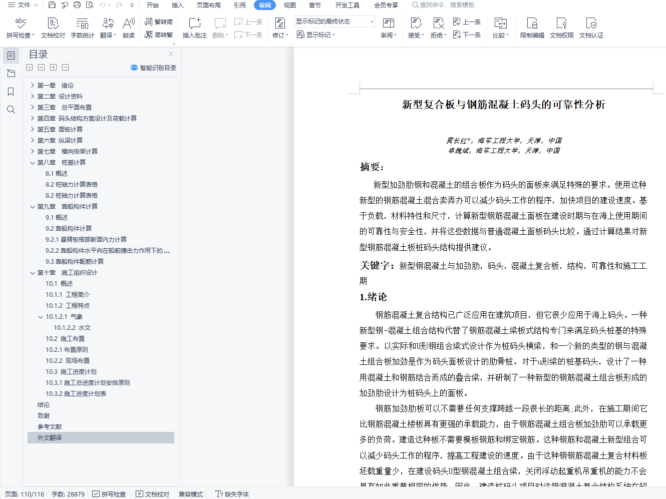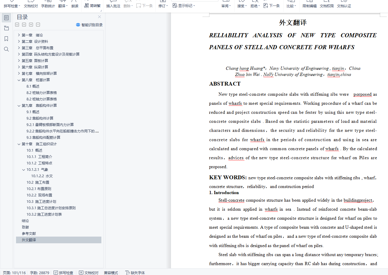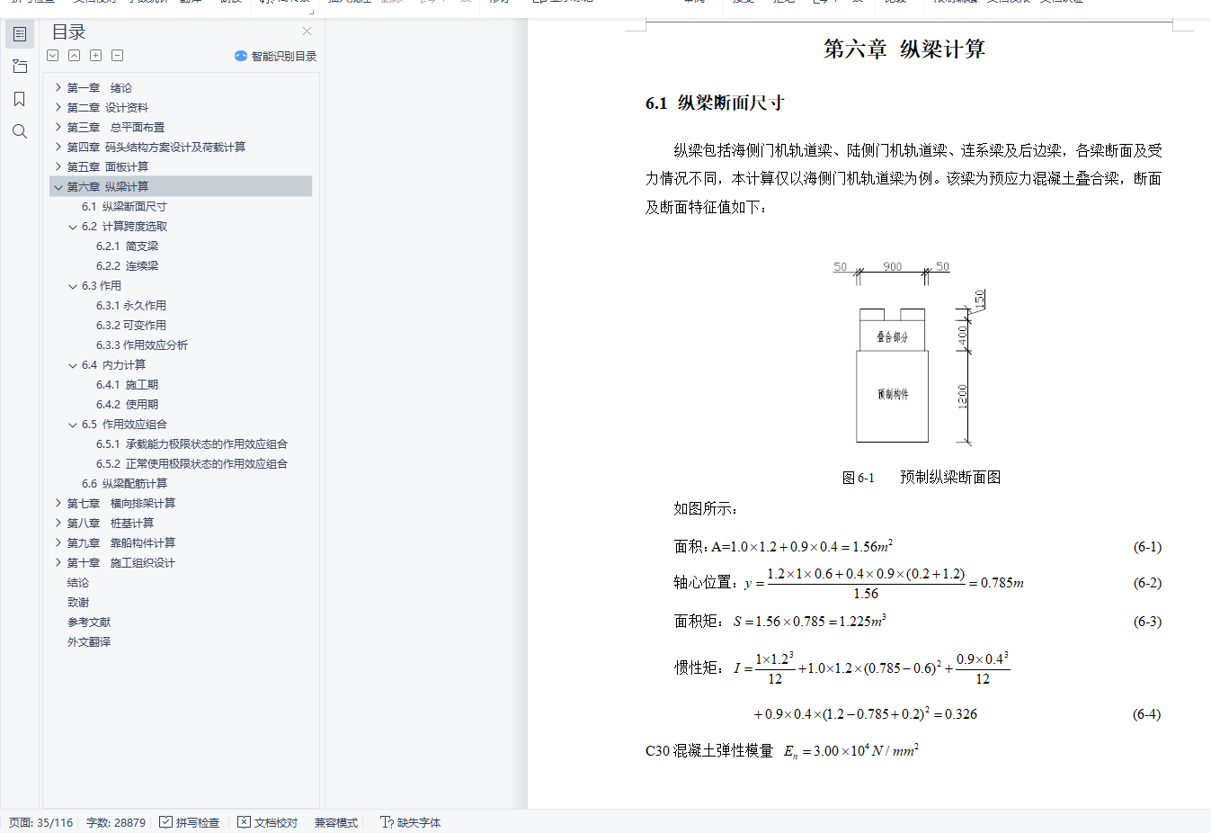 第二、对所承受的荷载以及各构件进行了计算,这部分是本设计的核心内容,包括对面板、纵梁、横向排架、桩基和靠船构件的详细计算,其中横向排架和桩基采用上海易工软件进行了计算。