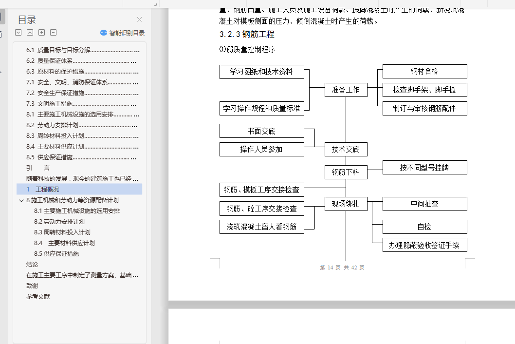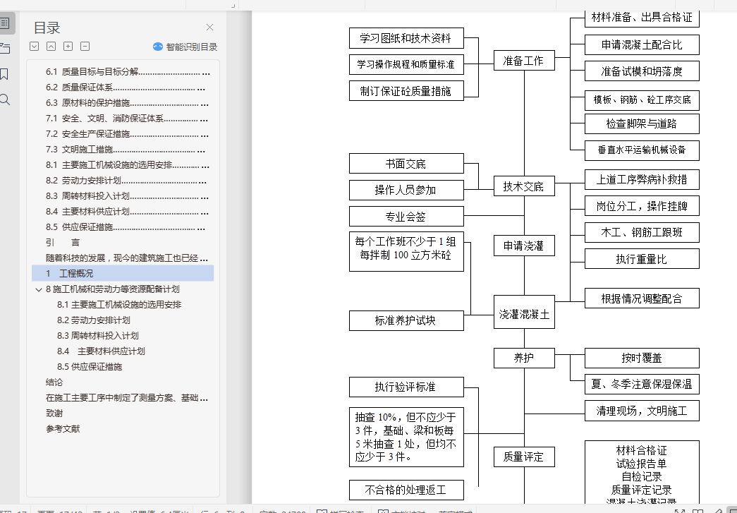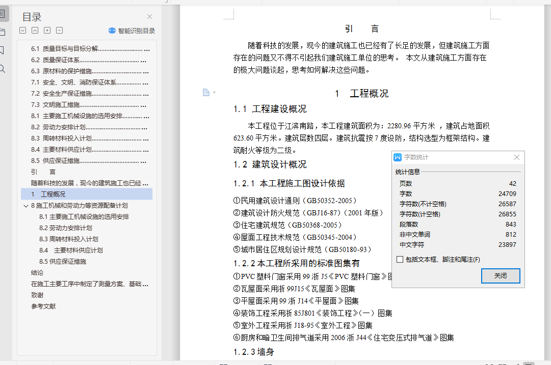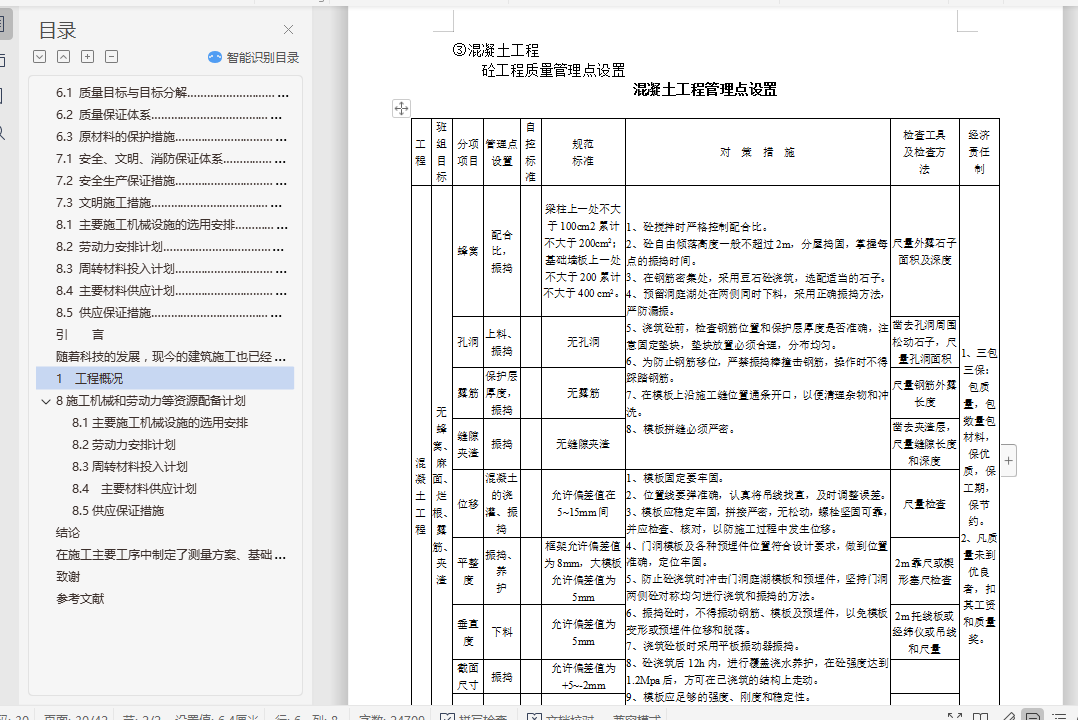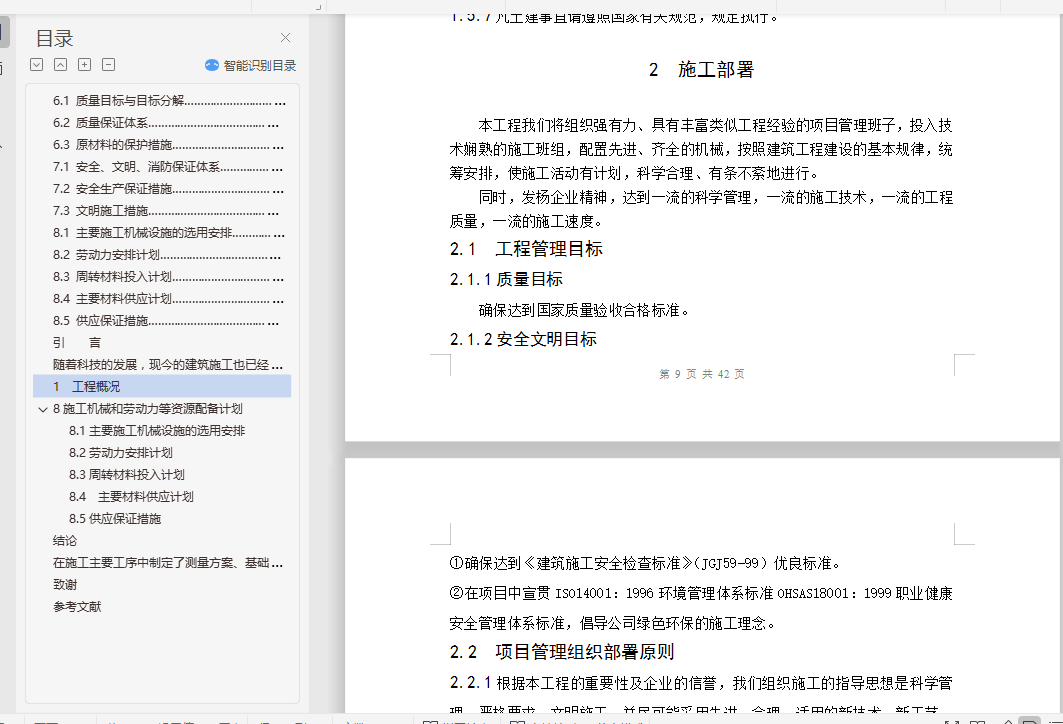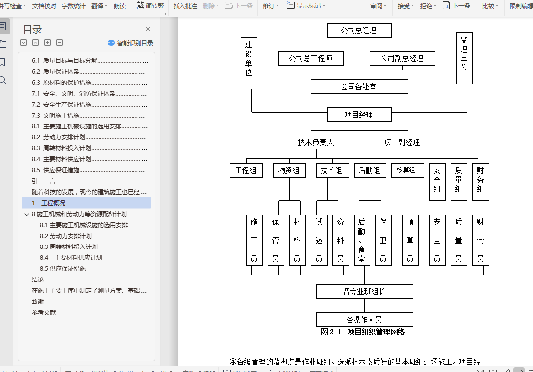 办公楼施工组织设计摘要:近年来,随着改革开放的进一步深入,全国的建筑市场有了长足的发展,无论是数量还是质量都有明显的提高。同时,施工安全事故的发生率也明显下降。现在,施工现场的文明程度较之以往也有了较大的提高。争创安全标准化管理工地、文明工地的数量每年在逐步增加,施工现场安全生产保证体系贯标的工地也越来越多。这些可喜的变化与国家经济的发展、建筑业从业人员综合素质的提高以及行业主管部门管理有效加强是分不开的。但是应该看到,现还有不少的施工现场不同程度地存在着安全隐患,有许多危险源没有真正受控。有人将建筑行业称为日不落的行业,因为有人在的地方就有建筑行业生存的地方,但是建筑施工中经常出现的问题又不得不向我们敲响警钟。我们究竟应当怎样去规范建筑施工行业?这不是我们不得不思考的一个问题。发现问题就要解决问题,那么我们究竟应当如何去处理这些问题呢?关键词:三通一平;室内外高差;建筑标高目 录引言…………………………………………………………………………………51 工程概况………………………………………………………………………51.1 工程建设概况………………………………………………………………51.2 建筑设计概况………………………………………………………………51.3 结构施工说明………………………………………………………………71.4 电气设计施工总说明………………………………………………………91.5 给水设计施工总说明………………………………………………………92 施工部署………………………………………………………………………102.1 工程管理目标………………………………………………………………112.2 项目管理组织部署原则……………………………………………………112.3 现场施工组织与管理………………………………………………………132.4 施工总体顺序与施工段划分………………………………………………132.5 主要施工方法简述…………………………………………………………133 结构工程………………………………………………………………………133.1基础工程……………………………………………………………………133.2主体砼工程…………………………………………………………………133.3 砌体工程……………………………………………………………………204 屋面工程………………………………………………………………………214.1 设计要求……………………………………………………………………214.2 找平层施工…………………………………………………………………214.3 保温层施工…………………………………………………………………224.4 防水卷材施工………………………………………………………………224.5 细石砼防水层施工…………………………………………………………225 装饰工程………………………………………………………………………235.1 装饰工程施工工序…………………………………………………………235.2 内墙与天棚装饰工程………………………………………………………235.3 外墙装饰工程………………………………………………………………265.4 门窗工程……………………………………………………………………276 工程质量保证措施……………………………………………………………286.1 质量目标与目标分解………………………………………………………286.2 质量保证体系………………………………………………………………286.3 原材料的保护措施…………………………………………………………327 安全、文明、环保、消防措施………………………………………………337.1 安全、文明、消防保证体系………………………………………………337.2 安全生产保证措施…………………………………………………………357.3 文明施工措施………………………………………………………………388 施工机械和劳动里资源配备计划……………………………………………398.1 主要施工机械设施的选用安排……………………………………………398.2 劳动力安排计划……………………………………………………………398.3 周转材料投入计划…………………………………………………………418.4 主要材料供应计划…………………………………………………………418.5 供应保证措施………………………………………………………………41结论…………………………………………………………………………………42致谢…………………………………………………………………………………43参考文献……………………………………………………………………………44附录…………………………………………………………………………………45