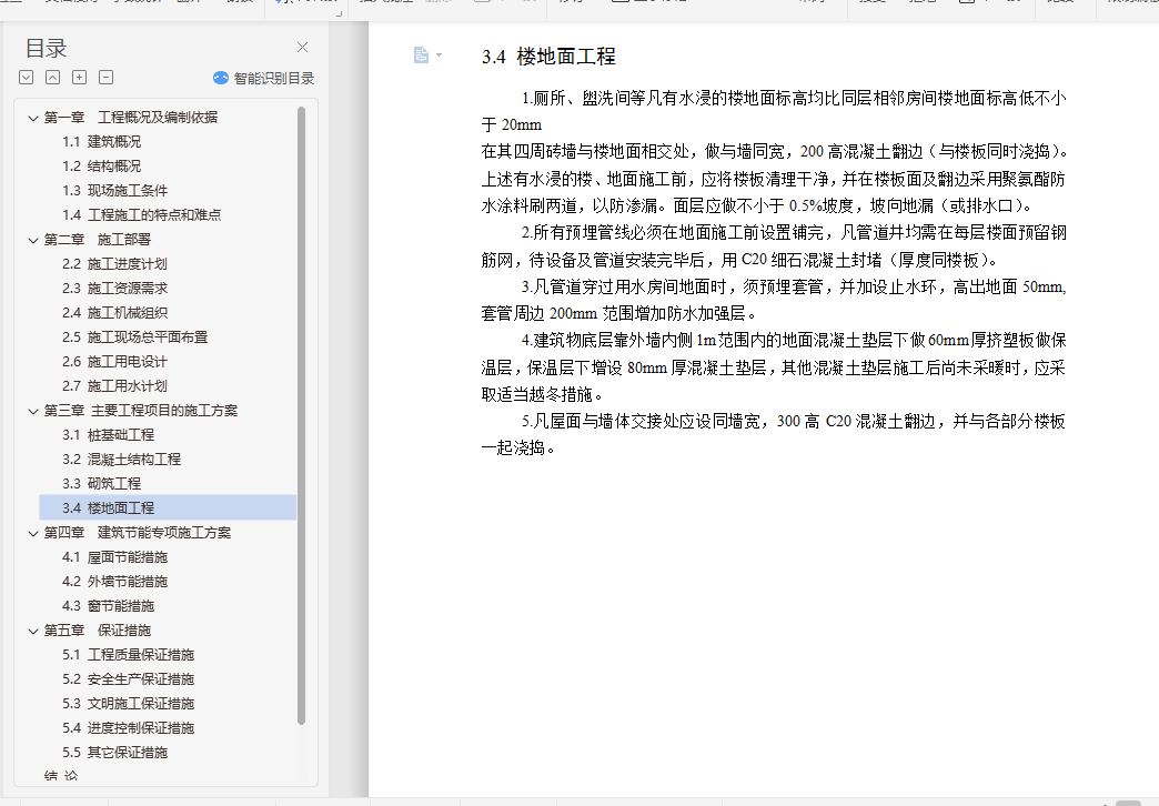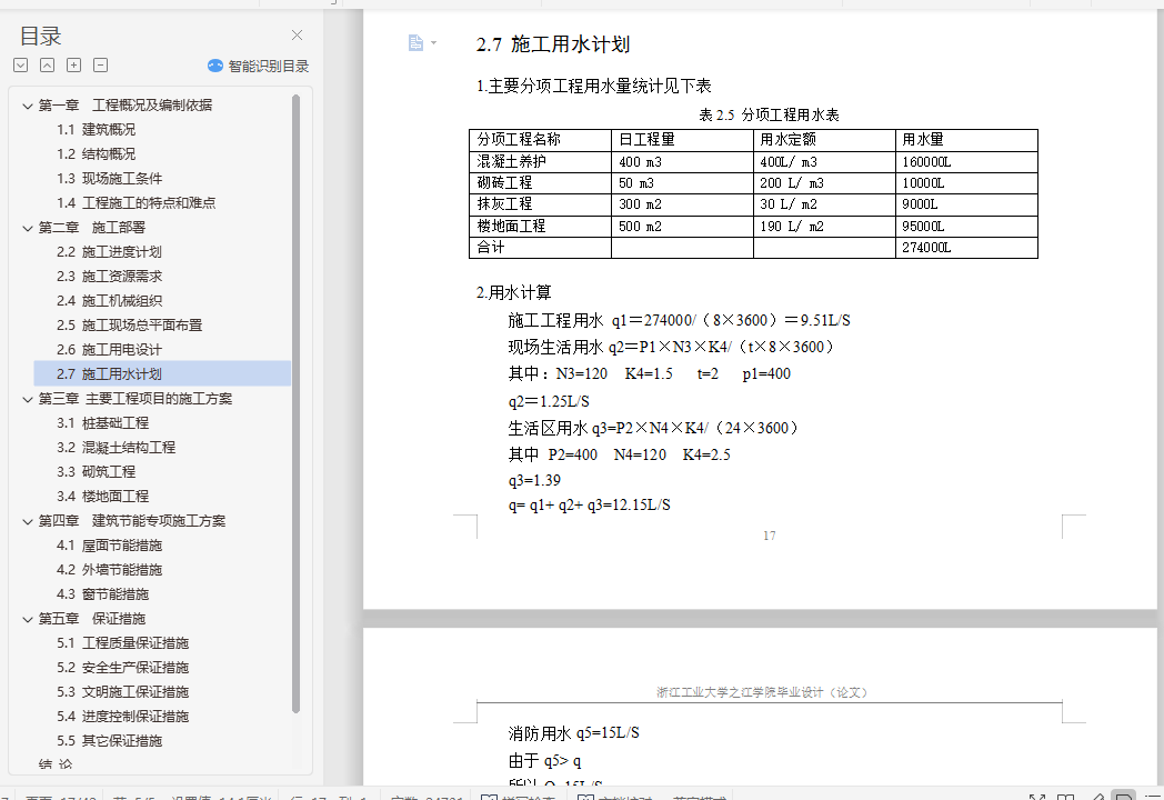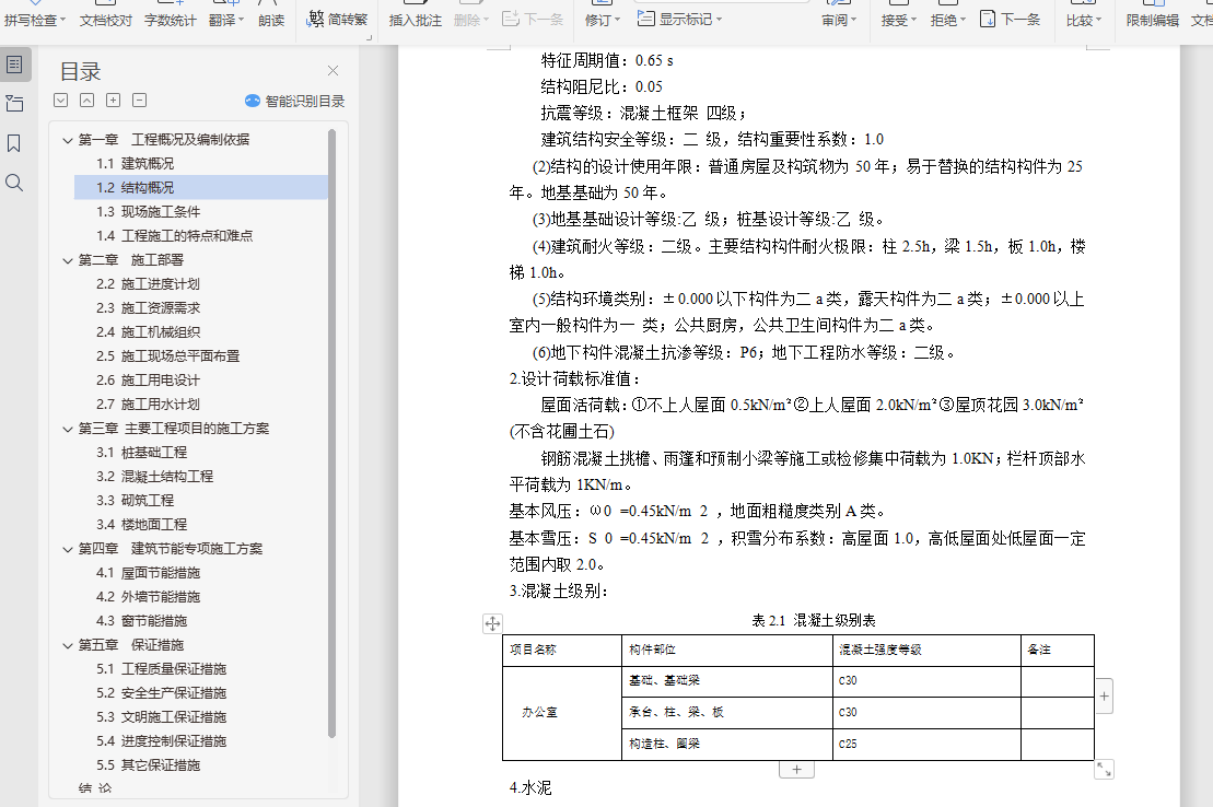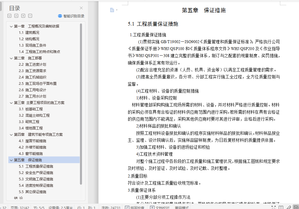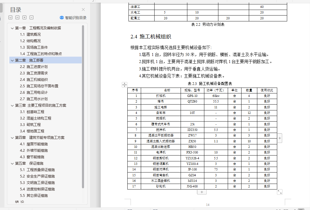 本施工组织设计在工程概况中提出了该工程的特点和难点。在总施工部署中确立了施工现场平面布置的状况,编制了人力资源需求表,机械器具表,施工进度计划。在主要施工项目中详细描述了施工项目的施工方案。在保证措施中,提出了质量管理、安全生产的体系和措施。文明施工方面,在各个细节都建立了方案。在施工进度方面,编制网络计划图,以确保施工进度有效地进行。季节性施工方面也提出了分别应对各项施工的方案和措施。